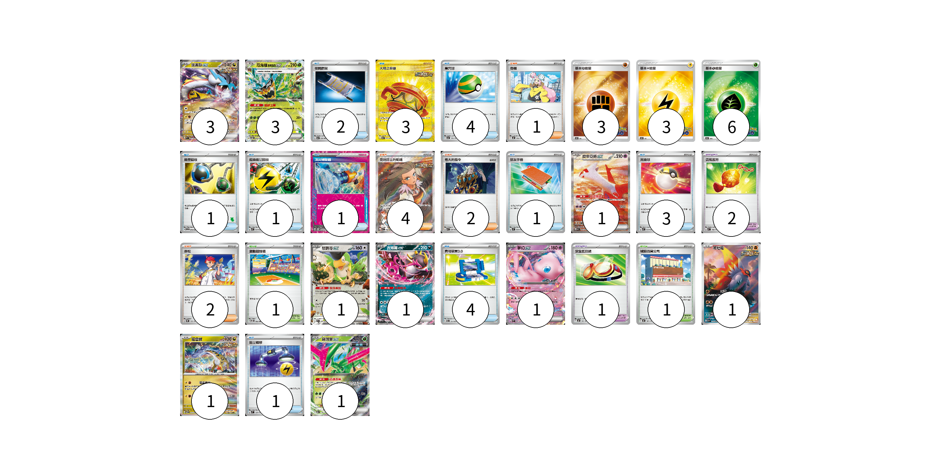 牌組構築方案 以此牌組為基礎新構築牌組 顯示卡面 顯示列表 寶可夢卡(13) 3 3 1 1 1 1 1 1 1 寶可夢道具(3) 2 1 物品卡(21) 2 3 4 1 1 1 1 3 4 1 支援者卡(9) 1 4 2 2 競技場卡(2) 1 1 能量卡(12) 3 3 6 寶可夢卡(13) 卡牌名稱 張數 卡牌名稱 張數 猛雷鼓ex SV5K 053/071 03 厄鬼椪 碧草面具ex SV6 016/101 03 拉帝亞斯ex SV7a 087/064 01 怒鸚哥ex SVK 006/042 01 吉雉雞ex SV6a 038/064 01 夢幻ex SVK 001/042 01 爬地翅 SV4K 074/066 01 猛雷鼓 SV7 075/102 01 鐵斑葉ex SV8a 016/187 01 寶可夢道具(3) 卡牌名稱 張數 卡牌名稱 張數 勇氣護符 SVM 142/175 02 安全護目鏡 SV2a 157/165 01 物品卡(21) 卡牌名稱 張數 卡牌名稱 張數 夜間擔架 SV6a 056/064 02 大地之容器 SV6a 093/064 03 巢穴球 SV4a 159/190 04 能量回收 SVI 049/066 01 超級能量回收 SVK 010/042 01 頂尖捕捉器 SV5M 062/071 01 朋友手冊 SV1S 069/078 01 高級球 SVK 018/042 03 寶可裝置3.0 SVEL 014/020 04 能量轉移 SVM 127/175 01 支援者卡(9) 卡牌名稱 張數 卡牌名稱 張數 奇樹 SV4a 174/190 01 奧琳博士的氣魄 SV4K 085/066 04 老大的指令 SVK 036/042 02 赤松 SV8a 163/187 02 競技場卡(2) 卡牌名稱 張數 卡牌名稱 張數 激動競技場 SV8 105/106 01 城鎮百貨公司 SV4a 183/190 01 能量卡(12) 卡牌名稱 張數 卡牌名稱 張數 基本鬥能量 S10b FIG 03 基本雷能量 S10b LIG 03 基本草能量 S10b GRA 06 以此牌組為基礎新構築牌組 牌組編碼 gqgYgq-icdzLU-OHuBRE copy 列印牌組單 牌組編碼已複製 分享至SNS