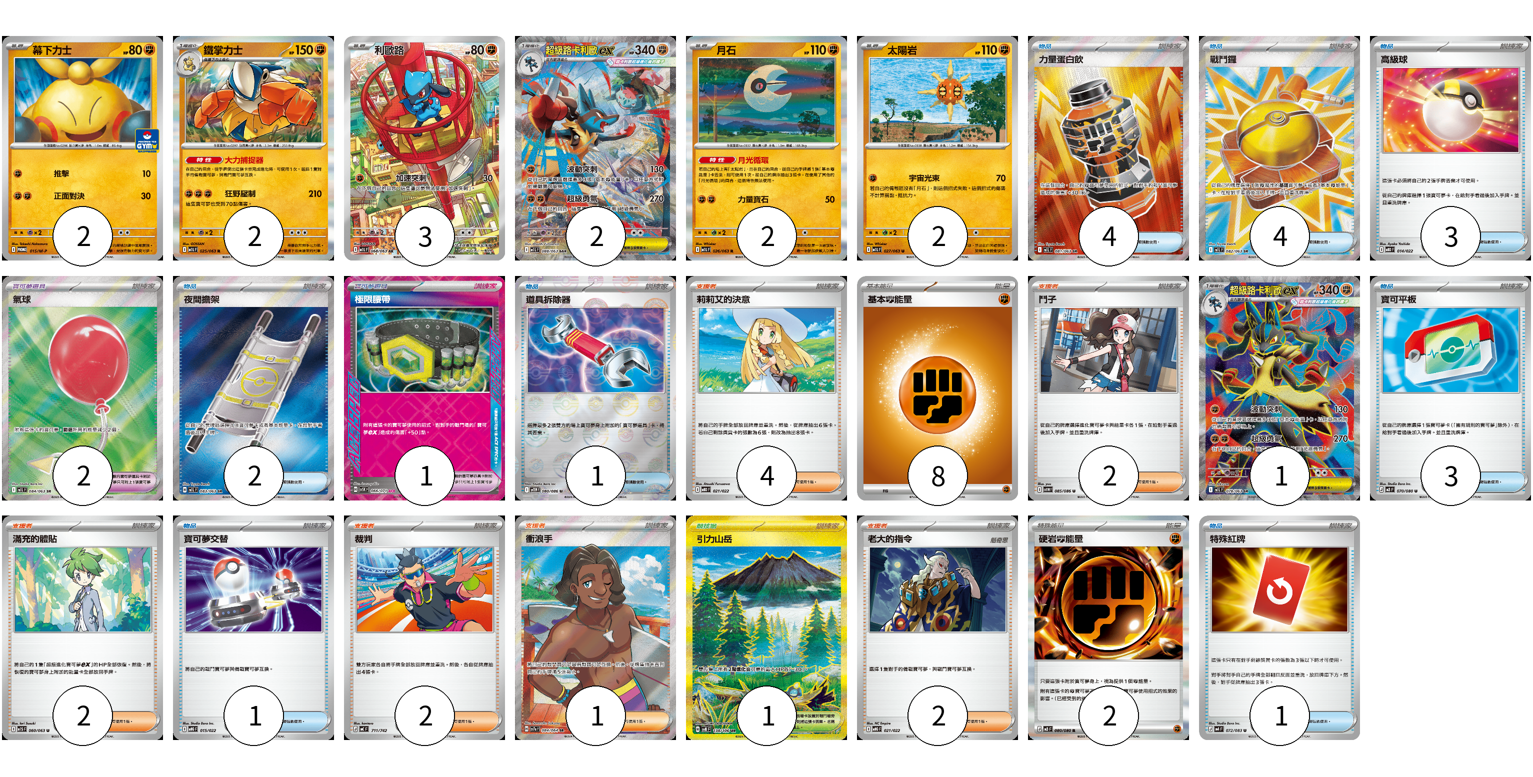 牌組構築方案 以此牌組為基礎新構築牌組 顯示卡面 顯示列表 寶可夢卡(14) 2 2 3 2 2 2 1 寶可夢道具(3) 2 1 物品卡(19) 4 4 3 2 1 3 1 1 支援者卡(13) 4 2 2 2 1 2 競技場卡(1) 1 能量卡(10) 8 2 寶可夢卡(14) 卡牌名稱 張數 卡牌名稱 張數 幕下力士 M-P 015/M-P 02 鐵掌力士 M1L 025/063 02 利歐路 M1L 068/063 03 超級路卡利歐ex M1L 088/063 02 月石 M1L 026/063 02 太陽岩 M1L 027/063 02 超級路卡利歐ex M1L 078/063 01 寶可夢道具(3) 卡牌名稱 張數 卡牌名稱 張數 氣球 M1L 084/063 02 極限腰帶 SV5K 066/071 01 物品卡(19) 卡牌名稱 張數 卡牌名稱 張數 力量蛋白飲 M1L 081/063 04 戰鬥鑼 M1L 082/063 04 高級球 MBD 014/022 03 夜間擔架 M1L 083/063 02 道具拆除器 SV11W 080/086 01 寶可平板 M3 070/080 03 寶可夢交替 MBG 015/022 01 特殊紅牌 M4 072/083 01 支援者卡(13) 卡牌名稱 張數 卡牌名稱 張數 莉莉艾的決意 MBD 021/022 04 鬥子 SV11W 085/086 02 滿充的體貼 M1S 060/063 02 裁判 MC 711/742 02 衝浪手 SV7a 084/064 01 老大的指令 MBG 021/022 02 競技場卡(1) 卡牌名稱 張數 卡牌名稱 張數 引力山岳 SV8 138/106 01 能量卡(10) 卡牌名稱 張數 卡牌名稱 張數 基本【鬥】能量 M-P FIG 08 硬岩【鬥】能量 M3 080/080 02 以此牌組為基礎新構築牌組 牌組編碼 grviir-hrHJFx-MvRGIq copy 列印牌組單 牌組編碼已複製 分享至SNS