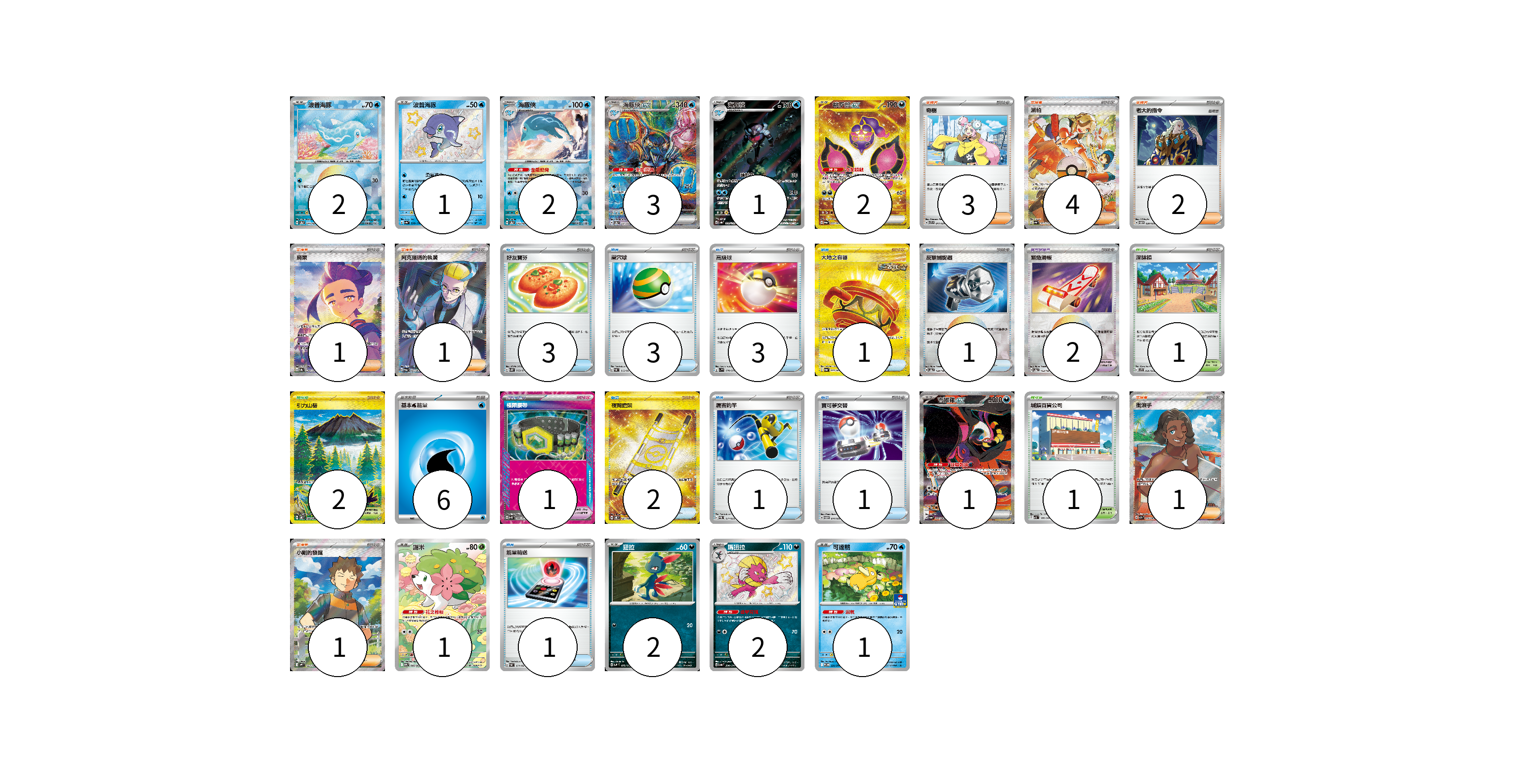 牌組構築方案 以此牌組為基礎新構築牌組 顯示卡面 顯示列表 寶可夢卡(18) 2 1 2 3 1 2 1 1 2 2 1 寶可夢道具(3) 2 1 物品卡(16) 3 3 3 1 1 2 1 1 1 支援者卡(13) 3 4 2 1 1 1 1 競技場卡(4) 1 2 1 能量卡(6) 6 寶可夢卡(18) 卡牌名稱 張數 卡牌名稱 張數 波普海豚 SV8a 044/187 02 波普海豚 SV4a 228/190 01 海豚俠 SV8a 045/187 02 海豚俠ex SV8a 207/187 03 海豚俠 SV4a 339/190 01 桃歹郎ex SV6a 092/064 02 吉雉雞ex SV6a 089/064 01 謝米 SV9a 066/063 01 狃拉 SVM 075/175 02 瑪狃拉 SV4a 290/190 02 可達鴨 SV-P 220/SV-P 01 寶可夢道具(3) 卡牌名稱 張數 卡牌名稱 張數 緊急滑板 SV8a 153/187 02 極限腰帶 SV5K 066/071 01 物品卡(16) 卡牌名稱 張數 卡牌名稱 張數 好友寶芬 SV5K 063/071 03 巢穴球 SVAL 012/021 03 高級球 SV1V 070/078 03 大地之容器 SV6a 093/064 01 反擊捕捉器 SV8a 139/187 01 夜間擔架 SV8 137/106 02 厲害釣竿 SVEM 011/020 01 寶可夢交替 SVTM 014/022 01 能量輸送 SVAL 011/021 01 支援者卡(13) 卡牌名稱 張數 卡牌名稱 張數 奇樹 SVTR 017/021 03 派帕 SV4a 353/190 04 老大的指令 SVTM 020/022 02 烏栗 SV8a 230/187 01 阿克羅瑪的執著 SV6a 083/064 01 衝浪手 SV7a 084/064 01 小剛的發掘 SV9 123/100 01 競技場卡(4) 卡牌名稱 張數 卡牌名稱 張數 深缽鎮 SVF 036/038 01 引力山岳 SV8 138/106 02 城鎮百貨公司 SV3 107/108 01 能量卡(6) 卡牌名稱 張數 卡牌名稱 張數 基本【水】能量 SVF WAT 06 以此牌組為基礎新構築牌組 牌組編碼 gvGKhB-XGBFlU-NACcKZ copy 列印牌組單 牌組編碼已複製 分享至SNS