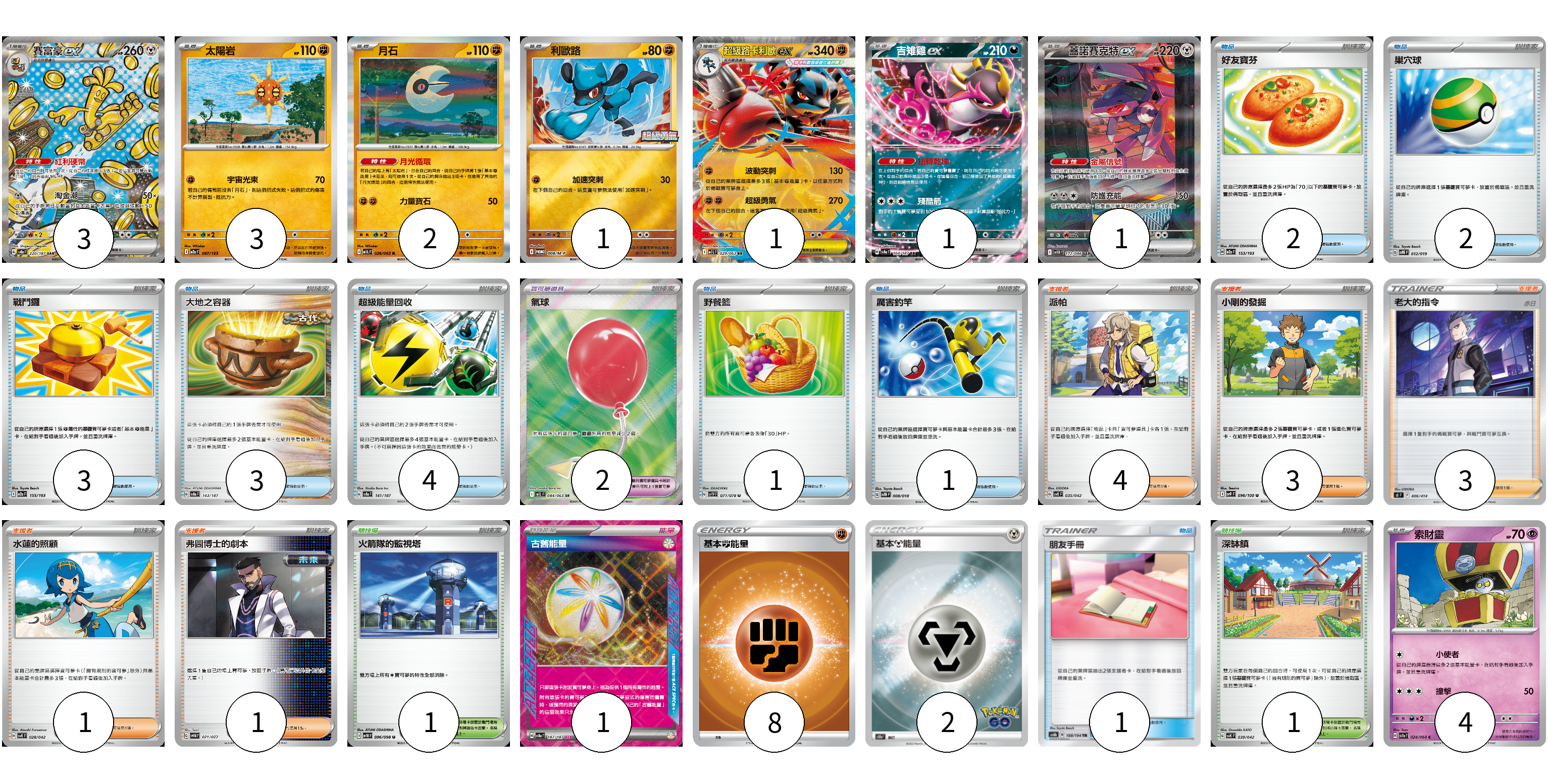 牌組構築方案 以此牌組為基礎新構築牌組 顯示卡面 顯示列表 寶可夢卡(16) 3 3 2 1 1 1 1 4 寶可夢道具(2) 2 物品卡(17) 2 2 3 3 4 1 1 1 支援者卡(12) 4 3 3 1 1 競技場卡(2) 1 1 能量卡(11) 1 8 2 寶可夢卡(16) 卡牌名稱 張數 卡牌名稱 張數 賽富豪ex SV8a 220/187 03 太陽岩 M2a 087/193 03 月石 M1L 026/063 02 利歐路 M-P 008/M-P 01 超級路卡利歐ex M1L 029/063 01 吉雉雞ex SV8a 104/187 01 蓋諾賽克特ex SV11B 172/086 01 索財靈 SV7a 024/064 04 寶可夢道具(2) 卡牌名稱 張數 卡牌名稱 張數 氣球 M1L 084/063 02 物品卡(17) 卡牌名稱 張數 卡牌名稱 張數 好友寶芬 M2a 153/193 02 巢穴球 SVTG 012/019 02 戰鬥鑼 M2a 155/193 03 大地之容器 SV8a 143/187 03 超級能量回收 SV8a 141/187 04 野餐籃 SV1V 071/078 01 厲害釣竿 SVTH 008/018 01 朋友手冊 AS6b 188/194 01 支援者卡(12) 卡牌名稱 張數 卡牌名稱 張數 派帕 SVK 035/042 04 小剛的發掘 SV9 096/100 03 老大的指令(赤日) SI 406/414 03 水蓮的照顧 SVK 028/042 01 弗圖博士的劇本 SVHM 021/022 01 競技場卡(2) 卡牌名稱 張數 卡牌名稱 張數 火箭隊的監視塔 SV10 096/098 01 深缽鎮 SVK 039/042 01 能量卡(11) 卡牌名稱 張數 卡牌名稱 張數 古舊能量 SV8a 187/187 01 基本鬥能量 SLL FIG 08 基本鋼能量 S10b MET 02 以此牌組為基礎新構築牌組 牌組編碼 gxCehD-wkvCgu-XZRORD copy 列印牌組單 牌組編碼已複製 分享至SNS