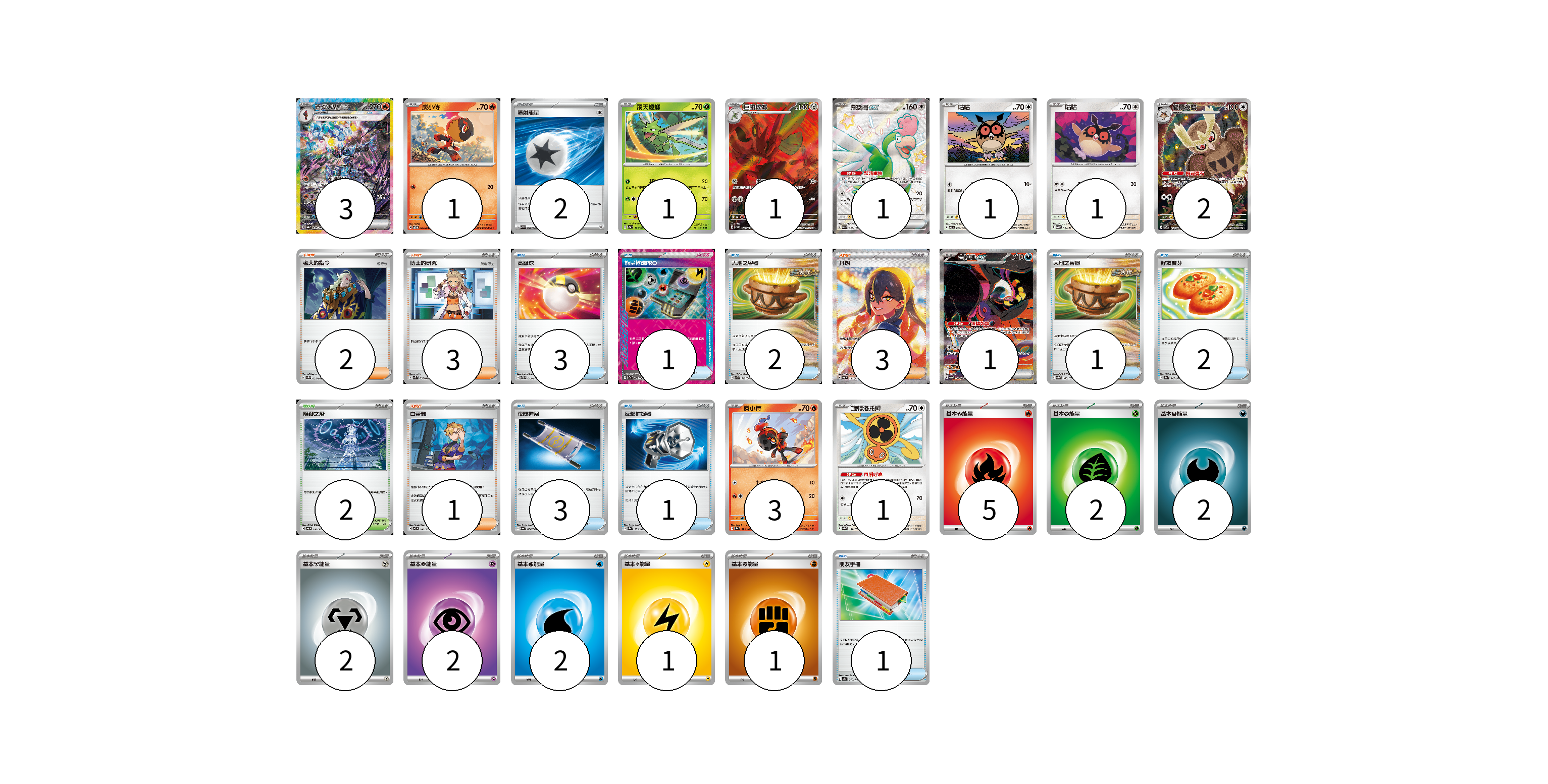 牌組構築方案 以此牌組為基礎新構築牌組 顯示卡面 顯示列表 寶可夢卡(16) 3 1 1 1 1 1 1 2 1 3 1 物品卡(14) 3 1 2 1 2 3 1 1 支援者卡(9) 2 3 3 1 競技場卡(2) 2 能量卡(19) 2 5 2 2 2 2 2 1 1 寶可夢卡(16) 卡牌名稱 張數 卡牌名稱 張數 蒼炎刃鬼ex SV8a 203/187 03 炭小侍 SVPS 005/008 01 飛天螳螂 SV2a 123/165 01 巨鉗螳螂 SV3 116/108 01 怒鸚哥ex SV4a 337/190 01 咕咕 SV7 076/102 01 咕咕 SV5K 054/071 01 貓頭夜鷹 SV7 114/102 02 吉雉雞ex SV6a 089/064 01 炭小侍 SV8a 023/187 03 旋轉洛托姆 SV8a 131/187 01 物品卡(14) 卡牌名稱 張數 卡牌名稱 張數 高級球 SVTG 013/019 03 能量輸送PRO SV7a 052/064 01 大地之容器 SVK 012/042 02 大地之容器 SV8a 143/187 01 好友寶芬 SV8a 147/187 02 夜間擔架 SV6a 056/064 03 反擊捕捉器 SV8a 139/187 01 朋友手冊 SV1S 069/078 01 支援者卡(9) 卡牌名稱 張數 卡牌名稱 張數 老大的指令 SVF 032/038 02 博士的研究 SVK 032/042 03 丹瑜 SV6 130/101 03 白蕾雅 SV7 100/102 01 競技場卡(2) 卡牌名稱 張數 卡牌名稱 張數 阻礙之塔 SV6 100/101 02 能量卡(19) 卡牌名稱 張數 卡牌名稱 張數 噴射能量 SVK 040/042 02 基本【火】能量 SVAL FIR 05 基本【草】能量 SVB GRA 02 基本【惡】能量 SVB DAR 02 基本【鋼】能量 SVB MET 02 基本【超】能量 SVB PSY 02 基本【水】能量 SVB WAT 02 基本【雷】能量 SVAL LIG 01 基本【鬥】能量 SVB FIG 01 以此牌組為基礎新構築牌組 牌組編碼 gycgwQ-yGSRjp-IurVqr copy 列印牌組單 牌組編碼已複製 分享至SNS