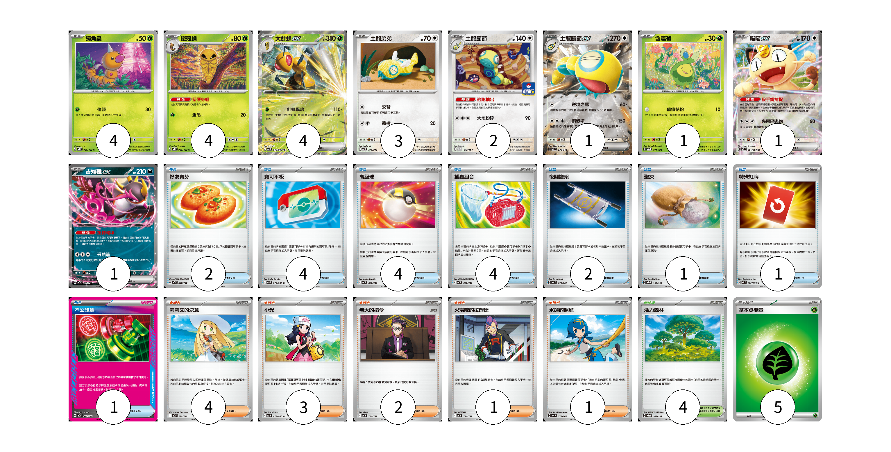 牌組構築方案 以此牌組為基礎新構築牌組 顯示卡面 顯示列表 寶可夢卡(21) 4 4 4 3 2 1 1 1 1 物品卡(19) 2 4 4 4 2 1 1 1 支援者卡(11) 4 3 2 1 1 競技場卡(4) 4 能量卡(5) 5 寶可夢卡(21) 卡牌名稱 張數 卡牌名稱 張數 獨角蟲 M4 001/083 04 鐵殼蛹 M4 002/083 04 大針蜂ex M4 003/083 04 土龍弟弟 MC 574/742 03 土龍節節 M-P 045/M-P 02 土龍節節ex MC 575/742 01 含羞苞 M2a 011/193 01 喵喵ex M3 061/080 01 吉雉雞ex MC 489/742 01 物品卡(19) 卡牌名稱 張數 卡牌名稱 張數 好友寶芬 MC 648/742 02 寶可平板 M3 070/080 04 高級球 MC 651/742 04 捕蟲組合 MC 667/742 04 夜間擔架 MC 670/742 02 聖灰 M2a 150/193 01 特殊紅牌 M4 072/083 01 不公印章 MC 633/742 01 支援者卡(11) 卡牌名稱 張數 卡牌名稱 張數 莉莉艾的決意 MC 729/742 04 小光 M2 077/080 03 老大的指令 MC 724/742 02 火箭隊的拉姆達 MC 734/742 01 水蓮的照顧 MC 712/742 01 競技場卡(4) 卡牌名稱 張數 卡牌名稱 張數 活力森林 M2a 182/193 04 能量卡(5) 卡牌名稱 張數 卡牌名稱 張數 基本【草】能量 MJ GRA 05 以此牌組為基礎新構築牌組 牌組編碼 gzXkIH-tDNvRg-LaeaTK copy 列印牌組單 牌組編碼已複製 分享至SNS