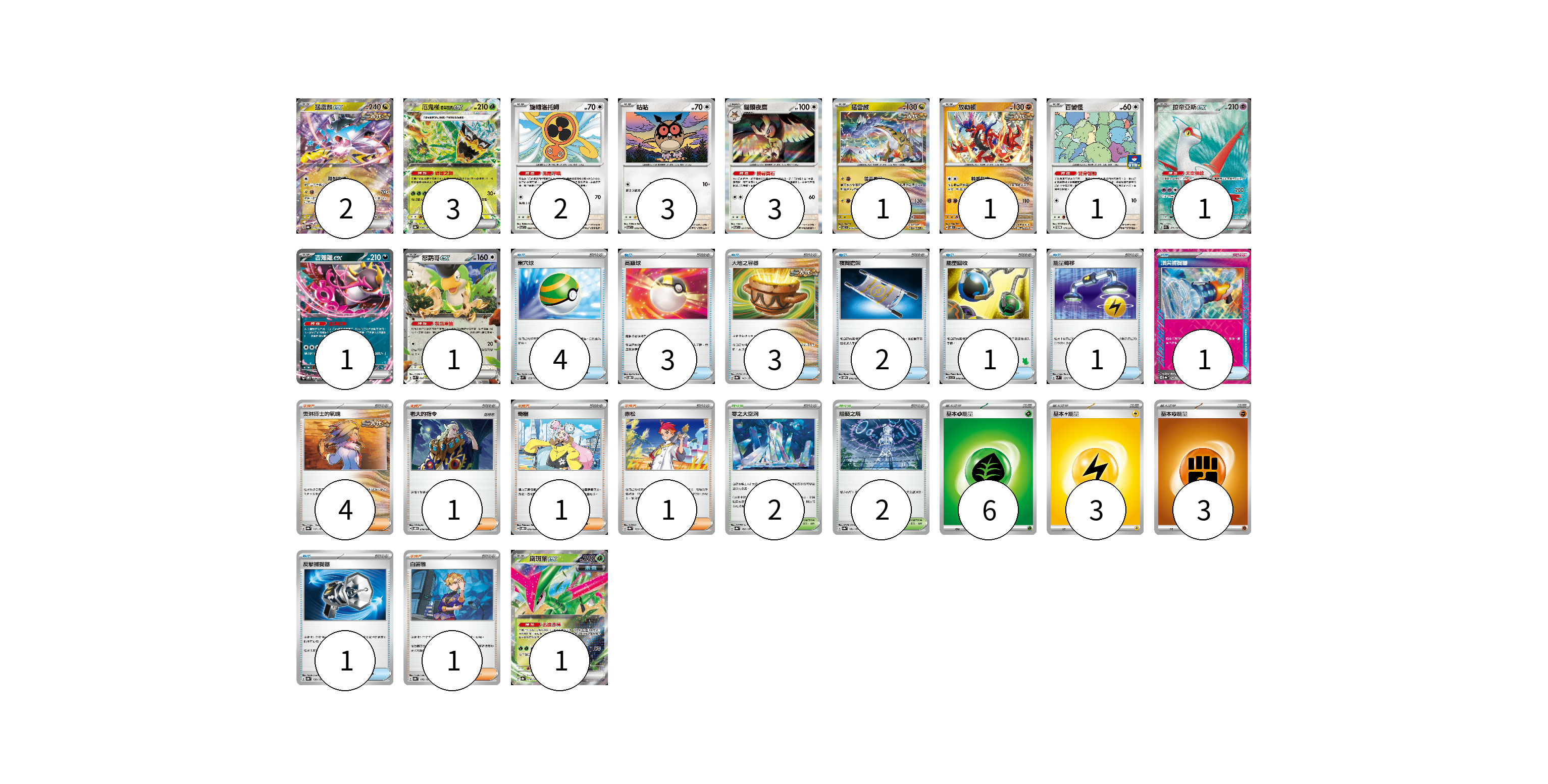 牌組構築方案 以此牌組為基礎新構築牌組 顯示卡面 顯示列表 寶可夢卡(20) 2 3 2 3 3 1 1 1 1 1 1 1 物品卡(16) 4 3 3 2 1 1 1 1 支援者卡(8) 4 1 1 1 1 競技場卡(4) 2 2 能量卡(12) 6 3 3 寶可夢卡(20) 卡牌名稱 張數 卡牌名稱 張數 猛雷鼓ex SV8a 124/187 02 厄鬼椪 碧草面具ex SV8a 020/187 03 旋轉洛托姆 SV7 080/102 02 咕咕 SV7 076/102 03 貓頭夜鷹 SV7 077/102 03 猛雷鼓 SV7 075/102 01 故勒頓 SV8 069/106 01 百變怪 SV-P 111/SV-P 01 拉帝亞斯ex SV7a 078/064 01 吉雉雞ex SVOM 009/021 01 怒鸚哥ex SVK 006/042 01 鐵斑葉ex SV8a 016/187 01 物品卡(16) 卡牌名稱 張數 卡牌名稱 張數 巢穴球 SVM 133/175 04 高級球 SVOD 012/020 03 大地之容器 SV8a 143/187 03 夜間擔架 SVOM 016/021 02 能量回收 SVI 049/066 01 能量轉移 SVM 127/175 01 頂尖捕捉器 SV8a 148/187 01 反擊捕捉器 SV8a 139/187 01 支援者卡(8) 卡牌名稱 張數 卡牌名稱 張數 奧琳博士的氣魄 SV8a 167/187 04 老大的指令 SVOD 019/020 01 奇樹 SVOD 016/020 01 赤松 SV8a 163/187 01 白蕾雅 SV8a 176/187 01 競技場卡(4) 卡牌名稱 張數 卡牌名稱 張數 零之大空洞 SV8a 182/187 02 阻礙之塔 SV8a 181/187 02 能量卡(12) 卡牌名稱 張數 卡牌名稱 張數 基本草能量 sv-p GRA 06 基本雷能量 sv-p LIG 03 基本鬥能量 sv-p FIG 03 以此牌組為基礎新構築牌組 牌組編碼 hAatSp-JylhdT-GNVOxg copy 列印牌組單 牌組編碼已複製 分享至SNS
