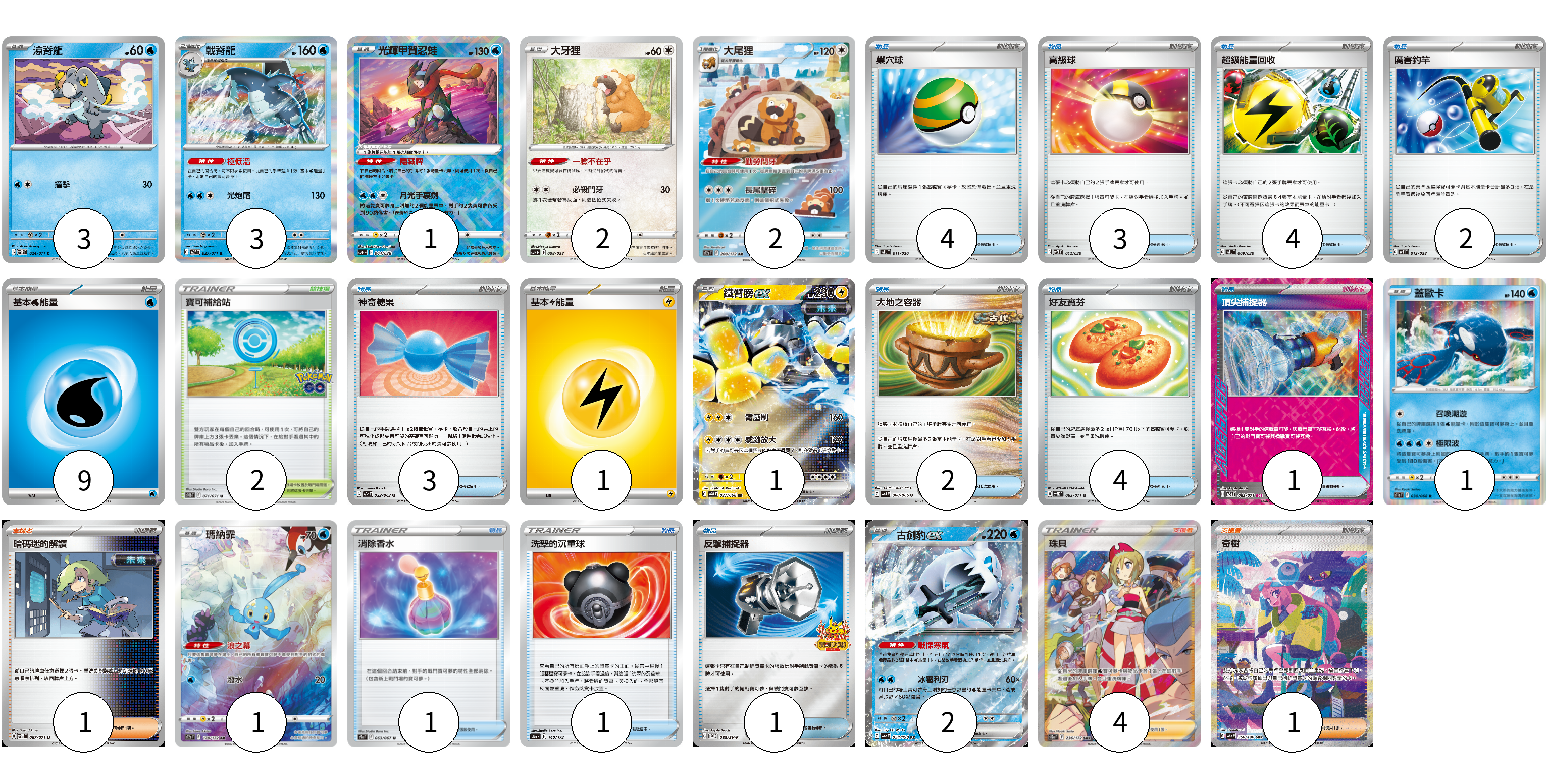 牌組構築方案 以此牌組為基礎新構築牌組 顯示卡面 顯示列表 寶可夢卡(16) 3 3 1 2 2 1 1 1 2 物品卡(26) 4 3 4 2 3 2 4 1 1 1 1 支援者卡(6) 1 4 1 競技場卡(2) 2 能量卡(10) 9 1 寶可夢卡(16) 卡牌名稱 張數 卡牌名稱 張數 涼脊龍 SV2P 024/071 03 戟脊龍 SV2P 027/071 03 光輝甲賀忍蛙 SVF 004/038 01 大牙狸 SVF 008/038 02 大尾狸 S12a 200/172 02 鐵臂膀ex SV4M 027/066 01 蓋歐卡 S11a 030/068 01 瑪納霏 S12a 178/172 01 古劍豹ex SV4a 054/190 02 物品卡(26) 卡牌名稱 張數 卡牌名稱 張數 巢穴球 SVEL 011/020 04 高級球 SVEL 012/020 03 超級能量回收 SVEL 009/020 04 厲害釣竿 SVF 013/038 02 神奇糖果 SV3a 053/062 03 大地之容器 SV4K 060/066 02 好友寶芬 SV5K 063/071 04 頂尖捕捉器 SV5M 062/071 01 消除香水 S9a 063/067 01 洗翠的沉重球 S12a 140/172 01 反擊捕捉器 SV-P 083/SV-P 01 支援者卡(6) 卡牌名稱 張數 卡牌名稱 張數 暗碼迷的解讀 SV5M 067/071 01 珠貝 S12a 236/172 04 奇樹 SV4a 350/190 01 競技場卡(2) 卡牌名稱 張數 卡牌名稱 張數 寶可補給站 S10b 071/071 02 能量卡(10) 卡牌名稱 張數 卡牌名稱 張數 基本水能量 sv-p WAT 09 基本【雷】能量 SVF LIG 01 以此牌組為基礎新構築牌組 牌組編碼 hBLmIm-WIslRG-fNIvtf copy 列印牌組單 牌組編碼已複製 分享至SNS