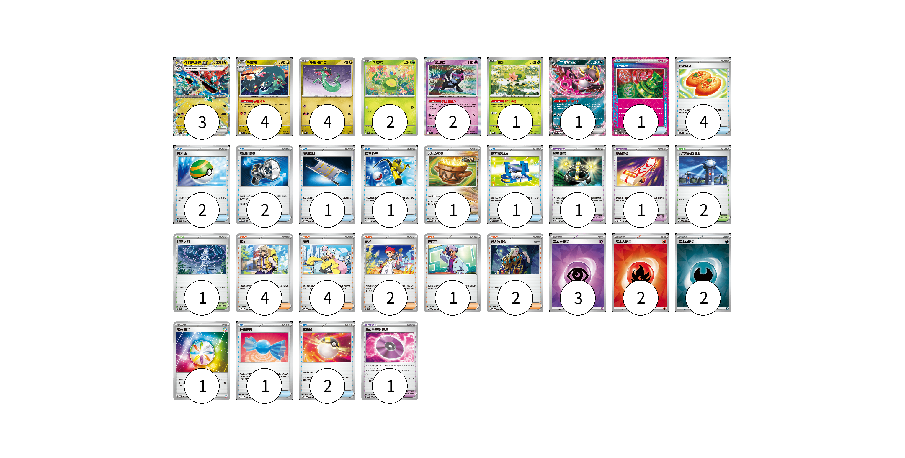 牌組構築方案 以此牌組為基礎新構築牌組 顯示卡面 顯示列表 寶可夢卡(17) 3 4 4 2 2 1 1 寶可夢道具(3) 1 1 1 物品卡(16) 1 4 2 2 1 1 1 1 1 2 支援者卡(13) 4 4 2 1 2 競技場卡(3) 2 1 能量卡(8) 3 2 2 1 寶可夢卡(17) 卡牌名稱 張數 卡牌名稱 張數 多龍巴魯托ex SV6 081/101 03 多龍奇 SV6 080/101 04 多龍梅西亞 SV8a 118/187 04 含羞苞 SV8a 001/187 02 願增猿 SV6 055/101 02 謝米 SV9a 006/063 01 吉雉雞ex SV8a 104/187 01 寶可夢道具(3) 卡牌名稱 張數 卡牌名稱 張數 學習裝置 SVTM 016/022 01 緊急滑板 SVOD 015/020 01 招式學習器 衰退 SV8a 161/187 01 物品卡(16) 卡牌名稱 張數 卡牌名稱 張數 不公印章 SV5a 053/066 01 好友寶芬 SVOD 011/020 04 巢穴球 SVM 133/175 02 反擊捕捉器 SV8a 139/187 02 夜間擔架 SVOM 016/021 01 厲害釣竿 SVOD 010/020 01 大地之容器 SV8a 143/187 01 寶可裝置3.0 SVK 021/042 01 神奇糖果 SVOD 013/020 01 高級球 SVOD 012/020 02 支援者卡(13) 卡牌名稱 張數 卡牌名稱 張數 派帕 SVOD 018/020 04 奇樹 SVOD 016/020 04 赤松 SV8a 163/187 02 吉尼亞 SVD 129/139 01 老大的指令 SVOD 019/020 02 競技場卡(3) 卡牌名稱 張數 卡牌名稱 張數 火箭隊的監視塔 SV10 096/098 02 阻礙之塔 SV8a 181/187 01 能量卡(8) 卡牌名稱 張數 卡牌名稱 張數 基本【超】能量 SVOD PSY 03 基本【火】能量 SVM FIR 02 基本【惡】能量 SVM DAR 02 夜光能量 SV4a 190/190 01 以此牌組為基礎新構築牌組 牌組編碼 hCEmuw-FNGEDG-cMRyuw copy 列印牌組單 牌組編碼已複製 分享至SNS