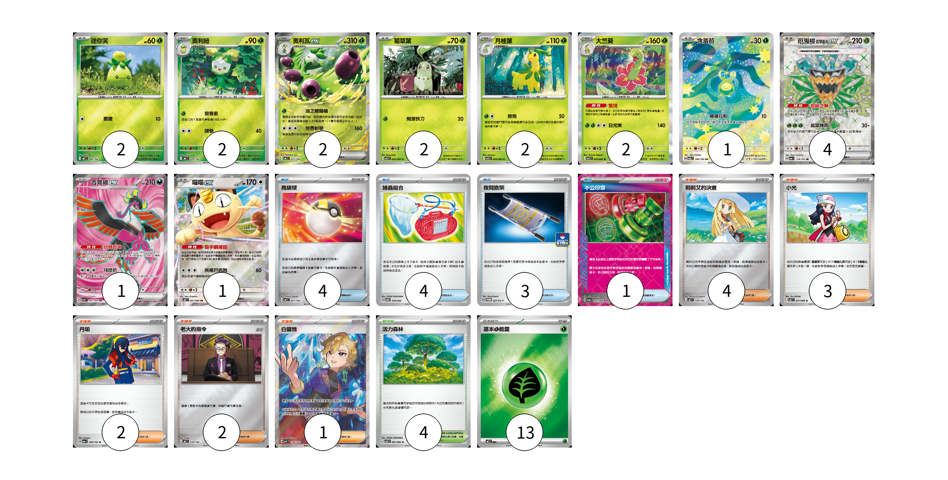 牌組構築方案 以此牌組為基礎新構築牌組 顯示卡面 顯示列表 寶可夢卡(19) 2 2 2 2 2 2 1 4 1 1 物品卡(12) 4 4 3 1 支援者卡(12) 4 3 2 2 1 競技場卡(4) 4 能量卡(13) 13 寶可夢卡(19) 卡牌名稱 張數 卡牌名稱 張數 迷你芙 MC 069/742 02 奧利紐 MC 070/742 02 奧利瓦ex MC 071/742 02 菊草葉 M1S 003/063 02 月桂葉 M1S 004/063 02 大竺葵 M1S 005/063 02 含羞苞 M2a 196/193 01 厄鬼椪 碧草面具ex SV6 114/101 04 吉雉雞ex SV6a 081/064 01 喵喵ex M3 061/080 01 物品卡(12) 卡牌名稱 張數 卡牌名稱 張數 高級球 MC 651/742 04 捕蟲組合 SVTM 015/022 04 夜間擔架 SV-P 227/SV-P 03 不公印章 SV5a 053/066 01 支援者卡(12) 卡牌名稱 張數 卡牌名稱 張數 莉莉艾的決意 MC 729/742 04 小光 M2 077/080 03 丹瑜 SV6 097/101 02 老大的指令 MC 724/742 02 白蕾雅 SV7 126/102 01 競技場卡(4) 卡牌名稱 張數 卡牌名稱 張數 活力森林 M1S 061/063 04 能量卡(13) 卡牌名稱 張數 卡牌名稱 張數 基本【草】能量 MC GRA 13 以此牌組為基礎新構築牌組 牌組編碼 hDddqX-jWdoIG-iVDypm copy 列印牌組單 牌組編碼已複製 分享至SNS