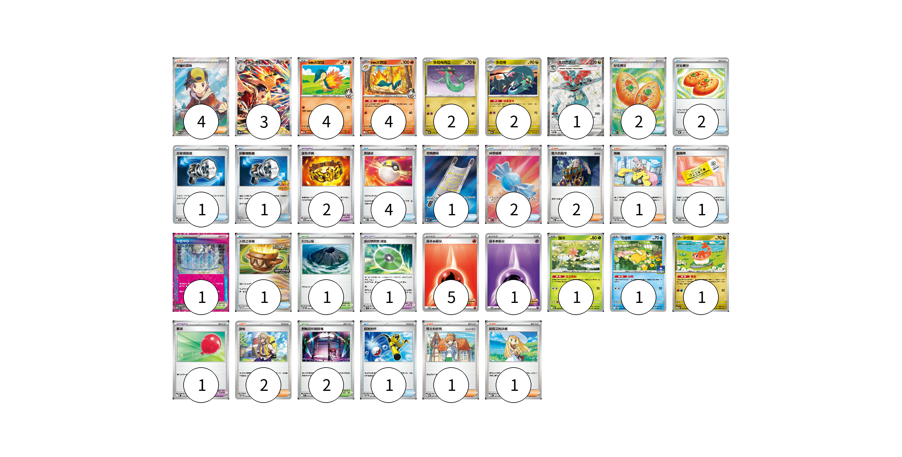 牌組構築方案 以此牌組為基礎新構築牌組 顯示卡面 顯示列表 寶可夢卡(19) 3 4 4 2 2 1 1 1 1 寶可夢道具(4) 2 1 1 物品卡(16) 2 2 1 1 4 1 2 1 1 1 支援者卡(11) 4 2 1 2 1 1 競技場卡(4) 1 1 2 能量卡(6) 5 1 寶可夢卡(19) 卡牌名稱 張數 卡牌名稱 張數 <阿響的>火爆獸 SV9a 070/063 03 <阿響的>火球鼠 SV9a 015/063 04 <阿響的>火岩鼠 SV9a 016/063 04 多龍梅西亞 SV8a 118/187 02 多龍奇 SV8a 119/187 02 多龍巴魯托ex SV6 120/101 01 謝米 SV9a 006/063 01 可達鴨 SV-P 220/SV-P 01 米立龍 MBD 010/022 01 寶可夢道具(4) 卡牌名稱 張數 卡牌名稱 張數 猛攻手鐲 SV11W 082/086 02 招式學習器 演進 SV4M 063/066 01 氣球 MBD 018/022 01 物品卡(16) 卡牌名稱 張數 卡牌名稱 張數 好友寶芬 M1S 081/063 02 好友寶芬 SV8a 147/187 02 反擊捕捉器 SV8a 139/187 01 反擊捕捉器 SV-P 083/SV-P 01 高級球 MBD 014/022 04 夜間擔架 M1L 083/063 01 神奇糖果 M1S 082/063 02 調換票 SV9 090/100 01 大地之容器 SV-P 137/SV-P 01 厲害釣竿 SVOD 010/020 01 支援者卡(11) 卡牌名稱 張數 卡牌名稱 張數 阿響的冒險 SV9a 084/063 04 老大的指令 MBG 021/022 02 奇樹 SVOM 018/021 01 派帕 SVOD 018/020 02 博士的研究 SV11B 084/086 01 莉莉艾的決意 MBD 021/022 01 競技場卡(4) 卡牌名稱 張數 卡牌名稱 張數 中立中心 SV6a 063/064 01 引力山岳 SV8 106/106 01 對戰圓形競技場 M2 079/080 02 能量卡(6) 卡牌名稱 張數 卡牌名稱 張數 基本【火】能量 SV-P 258/SV-P 05 基本【超】能量 SV-P 261/SV-P 01 以此牌組為基礎新構築牌組 牌組編碼 hFvrhc-BSAgWV-NTiefl copy 列印牌組單 牌組編碼已複製 分享至SNS