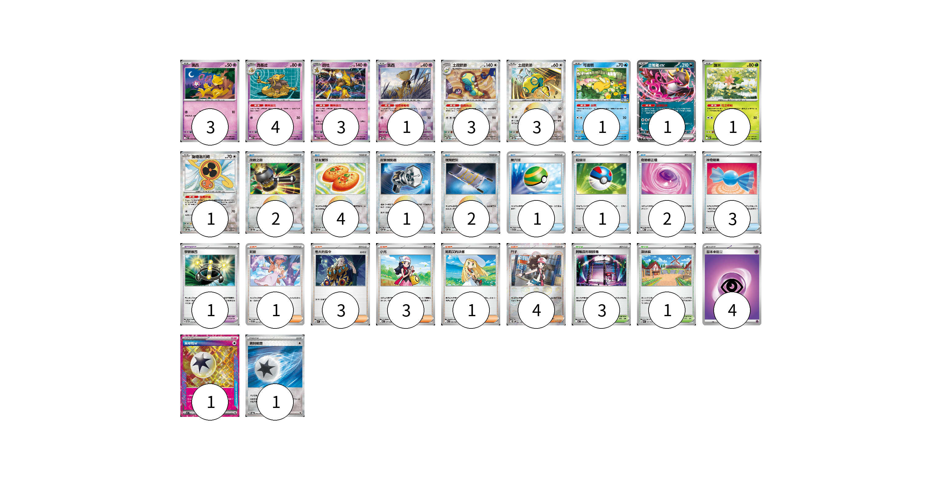 牌組構築方案 以此牌組為基礎新構築牌組 顯示卡面 顯示列表 寶可夢卡(21) 3 4 3 1 3 3 1 1 1 1 寶可夢道具(1) 1 物品卡(16) 2 4 1 2 1 1 2 3 支援者卡(12) 1 3 3 1 4 競技場卡(4) 3 1 能量卡(6) 4 1 1 寶可夢卡(21) 卡牌名稱 張數 卡牌名稱 張數 凱西 M1S 036/063 03 勇基拉 M1S 037/063 04 胡地 M1S 038/063 03 凱西 SV8a 057/187 01 土龍節節 SV8a 130/187 03 土龍弟弟 SV8a 129/187 03 可達鴨 SV-P 220/SV-P 01 吉雉雞ex SVOM 009/021 01 謝米 SV9a 006/063 01 旋轉洛托姆 SV8a 131/187 01 寶可夢道具(1) 卡牌名稱 張數 卡牌名稱 張數 學習裝置 SVTM 016/022 01 物品卡(16) 卡牌名稱 張數 卡牌名稱 張數 改造之錘 SV8a 138/187 02 好友寶芬 SV8a 147/187 04 反擊捕捉器 SV8a 139/187 01 夜間擔架 SV8a 151/187 02 巢穴球 SVTS 013/022 01 超級球 SVM 132/175 01 奇跡修正檔 MBD 017/022 02 神奇糖果 MBG 013/022 03 支援者卡(12) 卡牌名稱 張數 卡牌名稱 張數 莉普 SVTS 021/022 01 老大的指令 SVM 172/175 03 小光 M2 077/080 03 莉莉艾的決意 M1L 062/063 01 鬥子 SV11W 085/086 04 競技場卡(4) 卡牌名稱 張數 卡牌名稱 張數 對戰圓形競技場 M2 079/080 03 深缽鎮 SVK 039/042 01 能量卡(6) 卡牌名稱 張數 卡牌名稱 張數 基本超能量 sv-p PSY 04 富裕能量 SV7a 064/064 01 噴射能量 SV8a 185/187 01 以此牌組為基礎新構築牌組 牌組編碼 hGWfUK-bEXgIJ-eMuDfC copy 列印牌組單 牌組編碼已複製 分享至SNS