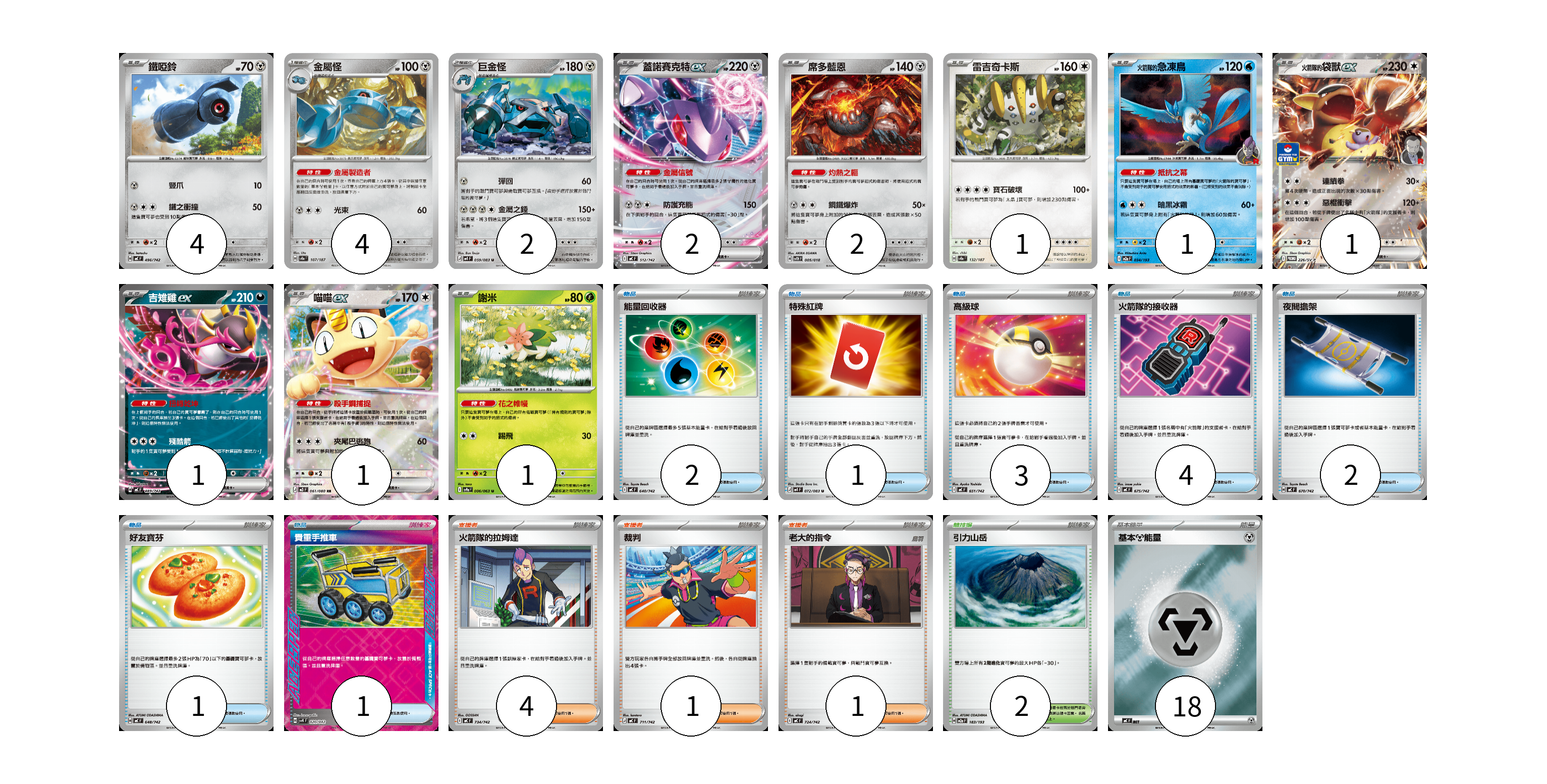 牌組構築方案 以此牌組為基礎新構築牌組 顯示卡面 顯示列表 寶可夢卡(20) 4 4 2 2 2 1 1 1 1 1 1 物品卡(14) 2 1 3 4 2 1 1 支援者卡(6) 4 1 1 競技場卡(2) 2 能量卡(18) 18 寶可夢卡(20) 卡牌名稱 張數 卡牌名稱 張數 鐵啞鈴 MC 496/742 04 金屬怪 SV8a 107/187 04 巨金怪 M4 059/083 02 蓋諾賽克特ex MC 512/742 02 席多藍恩 SVTH 005/018 02 雷吉奇卡斯 SV8a 132/187 01 <火箭隊的>急凍鳥 M2a 034/193 01 <火箭隊的>袋獸ex SV-P 226/SV-P 01 吉雉雞ex MC 489/742 01 喵喵ex M3 061/080 01 謝米 SV9a 006/063 01 物品卡(14) 卡牌名稱 張數 卡牌名稱 張數 能量回收器 MC 640/742 02 特殊紅牌 M4 072/083 01 高級球 MC 651/742 03 火箭隊的接收器 MC 675/742 04 夜間擔架 MC 670/742 02 好友寶芬 MC 648/742 01 貴重手推車 SVK 020/042 01 支援者卡(6) 卡牌名稱 張數 卡牌名稱 張數 火箭隊的拉姆達 MC 734/742 04 裁判 MC 711/742 01 老大的指令 MC 724/742 01 競技場卡(2) 卡牌名稱 張數 卡牌名稱 張數 引力山岳 M2a 183/193 02 能量卡(18) 卡牌名稱 張數 卡牌名稱 張數 基本【鋼】能量 MC MET 18 以此牌組為基礎新構築牌組 牌組編碼 hGlFHN-YWqEHg-VPDZJj copy 列印牌組單 牌組編碼已複製 分享至SNS