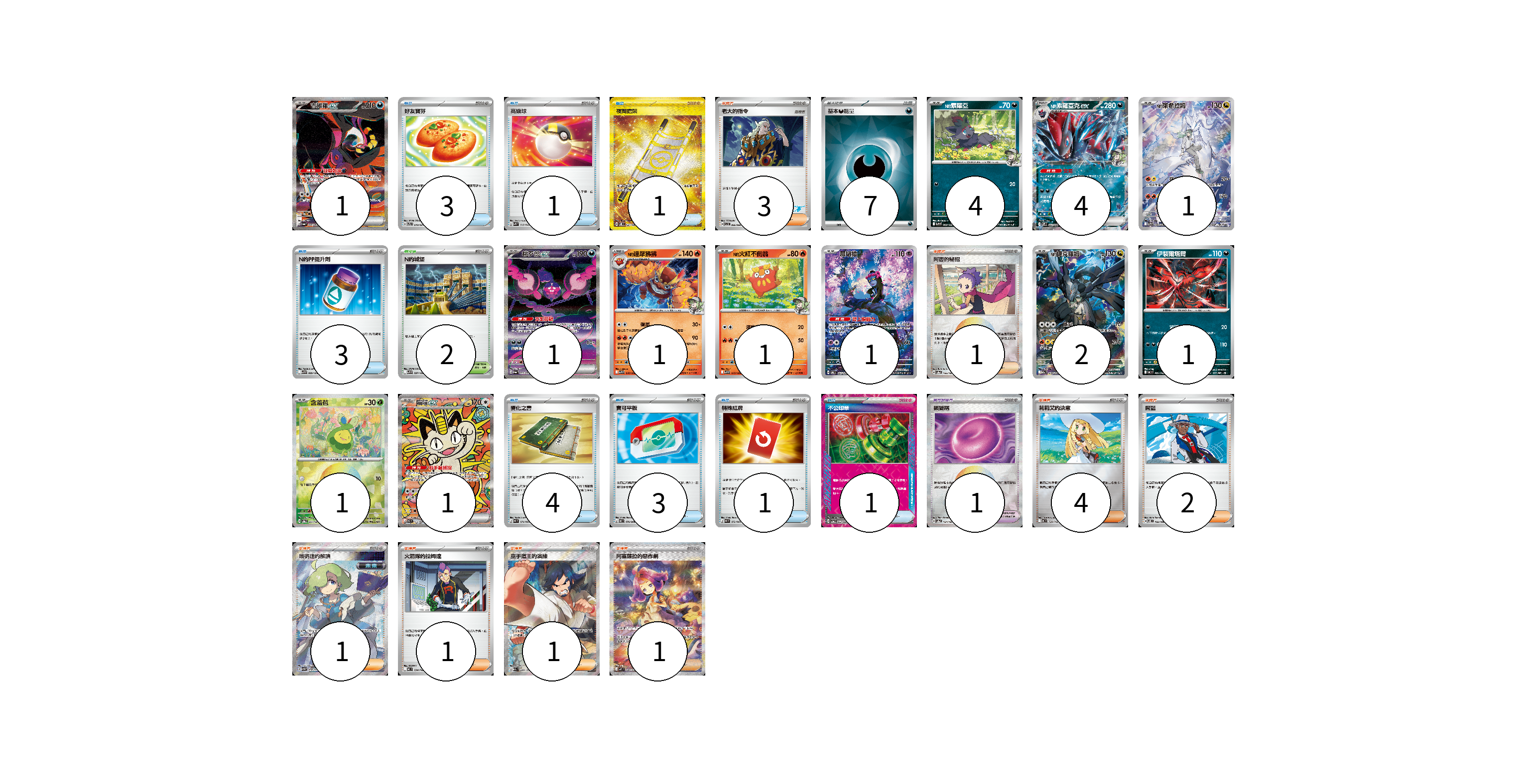 牌組構築方案 以此牌組為基礎新構築牌組 顯示卡面 顯示列表 寶可夢卡(19) 1 4 4 1 1 1 1 1 2 1 1 1 寶可夢道具(1) 1 物品卡(17) 3 1 1 3 4 3 1 1 支援者卡(14) 3 1 4 2 1 1 1 1 競技場卡(2) 2 能量卡(7) 7 寶可夢卡(19) 卡牌名稱 張數 卡牌名稱 張數 吉雉雞ex SV6a 089/064 01 N的索羅亞 SV9 060/100 04 N的索羅亞克ex SV9 061/100 04 N的萊希拉姆 SV9 109/100 01 桃歹郎ex SV6a 090/064 01 N的達摩狒狒 SV9 016/100 01 N的火紅不倒翁 SV9 015/100 01 願增猿 SV6 107/101 01 N的捷克羅姆 M2a 210/193 02 伊裴爾塔爾 MC 481/742 01 含羞苞 SV8a 001/187 01 喵喵ex M3 114/080 01 寶可夢道具(1) 卡牌名稱 張數 卡牌名稱 張數 鎖鏈糬 SV8a 154/187 01 物品卡(17) 卡牌名稱 張數 卡牌名稱 張數 好友寶芬 SVTL 010/021 03 高級球 SVK 018/042 01 夜間擔架 SV8 137/106 01 N的PP提升劑 SV9 089/100 03 變化之書 M4 074/083 04 寶可平板 M3 070/080 03 特殊紅牌 M4 072/083 01 不公印章 SV5a 053/066 01 支援者卡(14) 卡牌名稱 張數 卡牌名稱 張數 老大的指令 SVI 066/066 03 阿杏的秘招 SV8a 166/187 01 莉莉艾的決意 MC 729/742 04 席藍 SV8 102/106 02 暗碼迷的解讀 SV5M 090/071 01 火箭隊的拉姆達 MC 734/742 01 空手道王的演練 M2a 220/193 01 阿塞蘿拉的惡作劇 M1S 090/063 01 競技場卡(2) 卡牌名稱 張數 卡牌名稱 張數 N的城堡 SV9 097/100 02 能量卡(7) 卡牌名稱 張數 卡牌名稱 張數 基本【惡】能量 SVK DAR 07 以此牌組為基礎新構築牌組 牌組編碼 hHJEIW-LwGEbB-eJeJDd copy 列印牌組單 牌組編碼已複製 分享至SNS