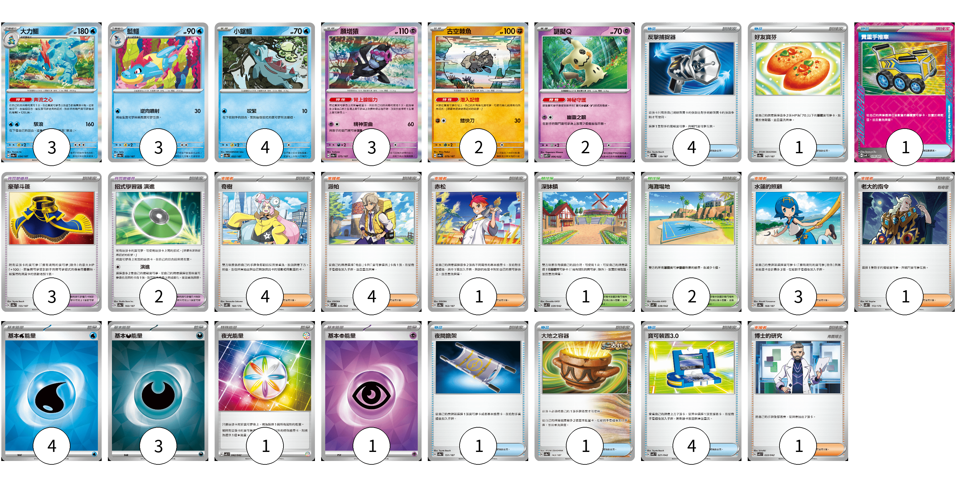 牌組構築方案 以此牌組為基礎新構築牌組 顯示卡面 顯示列表 寶可夢卡(17) 3 3 4 3 2 2 寶可夢道具(5) 3 2 物品卡(12) 4 1 1 1 1 4 支援者卡(14) 4 4 1 3 1 1 競技場卡(3) 1 2 能量卡(9) 4 3 1 1 寶可夢卡(17) 卡牌名稱 張數 卡牌名稱 張數 大力鱷 SV8a 034/187 03 藍鱷 SV8a 033/187 03 小鋸鱷 SV8a 032/187 04 願增猿 SV8a 075/187 03 古空棘魚 SV8a 079/187 02 謎擬Q SVTS 006/022 02 寶可夢道具(5) 卡牌名稱 張數 卡牌名稱 張數 豪華斗篷 SV8a 155/187 03 招式學習器 演進 SV8a 160/187 02 物品卡(12) 卡牌名稱 張數 卡牌名稱 張數 反擊捕捉器 SV8a 139/187 04 好友寶芬 SV8a 147/187 01 貴重手推車 SVK 020/042 01 夜間擔架 SV8a 151/187 01 大地之容器 SV8a 143/187 01 寶可裝置3.0 SVK 021/042 04 支援者卡(14) 卡牌名稱 張數 卡牌名稱 張數 奇樹 SVM 160/175 04 派帕 SVK 035/042 04 赤松 SV8a 163/187 01 水蓮的照顧 SV8a 168/187 03 老大的指令 SVM 172/175 01 博士的研究 SVK 033/042 01 競技場卡(3) 卡牌名稱 張數 卡牌名稱 張數 深缽鎮 SVK 039/042 01 海灘場地 SVK 038/042 02 能量卡(9) 卡牌名稱 張數 卡牌名稱 張數 基本【水】能量 SVK WAT 04 基本【惡】能量 SVK DAR 03 夜光能量 SVK 042/042 01 基本【超】能量 SVK PSY 01 以此牌組為基礎新構築牌組 牌組編碼 hIwXeM-tAFnpl-bBhIqq copy 列印牌組單 牌組編碼已複製 分享至SNS