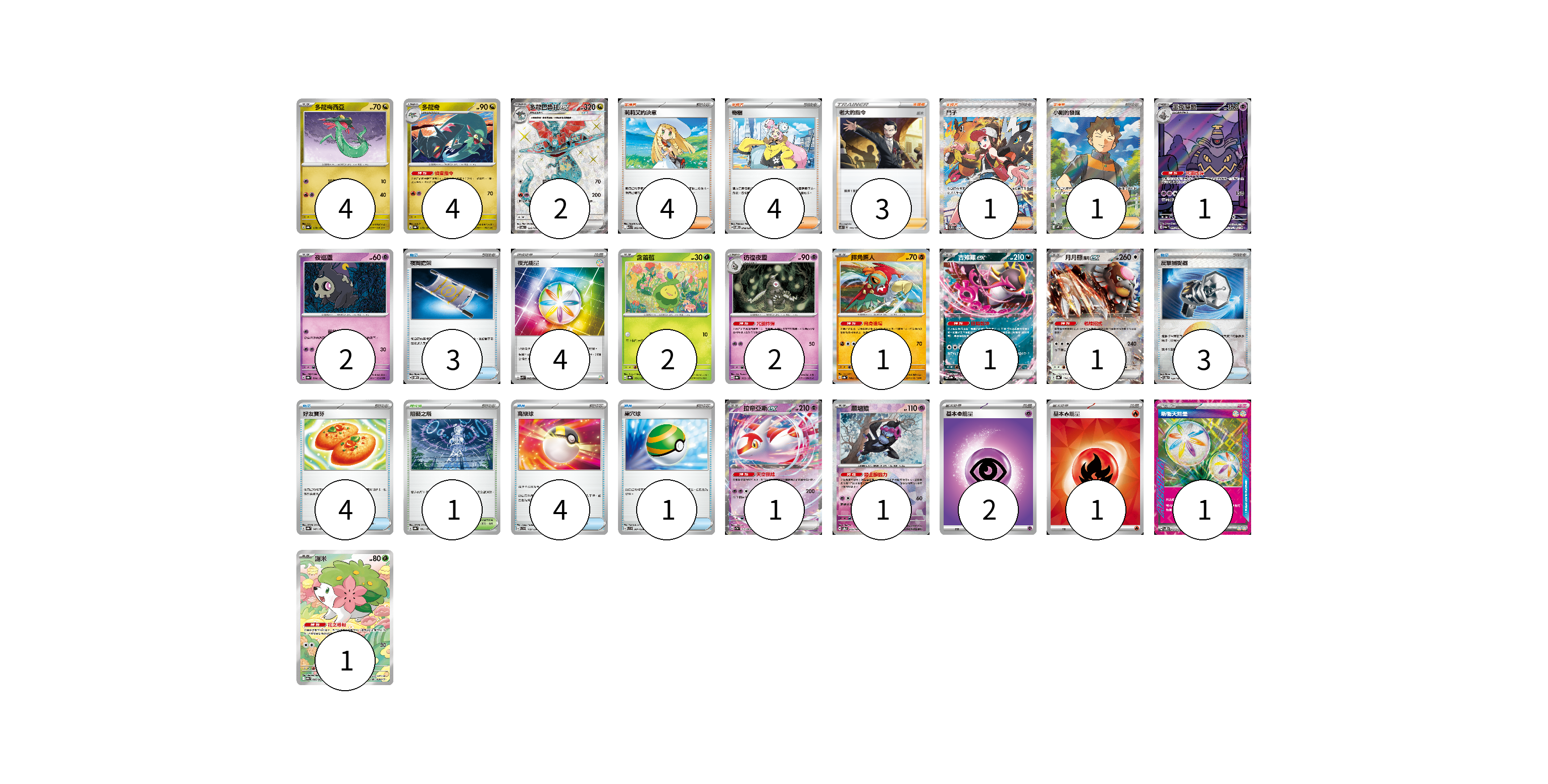 牌組構築方案 以此牌組為基礎新構築牌組 顯示卡面 顯示列表 寶可夢卡(23) 4 4 2 1 2 2 2 1 1 1 1 1 1 物品卡(15) 3 3 4 4 1 支援者卡(13) 4 4 3 1 1 競技場卡(1) 1 能量卡(8) 4 2 1 1 寶可夢卡(23) 卡牌名稱 張數 卡牌名稱 張數 多龍梅西亞 SV8a 118/187 04 多龍奇 SV8a 119/187 04 多龍巴魯托ex SV6 120/101 02 黑夜魔靈 SV6a 070/064 01 夜巡靈 SV8a 064/187 02 含羞苞 SV8a 001/187 02 彷徨夜靈 SV8a 065/187 02 摔角鷹人 SV8a 084/187 01 吉雉雞ex SV8a 104/187 01 月月熊 赫月ex SV8a 134/187 01 拉帝亞斯ex SV7a 019/064 01 願增猿 SV8a 075/187 01 謝米 SV9a 066/063 01 物品卡(15) 卡牌名稱 張數 卡牌名稱 張數 夜間擔架 SVOM 016/021 03 反擊捕捉器 SV8a 139/187 03 好友寶芬 SV8a 147/187 04 高級球 SVD 119/139 04 巢穴球 SVB 001/028 01 支援者卡(13) 卡牌名稱 張數 卡牌名稱 張數 莉莉艾的決意 M1L 062/063 04 奇樹 SVOM 018/021 04 老大的指令(坂木) SCB 140/156 03 鬥子 SV11W 173/086 01 小剛的發掘 SV9 123/100 01 競技場卡(1) 卡牌名稱 張數 卡牌名稱 張數 阻礙之塔 SV8a 181/187 01 能量卡(8) 卡牌名稱 張數 卡牌名稱 張數 夜光能量 SVK 042/042 04 基本【超】能量 M-P PSY 02 基本【火】能量 SVQL FIR 01 新衝天能量 SV5K 071/071 01 以此牌組為基礎新構築牌組 牌組編碼 hKpDLn-eNcuei-WbVGGK copy 列印牌組單 牌組編碼已複製 分享至SNS