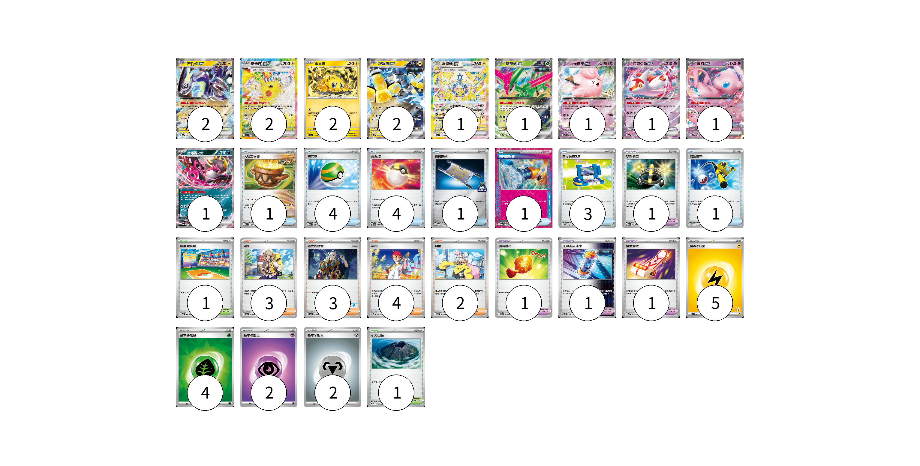 牌組構築方案 以此牌組為基礎新構築牌組 顯示卡面 顯示列表 寶可夢卡(14) 2 2 2 2 1 1 1 1 1 1 寶可夢道具(4) 1 1 1 1 物品卡(15) 1 4 4 1 1 3 1 支援者卡(12) 3 3 4 2 競技場卡(2) 1 1 能量卡(13) 5 4 2 2 寶可夢卡(14) 卡牌名稱 張數 卡牌名稱 張數 密勒頓ex SV4a 071/190 02 皮卡丘ex SV8 132/106 02 電電蟲 SV7 032/102 02 鐵臂膀ex SV8a 054/187 02 電蜘蛛ex SV7 128/102 01 鐵斑葉ex SV8a 016/187 01 莉莉艾的皮皮ex SV9 033/100 01 拉帝亞斯ex SV7a 019/064 01 夢幻ex SVK 001/042 01 吉雉雞ex SV6a 038/064 01 寶可夢道具(4) 卡牌名稱 張數 卡牌名稱 張數 學習裝置 SV1S 072/078 01 勇氣護符 SVTR 015/021 01 驅勁能量 未來 SV8a 158/187 01 緊急滑板 SVK 023/042 01 物品卡(15) 卡牌名稱 張數 卡牌名稱 張數 大地之容器 SVK 012/042 01 巢穴球 SVM 133/175 04 高級球 SVM 134/175 04 夜間擔架 SV-P 204/SV-P 01 頂尖捕捉器 SV8a 148/187 01 寶可裝置3.0 SVD 121/139 03 厲害釣竿 SVTH 008/018 01 支援者卡(12) 卡牌名稱 張數 卡牌名稱 張數 派帕 SVOD 018/020 03 老大的指令 SVI 066/066 03 赤松 SVK 027/042 04 奇樹 SVOM 018/021 02 競技場卡(2) 卡牌名稱 張數 卡牌名稱 張數 激動競技場 SV8 105/106 01 引力山岳 SV8 106/106 01 能量卡(13) 卡牌名稱 張數 卡牌名稱 張數 基本【雷】能量 SVI LIG 05 基本【草】能量 SVK GRA 04 基本【超】能量 SVHM PSY 02 基本【鋼】能量 SVF MET 02 以此牌組為基礎新構築牌組 牌組編碼 hLHRXa-xhpXAn-fPCGJg copy 列印牌組單 牌組編碼已複製 分享至SNS