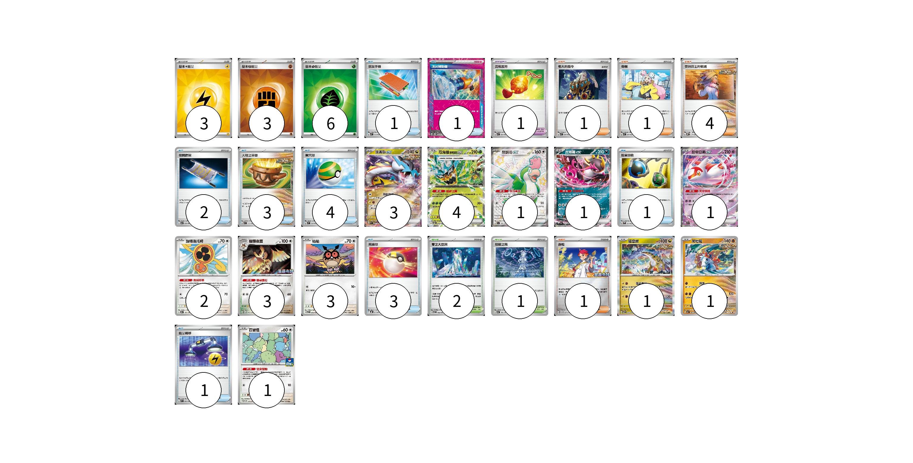 牌組構築方案 以此牌組為基礎新構築牌組 顯示卡面 顯示列表 寶可夢卡(21) 3 4 1 1 1 2 3 3 1 1 1 寶可夢道具(1) 1 物品卡(16) 1 1 2 3 4 1 3 1 支援者卡(7) 1 1 4 1 競技場卡(3) 2 1 能量卡(12) 3 3 6 寶可夢卡(21) 卡牌名稱 張數 卡牌名稱 張數 猛雷鼓ex SV5K 053/071 03 厄鬼椪 碧草面具ex SV6 016/101 04 怒鸚哥ex SV4a 337/190 01 吉雉雞ex SV6a 038/064 01 拉帝亞斯ex SV7a 019/064 01 旋轉洛托姆 SV8a 131/187 02 貓頭夜鷹 SV-P 145/SV-P 03 咕咕 SV7 076/102 03 猛雷鼓 SV7 075/102 01 爬地翅 SV4K 041/066 01 百變怪 SV-P 111/SV-P 01 寶可夢道具(1) 卡牌名稱 張數 卡牌名稱 張數 勇氣護符 SVK 024/042 01 物品卡(16) 卡牌名稱 張數 卡牌名稱 張數 朋友手冊 SVK 014/042 01 頂尖捕捉器 SV5M 062/071 01 夜間擔架 SV6a 056/064 02 大地之容器 SVK 012/042 03 巢穴球 SVK 016/042 04 能量回收 SVAW 011/023 01 高級球 SVHK 013/022 03 能量轉移 SVK 008/042 01 支援者卡(7) 卡牌名稱 張數 卡牌名稱 張數 老大的指令 SVK 036/042 01 奇樹 SVK 031/042 01 奧琳博士的氣魄 SVHK 017/022 04 赤松 SV-P 150/SV-P 01 競技場卡(3) 卡牌名稱 張數 卡牌名稱 張數 零之大空洞 SV7 102/102 02 阻礙之塔 SV8a 181/187 01 能量卡(12) 卡牌名稱 張數 卡牌名稱 張數 基本【雷】能量 SVK LIG 03 基本【鬥】能量 SVK FIG 03 基本【草】能量 SVK GRA 06 以此牌組為基礎新構築牌組 牌組編碼 hLePzm-BfVEkn-BIowaS copy 列印牌組單 牌組編碼已複製 分享至SNS