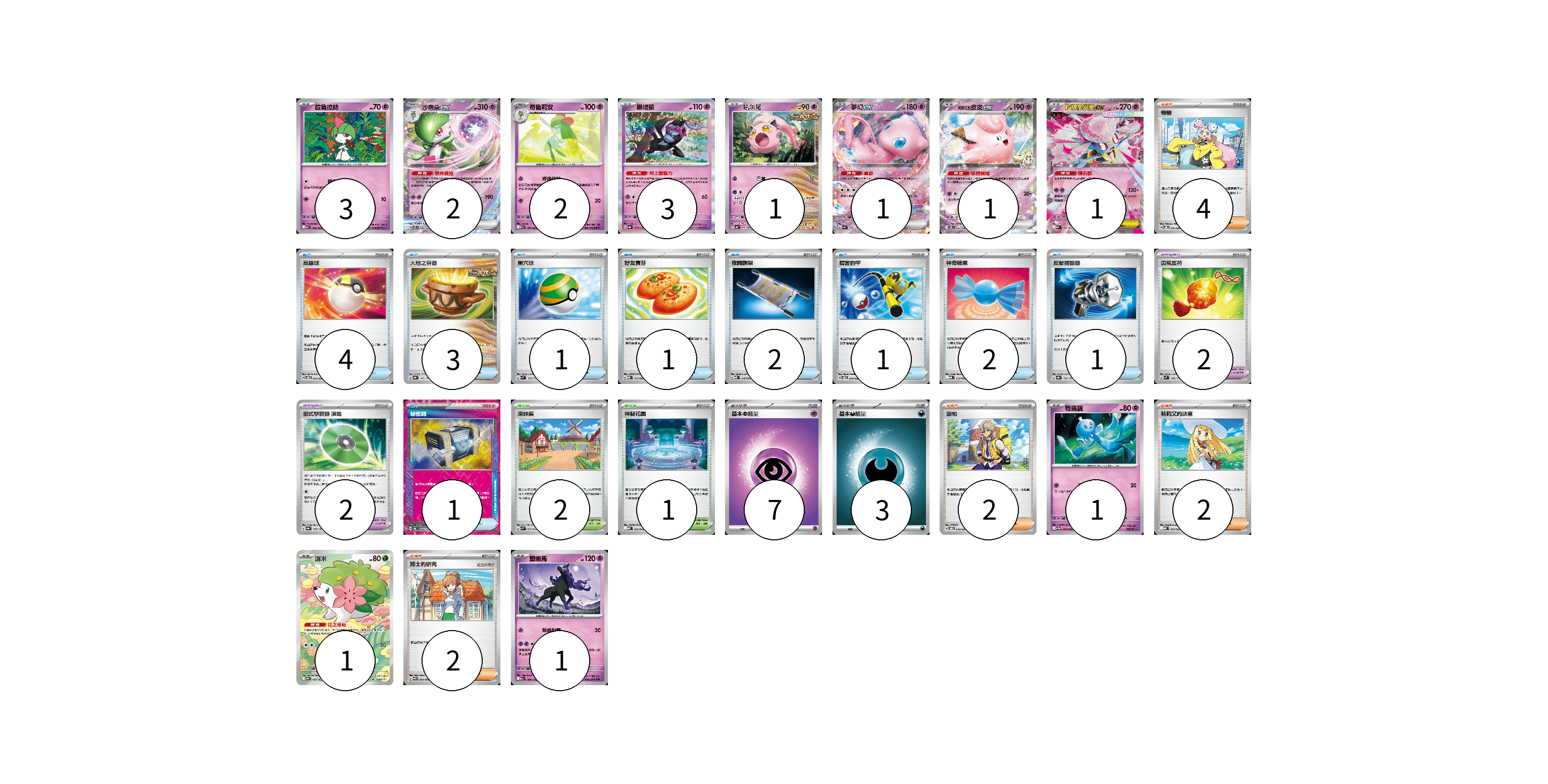 牌組構築方案 以此牌組為基礎新構築牌組 顯示卡面 顯示列表 寶可夢卡(17) 3 2 2 3 1 1 1 1 1 1 1 寶可夢道具(4) 2 2 物品卡(16) 4 3 1 1 2 1 2 1 1 支援者卡(10) 4 2 2 2 競技場卡(3) 2 1 能量卡(10) 7 3 寶可夢卡(17) 卡牌名稱 張數 卡牌名稱 張數 拉魯拉絲 M1S 040/063 03 沙奈朵ex SVTS 004/022 02 奇魯莉安 M1S 041/063 02 願增猿 SV8a 075/187 03 吼叫尾 SV4K 032/066 01 夢幻ex SV4a 076/190 01 莉莉艾的皮皮ex SV9 033/100 01 超級蒂安希ex MBD 006/022 01 輕飄飄 SV11W 041/086 01 謝米 SV9a 066/063 01 靈幽馬 M2a 080/193 01 寶可夢道具(4) 卡牌名稱 張數 卡牌名稱 張數 勇氣護符 SVM 142/175 02 招式學習器 演進 SV8a 160/187 02 物品卡(16) 卡牌名稱 張數 卡牌名稱 張數 高級球 SVOD 012/020 04 大地之容器 SV8a 143/187 03 巢穴球 SVM 133/175 01 好友寶芬 MBD 013/022 01 夜間擔架 MBD 016/022 02 厲害釣竿 SVOD 010/020 01 神奇糖果 MBG 013/022 02 反擊捕捉器 SV8a 139/187 01 秘密箱 SV6 092/101 01 支援者卡(10) 卡牌名稱 張數 卡牌名稱 張數 奇樹 SVOD 016/020 04 派帕 SVOD 018/020 02 莉莉艾的決意 MBD 021/022 02 博士的研究 SV11B 084/086 02 競技場卡(3) 卡牌名稱 張數 卡牌名稱 張數 深缽鎮 SVK 039/042 02 神秘花園 MBD 022/022 01 能量卡(10) 卡牌名稱 張數 卡牌名稱 張數 基本【超】能量 MBD PSY 07 基本【惡】能量 MBG DAR 03 以此牌組為基礎新構築牌組 牌組編碼 hMSaua-rjczUP-svUZOT copy 列印牌組單 牌組編碼已複製 分享至SNS