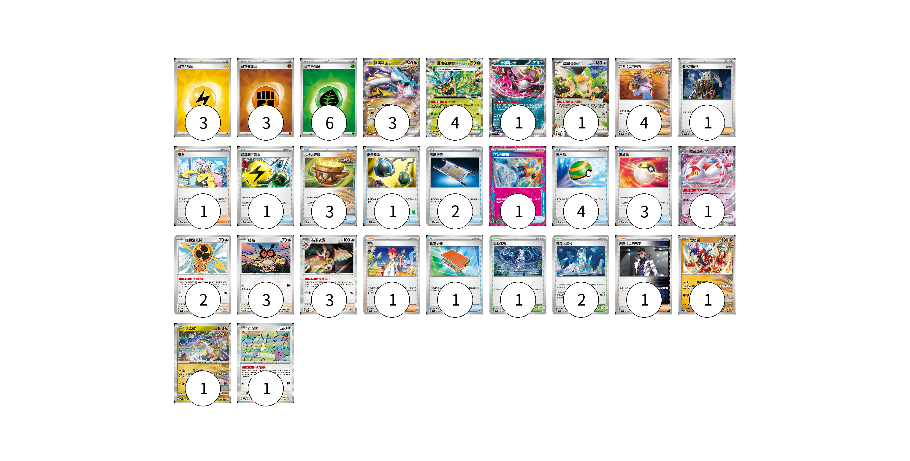 牌組構築方案 以此牌組為基礎新構築牌組 顯示卡面 顯示列表 寶可夢卡(21) 3 4 1 1 1 2 3 3 1 1 1 物品卡(16) 1 3 1 2 1 4 3 1 支援者卡(8) 4 1 1 1 1 競技場卡(3) 1 2 能量卡(12) 3 3 6 寶可夢卡(21) 卡牌名稱 張數 卡牌名稱 張數 猛雷鼓ex SV5K 053/071 03 厄鬼椪 碧草面具ex SV6 016/101 04 吉雉雞ex SV6a 038/064 01 怒鸚哥ex SVK 006/042 01 拉帝亞斯ex SV7a 019/064 01 旋轉洛托姆 SV8a 131/187 02 咕咕 SV7 076/102 03 貓頭夜鷹 SV8a 128/187 03 故勒頓 SV8 069/106 01 猛雷鼓 SV7 075/102 01 百變怪 SV4a 144/190 01 物品卡(16) 卡牌名稱 張數 卡牌名稱 張數 超級能量回收 SVK 010/042 01 大地之容器 SVK 012/042 03 能量回收 SVI 049/066 01 夜間擔架 SV6a 056/064 02 頂尖捕捉器 SV5M 062/071 01 巢穴球 SVK 016/042 04 高級球 SVK 018/042 03 朋友手冊 SVK 014/042 01 支援者卡(8) 卡牌名稱 張數 卡牌名稱 張數 奧琳博士的氣魄 SVHK 017/022 04 老大的指令 SVK 036/042 01 奇樹 SVK 031/042 01 赤松 SV8a 163/187 01 弗圖博士的劇本 SV8a 175/187 01 競技場卡(3) 卡牌名稱 張數 卡牌名稱 張數 阻礙之塔 SV8a 181/187 01 零之大空洞 SV8a 182/187 02 能量卡(12) 卡牌名稱 張數 卡牌名稱 張數 基本【雷】能量 SVK LIG 03 基本【鬥】能量 SVK FIG 03 基本【草】能量 SVK GRA 06 以此牌組為基礎新構築牌組 牌組編碼 hMgrJK-QaDBSa-mlxHon copy 列印牌組單 牌組編碼已複製 分享至SNS