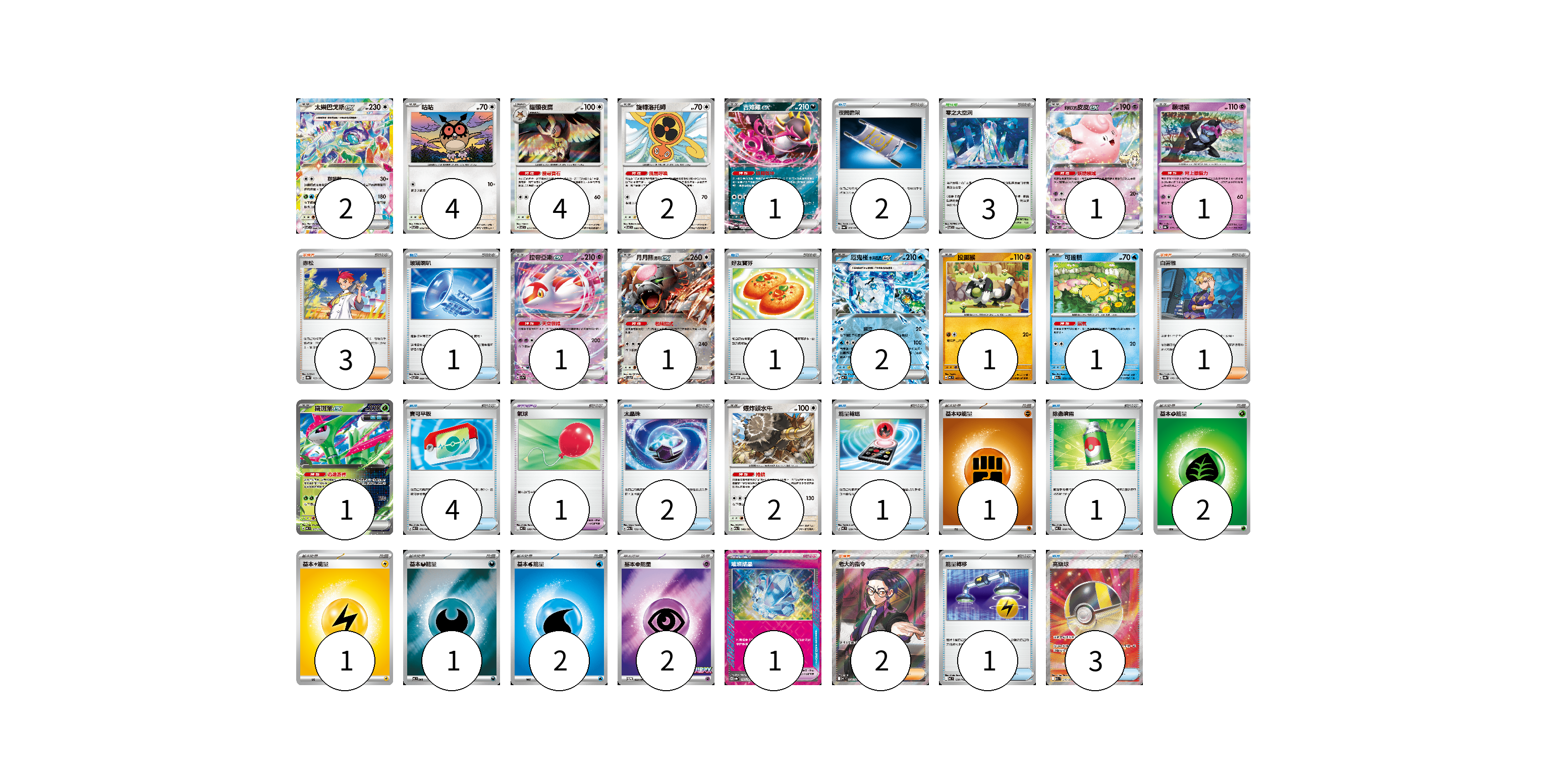 牌組構築方案 以此牌組為基礎新構築牌組 顯示卡面 顯示列表 寶可夢卡(24) 2 4 4 2 1 1 1 1 1 2 1 1 1 2 寶可夢道具(2) 1 1 物品卡(16) 2 1 1 4 2 1 1 1 3 支援者卡(6) 3 1 2 競技場卡(3) 3 能量卡(9) 1 2 1 1 2 2 寶可夢卡(24) 卡牌名稱 張數 卡牌名稱 張數 太樂巴戈斯ex SV7 088/102 02 咕咕 SV7 076/102 04 貓頭夜鷹 SV7 077/102 04 旋轉洛托姆 SV7 080/102 02 吉雉雞ex SV6a 038/064 01 莉莉艾的皮皮ex SV9 033/100 01 願增猿 SV8a 075/187 01 拉帝亞斯ex SV7a 019/064 01 月月熊 赫月 ex SV5a 052/066 01 厄鬼椪 水井面具ex MC 224/742 02 投擲猴 MC 407/742 01 可達鴨 M2a 032/193 01 鐵斑葉ex MC 077/742 01 爆炸頭水牛 M2a 140/193 02 寶可夢道具(2) 卡牌名稱 張數 卡牌名稱 張數 氣球 MC 688/742 01 璀璨結晶 SV8a 152/187 01 物品卡(16) 卡牌名稱 張數 卡牌名稱 張數 夜間擔架 SV6a 056/064 02 玻璃喇叭 SV7 089/102 01 好友寶芬 SVOD 011/020 01 寶可平板 M3 070/080 04 太晶珠 M2a 152/193 02 能量輸送 MC 639/742 01 除蟲噴霧 MC 668/742 01 能量轉移 MC 638/742 01 高級球 M2a 216/193 03 支援者卡(6) 卡牌名稱 張數 卡牌名稱 張數 赤松 SV8a 163/187 03 白蕾雅 SV8a 176/187 01 老大的指令(烏羽) MC 760/742 02 競技場卡(3) 卡牌名稱 張數 卡牌名稱 張數 零之大空洞 SV7 102/102 03 能量卡(9) 卡牌名稱 張數 卡牌名稱 張數 基本【鬥】能量 MC FIG 01 基本【草】能量 MJ GRA 02 基本【雷】能量 MJ LIG 01 基本【惡】能量 MC DAR 01 基本【水】能量 MC WAT 02 基本【超】能量 M-P 033/M-P 02 以此牌組為基礎新構築牌組 牌組編碼 hOhJNe-unfvOm-ULusxH copy 列印牌組單 牌組編碼已複製 分享至SNS