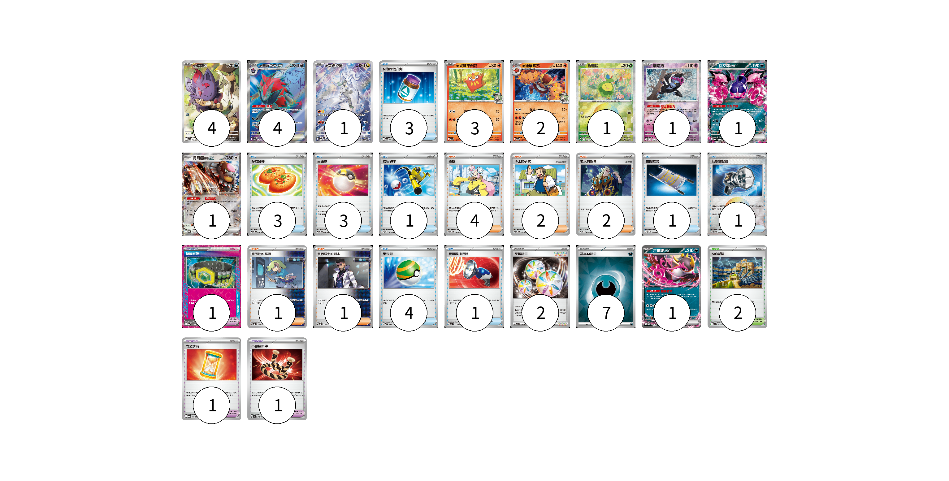 牌組構築方案 以此牌組為基礎新構築牌組 顯示卡面 顯示列表 寶可夢卡(19) 4 4 1 3 2 1 1 1 1 1 寶可夢道具(3) 1 1 1 物品卡(17) 3 3 3 1 1 1 4 1 支援者卡(10) 4 2 2 1 1 競技場卡(2) 2 能量卡(9) 2 7 寶可夢卡(19) 卡牌名稱 張數 卡牌名稱 張數 N的索羅亞 SV9 108/100 04 N的索羅亞克ex SV9 117/100 04 N的萊希拉姆 SV9 109/100 01 N的火紅不倒翁 SV9 015/100 03 N的達摩狒狒 SV9 016/100 02 含羞苞 SV8a 001/187 01 願增猿 SV8a 075/187 01 桃歹郎ex SV8a 105/187 01 月月熊 赫月ex SV8a 134/187 01 吉雉雞ex SVOM 009/021 01 寶可夢道具(3) 卡牌名稱 張數 卡牌名稱 張數 極限腰帶 SV8a 159/187 01 力之沙漏 SV6a 058/064 01 不服輸頭帶 SV1S 073/078 01 物品卡(17) 卡牌名稱 張數 卡牌名稱 張數 N的PP提升劑 SV9 089/100 03 好友寶芬 SVOD 011/020 03 高級球 SVOD 012/020 03 厲害釣竿 SVOD 010/020 01 夜間擔架 SVOM 016/021 01 反擊捕捉器 SV8a 139/187 01 巢穴球 SVM 133/175 04 寶可夢捕捉器 SVM 137/175 01 支援者卡(10) 卡牌名稱 張數 卡牌名稱 張數 奇樹 SVOD 016/020 04 博士的研究 SVOD 017/020 02 老大的指令 SVOD 019/020 02 暗碼迷的解讀 SV8a 165/187 01 弗圖博士的劇本 SV8a 175/187 01 競技場卡(2) 卡牌名稱 張數 卡牌名稱 張數 N的城堡 SV9 097/100 02 能量卡(9) 卡牌名稱 張數 卡牌名稱 張數 反轉能量 SVK 041/042 02 基本【惡】能量 SVK DAR 07 以此牌組為基礎新構築牌組 牌組編碼 hOyQDf-yCOfLT-pkJFBX copy 列印牌組單 牌組編碼已複製 分享至SNS