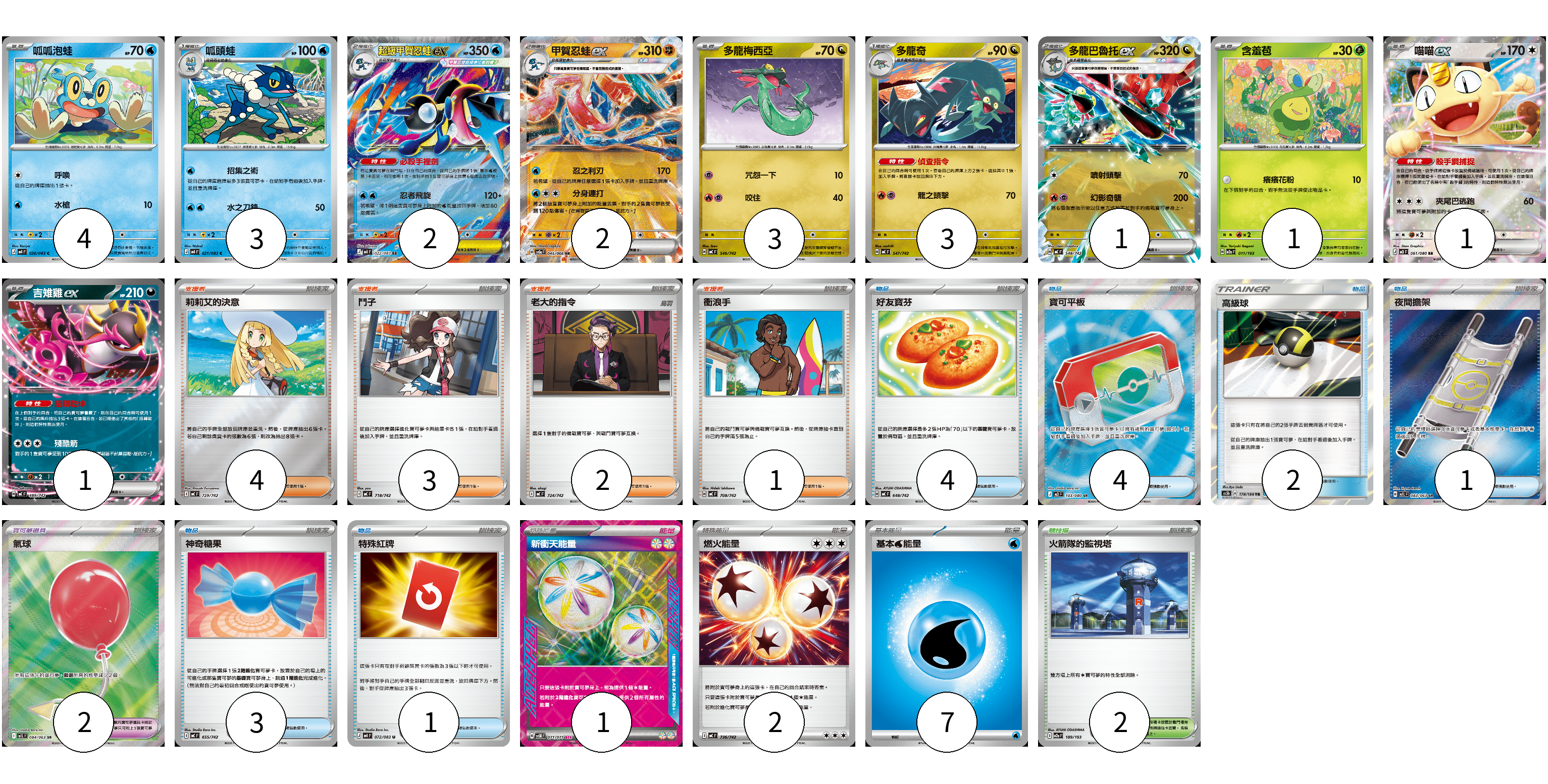牌組構築方案 以此牌組為基礎新構築牌組 顯示卡面 顯示列表 寶可夢卡(21) 4 3 2 2 3 3 1 1 1 1 寶可夢道具(2) 2 物品卡(15) 4 4 2 1 3 1 支援者卡(10) 4 3 2 1 競技場卡(2) 2 能量卡(10) 1 2 7 寶可夢卡(21) 卡牌名稱 張數 卡牌名稱 張數 呱呱泡蛙 M4 020/083 04 呱頭蛙 M4 021/083 03 超級甲賀忍蛙ex M4 022/083 02 甲賀忍蛙ex SV5a 045/066 02 多龍梅西亞 MC 546/742 03 多龍奇 MC 547/742 03 多龍巴魯托ex MC 548/742 01 含羞苞 M2a 011/193 01 喵喵ex M3 061/080 01 吉雉雞ex MC 489/742 01 寶可夢道具(2) 卡牌名稱 張數 卡牌名稱 張數 氣球 M1L 084/063 02 物品卡(15) 卡牌名稱 張數 卡牌名稱 張數 好友寶芬 MC 648/742 04 寶可平板 M3 103/080 04 高級球 AS5b 178/186 02 夜間擔架 M1L 083/063 01 神奇糖果 MC 655/742 03 特殊紅牌 M4 072/083 01 支援者卡(10) 卡牌名稱 張數 卡牌名稱 張數 莉莉艾的決意 MC 729/742 04 鬥子 MC 718/742 03 老大的指令 MC 724/742 02 衝浪手 MC 708/742 01 競技場卡(2) 卡牌名稱 張數 卡牌名稱 張數 火箭隊的監視塔 M2a 189/193 02 能量卡(10) 卡牌名稱 張數 卡牌名稱 張數 新衝天能量 SV5K 071/071 01 燃火能量 MC 736/742 02 基本【水】能量 MC WAT 07 以此牌組為基礎新構築牌組 牌組編碼 hQvYWw-zHkiis-RmQIrk copy 列印牌組單 牌組編碼已複製 分享至SNS