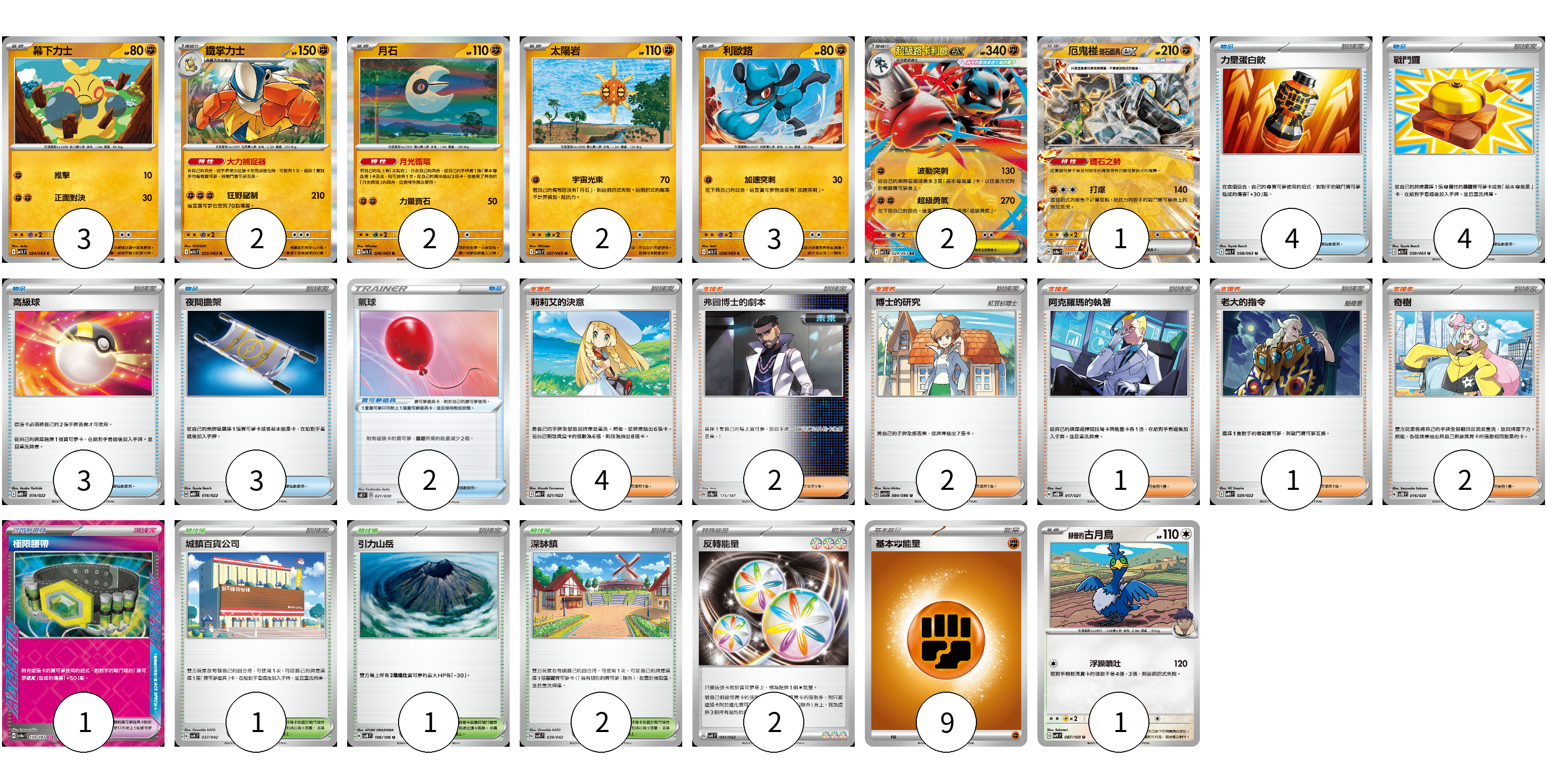 牌組構築方案 以此牌組為基礎新構築牌組 顯示卡面 顯示列表 寶可夢卡(16) 3 2 2 2 3 2 1 1 寶可夢道具(3) 2 1 物品卡(14) 4 4 3 3 支援者卡(12) 4 2 2 1 1 2 競技場卡(4) 1 1 2 能量卡(11) 2 9 寶可夢卡(16) 卡牌名稱 張數 卡牌名稱 張數 幕下力士 M1L 024/063 03 鐵掌力士 M1L 025/063 02 月石 M1L 026/063 02 太陽岩 M1L 027/063 02 利歐路 M1L 028/063 03 超級路卡利歐ex M1L 029/063 02 厄鬼椪 礎石面具ex SV8a 091/187 01 赫普的古月鳥 SV9 087/100 01 寶可夢道具(3) 卡牌名稱 張數 卡牌名稱 張數 氣球 SK 021/030 02 極限腰帶 SV8a 159/187 01 物品卡(14) 卡牌名稱 張數 卡牌名稱 張數 力量蛋白飲 M1L 058/063 04 戰鬥鑼 M1L 059/063 04 高級球 MBD 014/022 03 夜間擔架 MBD 016/022 03 支援者卡(12) 卡牌名稱 張數 卡牌名稱 張數 莉莉艾的決意 MBD 021/022 04 弗圖博士的劇本 SV8a 175/187 02 博士的研究 SV11B 084/086 02 阿克羅瑪的執著 SVOM 017/021 01 老大的指令 MBD 020/022 01 奇樹 SVOD 016/020 02 競技場卡(4) 卡牌名稱 張數 卡牌名稱 張數 城鎮百貨公司 SVK 037/042 01 引力山岳 SV8 106/106 01 深缽鎮 SVK 039/042 02 能量卡(11) 卡牌名稱 張數 卡牌名稱 張數 反轉能量 SVK 041/042 02 基本【鬥】能量 M-P FIG 09 以此牌組為基礎新構築牌組 牌組編碼 hRQRAN-FrvZeG-iAcsjO copy 列印牌組單 牌組編碼已複製 分享至SNS