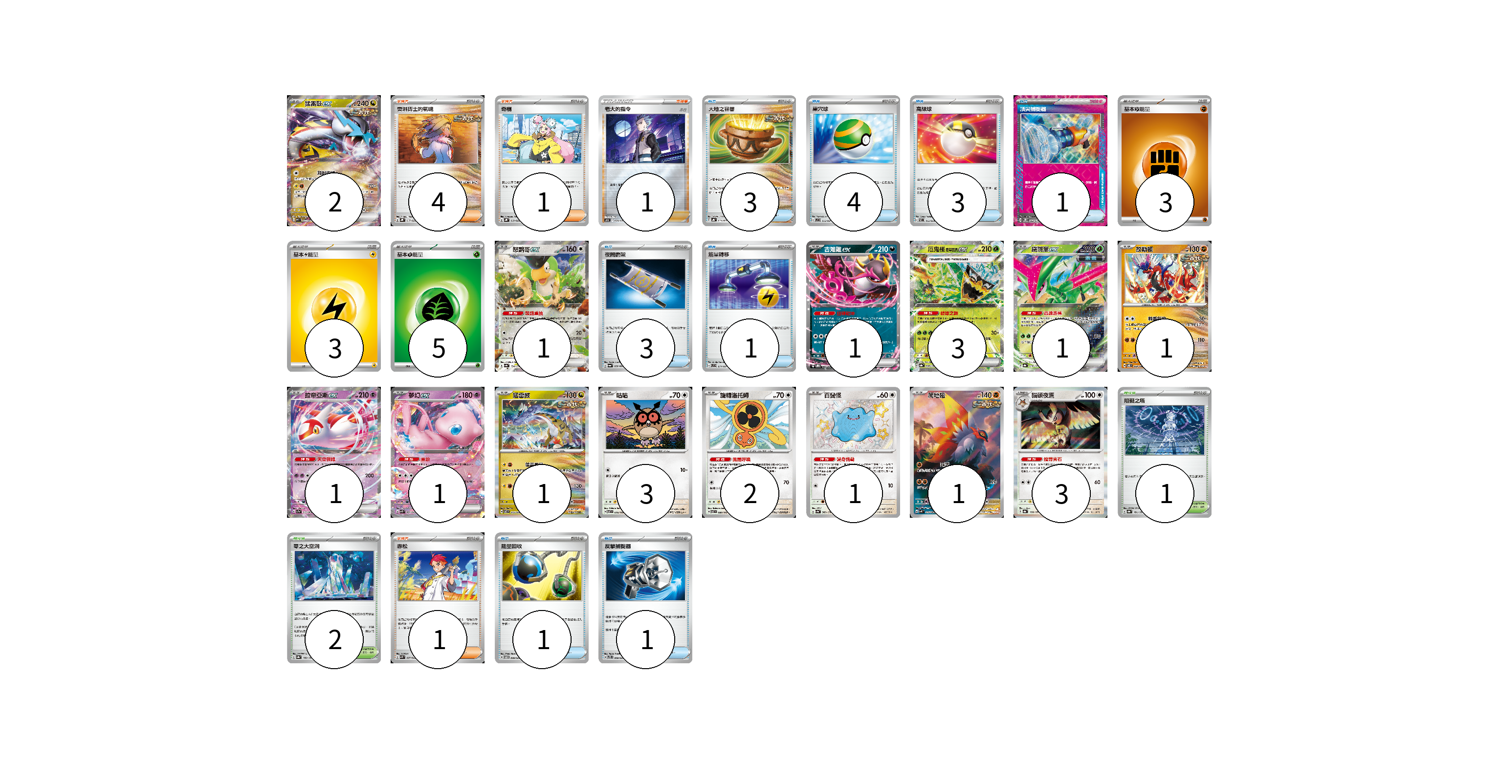 牌組構築方案 以此牌組為基礎新構築牌組 顯示卡面 顯示列表 寶可夢卡(22) 2 1 1 3 1 1 1 1 1 3 2 1 1 3 物品卡(17) 3 4 3 1 3 1 1 1 支援者卡(7) 4 1 1 1 競技場卡(3) 1 2 能量卡(11) 3 3 5 寶可夢卡(22) 卡牌名稱 張數 卡牌名稱 張數 猛雷鼓ex SV5K 053/071 02 怒鸚哥ex SV4a 154/190 01 吉雉雞ex SVOD 004/020 01 厄鬼椪 碧草面具ex SV8a 020/187 03 鐵斑葉ex SV8a 016/187 01 故勒頓 SV8 069/106 01 拉帝亞斯ex SV7a 019/064 01 夢幻ex SVK 001/042 01 猛雷鼓 SV7 075/102 01 咕咕 SV7 076/102 03 旋轉洛托姆 SV7 080/102 02 百變怪 SV4a 309/190 01 爬地翅 SV4K 074/066 01 貓頭夜鷹 SV8a 128/187 03 物品卡(17) 卡牌名稱 張數 卡牌名稱 張數 大地之容器 SVHK 011/022 03 巢穴球 SVC 013/021 04 高級球 SVEL 012/020 03 頂尖捕捉器 SV5M 062/071 01 夜間擔架 SV6a 056/064 03 能量轉移 SVC 011/021 01 能量回收 SVTM 009/022 01 反擊捕捉器 SVTS 009/022 01 支援者卡(7) 卡牌名稱 張數 卡牌名稱 張數 奧琳博士的氣魄 SVHK 017/022 04 奇樹 SVHK 019/022 01 老大的指令(赤日) SO 028/030 01 赤松 SVK 027/042 01 競技場卡(3) 卡牌名稱 張數 卡牌名稱 張數 阻礙之塔 SV8a 181/187 01 零之大空洞 SV8a 182/187 02 能量卡(11) 卡牌名稱 張數 卡牌名稱 張數 基本【鬥】能量 SVHK FIG 03 基本【雷】能量 SVHM LIG 03 基本草能量 sv-p GRA 05 以此牌組為基礎新構築牌組 牌組編碼 hSOnbK-FCJMDj-bGovut copy 列印牌組單 牌組編碼已複製 分享至SNS