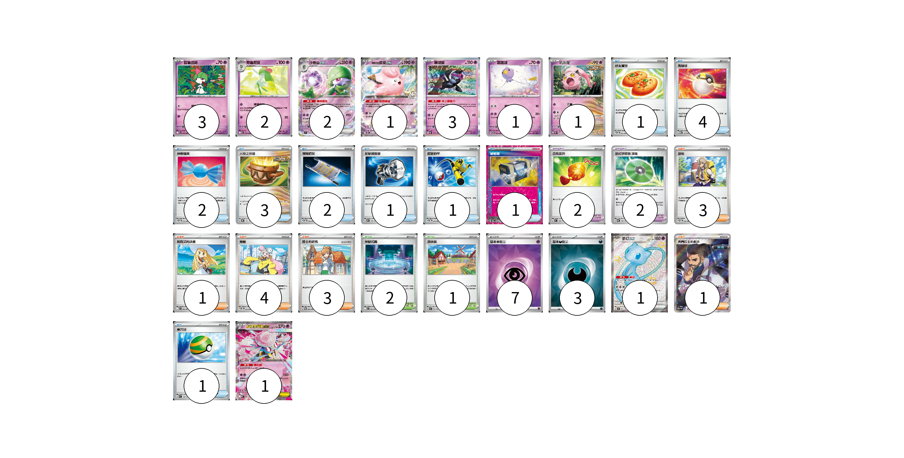 牌組構築方案 以此牌組為基礎新構築牌組 顯示卡面 顯示列表 寶可夢卡(15) 3 2 2 1 3 1 1 1 1 寶可夢道具(4) 2 2 物品卡(16) 1 4 2 3 2 1 1 1 1 支援者卡(12) 3 1 4 3 1 競技場卡(3) 2 1 能量卡(10) 7 3 寶可夢卡(15) 卡牌名稱 張數 卡牌名稱 張數 拉魯拉絲 M1S 040/063 03 奇魯莉安 M1S 041/063 02 沙奈朵ex SV1S 028/078 02 莉莉艾的皮皮ex SV9 033/100 01 願增猿 SV8a 075/187 03 飄飄球 SVTS 005/022 01 吼叫尾 SV8a 071/187 01 夢幻ex SV4a 327/190 01 超級蒂安希ex MBD 006/022 01 寶可夢道具(4) 卡牌名稱 張數 卡牌名稱 張數 勇氣護符 SVM 142/175 02 招式學習器 演進 SV8a 160/187 02 物品卡(16) 卡牌名稱 張數 卡牌名稱 張數 好友寶芬 SVOD 011/020 01 高級球 SVQL 015/022 04 神奇糖果 SVOD 013/020 02 大地之容器 SV8a 143/187 03 夜間擔架 SVOM 016/021 02 反擊捕捉器 SV8a 139/187 01 厲害釣竿 SVOD 010/020 01 秘密箱 SV6 092/101 01 巢穴球 SVM 133/175 01 支援者卡(12) 卡牌名稱 張數 卡牌名稱 張數 派帕 SVOD 018/020 03 莉莉艾的決意 M1L 062/063 01 奇樹 SVOD 016/020 04 博士的研究 SV11B 084/086 03 弗圖博士的劇本 SV4M 086/066 01 競技場卡(3) 卡牌名稱 張數 卡牌名稱 張數 神秘花園 M1S 063/063 02 深缽鎮 SVK 039/042 01 能量卡(10) 卡牌名稱 張數 卡牌名稱 張數 基本【超】能量 SVOD PSY 07 基本【惡】能量 SVOM DAR 03 以此牌組為基礎新構築牌組 牌組編碼 hSgQhE-goAsMV-sHzuVs copy 列印牌組單 牌組編碼已複製 分享至SNS