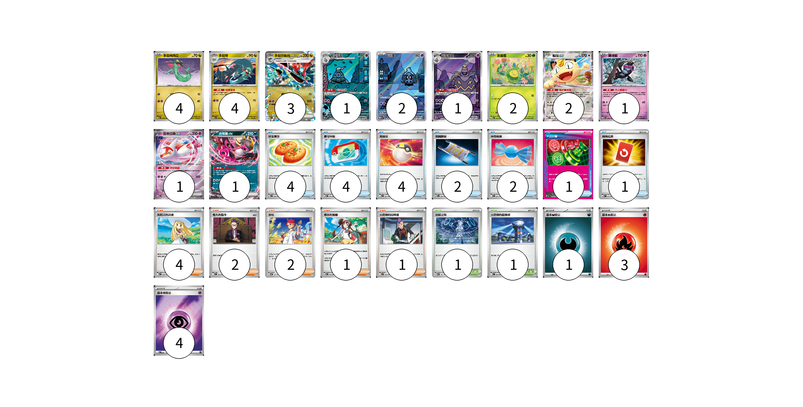 牌組構築方案 以此牌組為基礎新構築牌組 顯示卡面 顯示列表 寶可夢卡(22) 4 4 3 1 2 1 2 2 1 1 1 物品卡(18) 4 4 4 2 2 1 1 支援者卡(10) 4 2 2 1 1 競技場卡(2) 1 1 能量卡(8) 1 3 4 寶可夢卡(22) 卡牌名稱 張數 卡牌名稱 張數 多龍梅西亞 MC 546/742 04 多龍奇 MC 547/742 04 多龍巴魯托ex MC 548/742 03 彷徨夜靈 SV6a 069/064 01 夜巡靈 SV6a 068/064 02 黑夜魔靈 SV6a 070/064 01 含羞苞 M2a 011/193 02 喵喵ex M3 061/080 02 願增猿 MC 358/742 01 拉帝亞斯ex MC 312/742 01 吉雉雞ex MC 489/742 01 物品卡(18) 卡牌名稱 張數 卡牌名稱 張數 好友寶芬 MC 648/742 04 寶可平板 M3 070/080 04 高級球 MC 651/742 04 夜間擔架 MC 670/742 02 神奇糖果 MC 655/742 02 不公印章 MC 633/742 01 特殊紅牌 M4 072/083 01 支援者卡(10) 卡牌名稱 張數 卡牌名稱 張數 莉莉艾的決意 MC 729/742 04 老大的指令 MC 724/742 02 赤松 SV8a 163/187 02 鳴依的勉勵 M3 075/080 01 火箭隊的拉姆達 MC 734/742 01 競技場卡(2) 卡牌名稱 張數 卡牌名稱 張數 阻礙之塔 SV8a 181/187 01 火箭隊的監視塔 SV10 096/098 01 能量卡(8) 卡牌名稱 張數 卡牌名稱 張數 基本【惡】能量 MC DAR 01 基本【火】能量 MC FIR 03 基本【超】能量 MC PSY 04 以此牌組為基礎新構築牌組 牌組編碼 hTxZwd-aNaVvB-anILgA copy 列印牌組單 牌組編碼已複製 分享至SNS