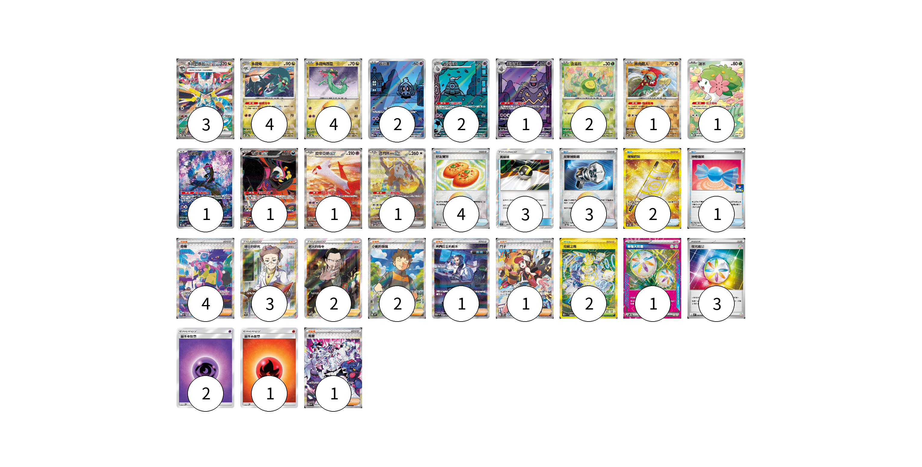 牌組構築方案 以此牌組為基礎新構築牌組 顯示卡面 顯示列表 寶可夢卡(24) 3 4 4 2 2 1 2 1 1 1 1 1 1 物品卡(13) 4 3 3 2 1 支援者卡(14) 4 3 2 2 1 1 1 競技場卡(2) 2 能量卡(7) 1 3 2 1 寶可夢卡(24) 卡牌名稱 張數 卡牌名稱 張數 多龍巴魯托ex SV8a 221/187 03 多龍奇 SV8a 119/187 04 多龍梅西亞 SV8a 118/187 04 夜巡靈 SV6a 068/064 02 彷徨夜靈 SV6a 069/064 02 黑夜魔靈 SV6a 070/064 01 含羞苞 SV8a 001/187 02 摔角鷹人 SV8a 084/187 01 謝米 SV9a 066/063 01 願增猿 SV6 107/101 01 吉雉雞ex SV6a 089/064 01 拉帝亞斯ex SV7a 087/064 01 月月熊 赫月 ex SV5a 091/066 01 物品卡(13) 卡牌名稱 張數 卡牌名稱 張數 好友寶芬 SV8a 147/187 04 高級球 AS5b 178/186 03 反擊捕捉器 SV8a 139/187 03 夜間擔架 SV8 137/106 02 神奇糖果 SV-P 104/SV-P 01 支援者卡(14) 卡牌名稱 張數 卡牌名稱 張數 奇樹 SV4a 350/190 04 博士的研究(木蘭博士) SC1a 168/154 03 老大的指令(坂木) SC1b 170/153 02 小剛的發掘 SV9 123/100 02 弗圖博士的劇本 SV4M 091/066 01 鬥子 SV11W 173/086 01 枇琶 SV5K 096/071 01 競技場卡(2) 卡牌名稱 張數 卡牌名稱 張數 阻礙之塔 SV10 132/098 02 能量卡(7) 卡牌名稱 張數 卡牌名稱 張數 新衝天能量 SV5K 071/071 01 夜光能量 SVK 042/042 03 基本超能量 AS6D PSY 02 基本火能量 AS6D FIR 01 以此牌組為基礎新構築牌組 牌組編碼 hVMloF-aLxGgG-NvJzTU copy 列印牌組單 牌組編碼已複製 分享至SNS