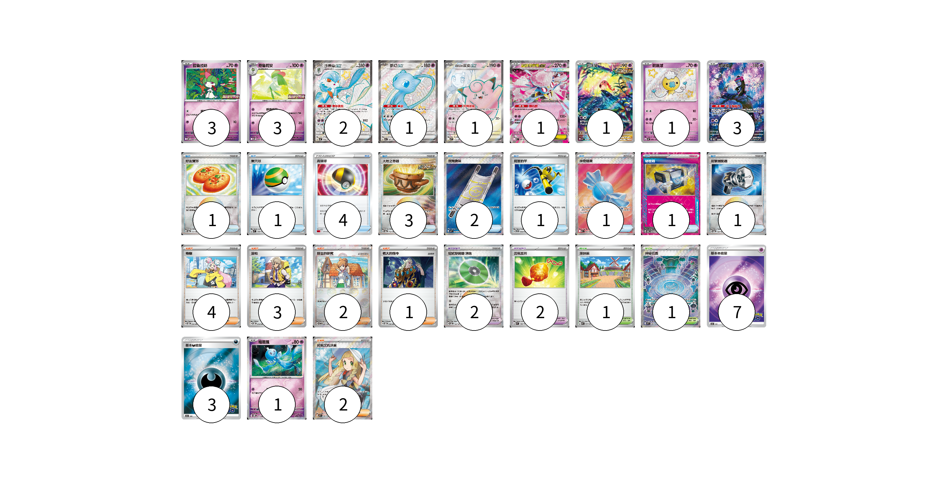 牌組構築方案 以此牌組為基礎新構築牌組 顯示卡面 顯示列表 寶可夢卡(17) 3 3 2 1 1 1 1 1 3 1 寶可夢道具(4) 2 2 物品卡(15) 1 1 4 3 2 1 1 1 1 支援者卡(12) 4 3 2 1 2 競技場卡(2) 1 1 能量卡(10) 7 3 寶可夢卡(17) 卡牌名稱 張數 卡牌名稱 張數 拉魯拉絲 M-P 005/M-P 03 奇魯莉安 M-P 006/M-P 03 沙奈朵ex SV4a 328/190 02 夢幻ex SV4a 327/190 01 莉莉艾的皮皮ex SV9 115/100 01 超級蒂安希ex MBD 006/022 01 吼叫尾 SV4K 071/066 01 飄飄球 SV4a 260/190 01 願增猿 SV6 107/101 03 輕飄飄 SV11W 041/086 01 寶可夢道具(4) 卡牌名稱 張數 卡牌名稱 張數 招式學習器 演進 SV8a 160/187 02 勇氣護符 SVM 142/175 02 物品卡(15) 卡牌名稱 張數 卡牌名稱 張數 好友寶芬 SV8a 147/187 01 巢穴球 SVM 133/175 01 高級球 SDL 014/021 04 大地之容器 SV8a 143/187 03 夜間擔架 M1L 083/063 02 厲害釣竿 SVTH 008/018 01 神奇糖果 M1S 082/063 01 秘密箱 SV6 092/101 01 反擊捕捉器 SV8a 139/187 01 支援者卡(12) 卡牌名稱 張數 卡牌名稱 張數 奇樹 SVOD 016/020 04 派帕 SVOD 018/020 03 博士的研究 SV11B 084/086 02 老大的指令 SVOD 019/020 01 莉莉艾的決意 M1L 086/063 02 競技場卡(2) 卡牌名稱 張數 卡牌名稱 張數 深缽鎮 SVK 039/042 01 神秘花園 M1S 086/063 01 能量卡(10) 卡牌名稱 張數 卡牌名稱 張數 基本超能量 S10b PSY 07 基本惡能量 S10b DAR 03 以此牌組為基礎新構築牌組 牌組編碼 hWzMqK-fBFzmN-AbZARN copy 列印牌組單 牌組編碼已複製 分享至SNS