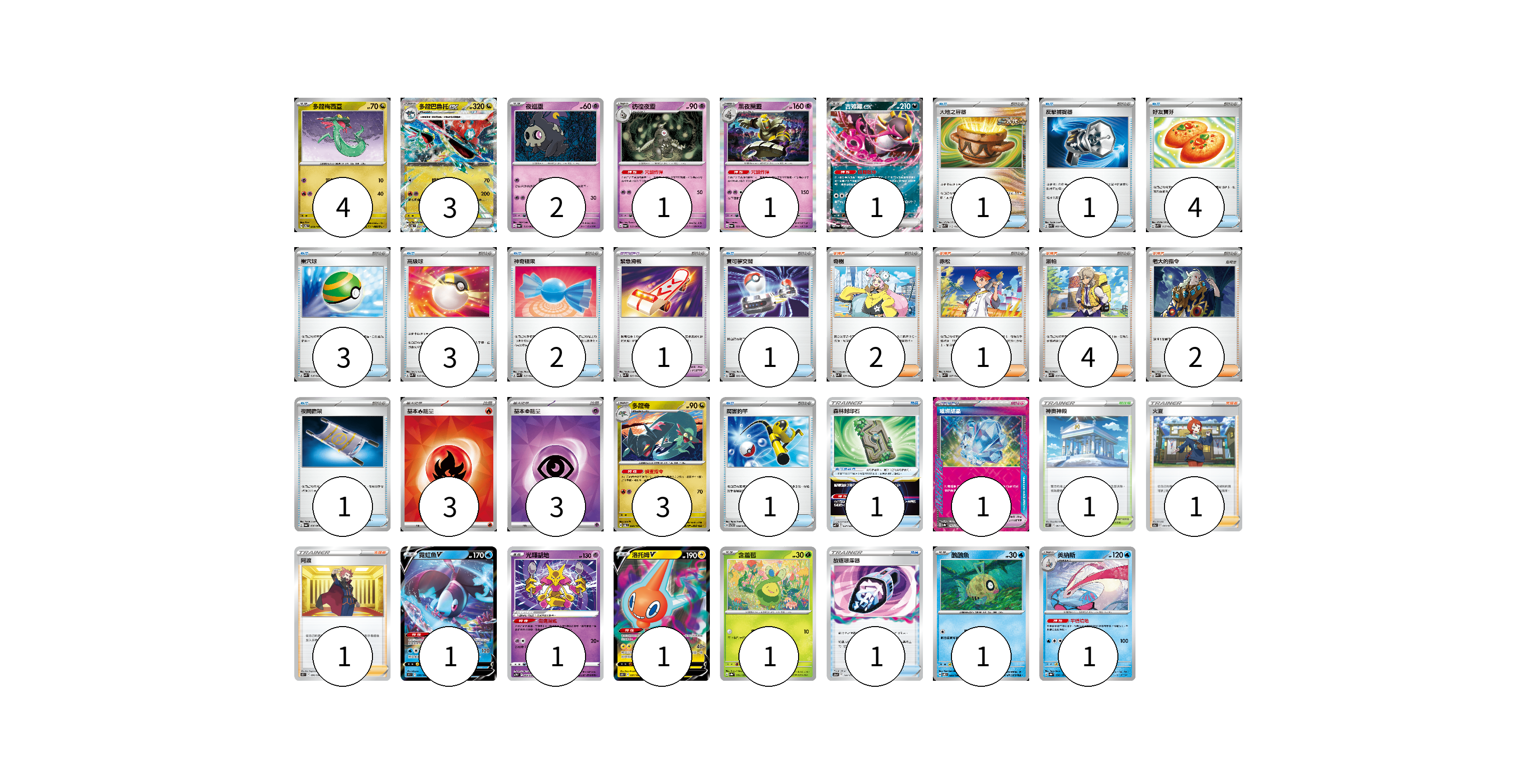牌組構築方案 以此牌組為基礎新構築牌組 顯示卡面 顯示列表 寶可夢卡(21) 4 3 2 1 1 1 3 1 1 1 1 1 1 寶可夢道具(2) 1 1 物品卡(19) 1 1 4 3 3 2 1 1 1 1 1 支援者卡(11) 2 1 4 2 1 1 競技場卡(1) 1 能量卡(6) 3 3 寶可夢卡(21) 卡牌名稱 張數 卡牌名稱 張數 多龍梅西亞 SV6 079/101 04 多龍巴魯托ex SV6 081/101 03 夜巡靈 SV6a 018/064 02 彷徨夜靈 SV6a 019/064 01 黑夜魔靈 SV6a 020/064 01 吉雉雞ex SV6a 038/064 01 多龍奇 SV6 080/101 03 霓虹魚V S9 030/100 01 光輝胡地 SVTM 006/022 01 洛托姆V S11 037/100 01 含羞苞 SV8a 001/187 01 醜醜魚 SV8 025/106 01 美納斯 SV8a 036/187 01 寶可夢道具(2) 卡牌名稱 張數 卡牌名稱 張數 緊急滑板 SVK 023/042 01 璀璨結晶 SV8a 152/187 01 物品卡(19) 卡牌名稱 張數 卡牌名稱 張數 大地之容器 SVK 012/042 01 反擊捕捉器 SVK 009/042 01 好友寶芬 SVK 015/042 04 巢穴球 SVK 016/042 03 高級球 SVK 018/042 03 神奇糖果 SVK 019/042 02 寶可夢交替 SVK 022/042 01 夜間擔架 SV6a 056/064 01 厲害釣竿 SVTG 009/019 01 森林封印石 SVF 024/038 01 放逐吸塵器 S12a 144/172 01 支援者卡(11) 卡牌名稱 張數 卡牌名稱 張數 奇樹 SVK 031/042 02 赤松 SVK 027/042 01 派帕 SVK 035/042 04 老大的指令 SVK 036/042 02 火夏 S10a 069/071 01 阿渡 S12 096/098 01 競技場卡(1) 卡牌名稱 張數 卡牌名稱 張數 神奧神殿 S10P 067/067 01 能量卡(6) 卡牌名稱 張數 卡牌名稱 張數 基本【火】能量 SVK FIR 03 基本【超】能量 SVK PSY 03 以此牌組為基礎新構築牌組 牌組編碼 hXDQmr-ozjiVy-BiWKVT copy 列印牌組單 牌組編碼已複製 分享至SNS