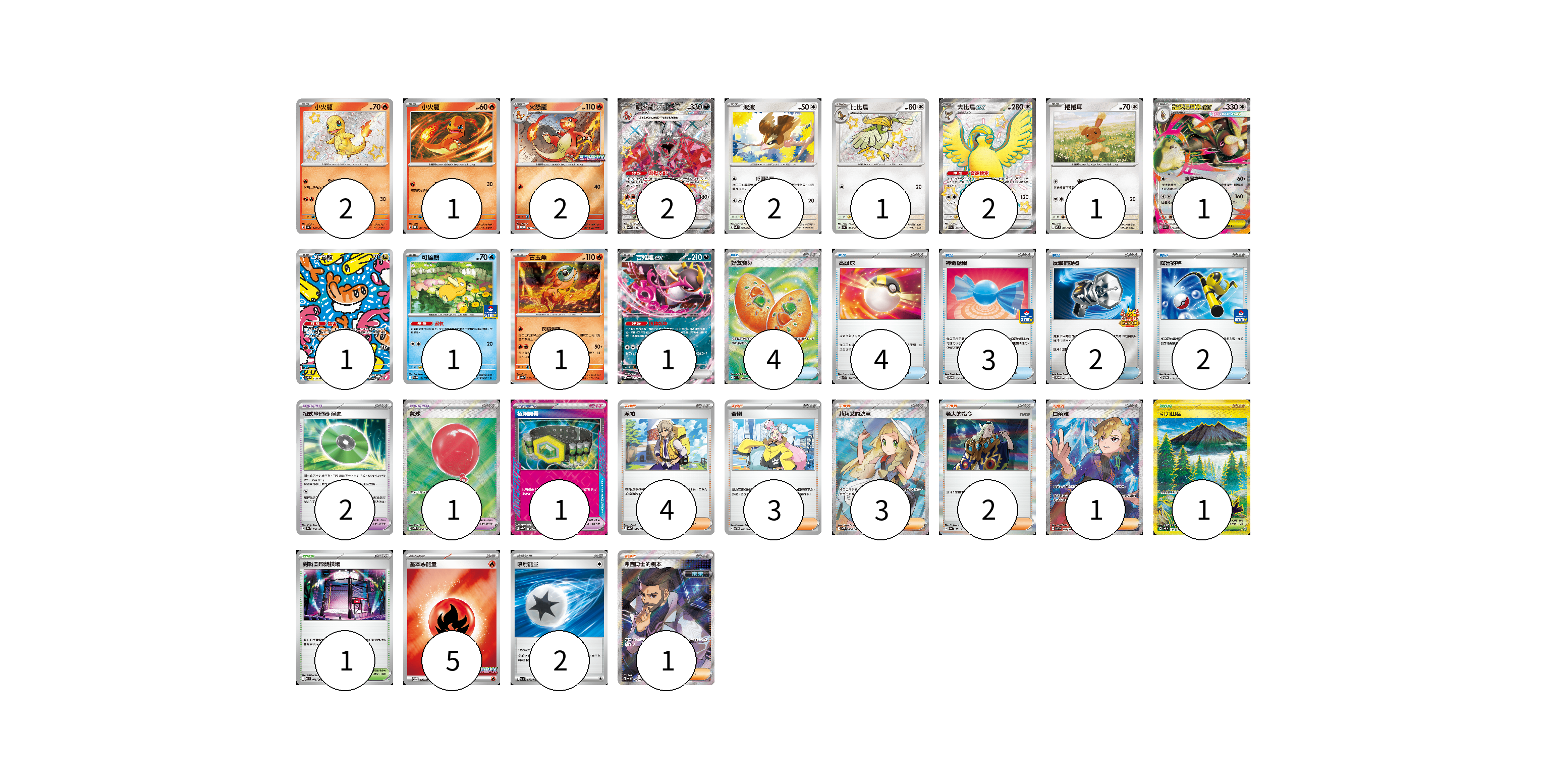 牌組構築方案 以此牌組為基礎新構築牌組 顯示卡面 顯示列表 寶可夢卡(18) 2 1 2 2 2 1 2 1 1 1 1 1 1 寶可夢道具(4) 2 1 1 物品卡(15) 4 4 3 2 2 支援者卡(14) 4 3 3 2 1 1 競技場卡(2) 1 1 能量卡(7) 5 2 寶可夢卡(18) 卡牌名稱 張數 卡牌名稱 張數 小火龍 SV4a 210/190 02 小火龍 SVQL 001/022 01 火恐龍 M-P 021/M-P 02 噴火龍ex SV4a 331/190 02 波波 SVK 003/042 02 比比鳥 SV4a 305/190 01 大比鳥ex SV4a 335/190 02 捲捲耳 M2 071/080 01 超級長耳兔ex M2 072/080 01 米立龍 SV6 112/101 01 可達鴨 SV-P 220/SV-P 01 古玉魚 SV8a 025/187 01 吉雉雞ex SV6a 038/064 01 寶可夢道具(4) 卡牌名稱 張數 卡牌名稱 張數 招式學習器 演進 SV8a 160/187 02 氣球 M1L 084/063 01 極限腰帶 SV8a 159/187 01 物品卡(15) 卡牌名稱 張數 卡牌名稱 張數 好友寶芬 M1S 081/063 04 高級球 SVK 018/042 04 神奇糖果 SV-P 104/SV-P 03 反擊捕捉器 SV-P 083/SV-P 02 厲害釣竿 SV-P 112/SV-P 02 支援者卡(14) 卡牌名稱 張數 卡牌名稱 張數 派帕 SV4a 180/190 04 奇樹 SVTH 015/018 03 莉莉艾的決意 M1L 086/063 03 老大的指令 SV4a 181/190 02 白蕾雅 SV7 126/102 01 弗圖博士的劇本 SV4M 086/066 01 競技場卡(2) 卡牌名稱 張數 卡牌名稱 張數 引力山岳 SV8 138/106 01 對戰圓形競技場 M2 079/080 01 能量卡(7) 卡牌名稱 張數 卡牌名稱 張數 基本【火】能量 M-P 032/M-P 05 噴射能量 SV1a 072/073 02 以此牌組為基礎新構築牌組 牌組編碼 hYhGwf-JtwAYR-gsKyoe copy 列印牌組單 牌組編碼已複製 分享至SNS