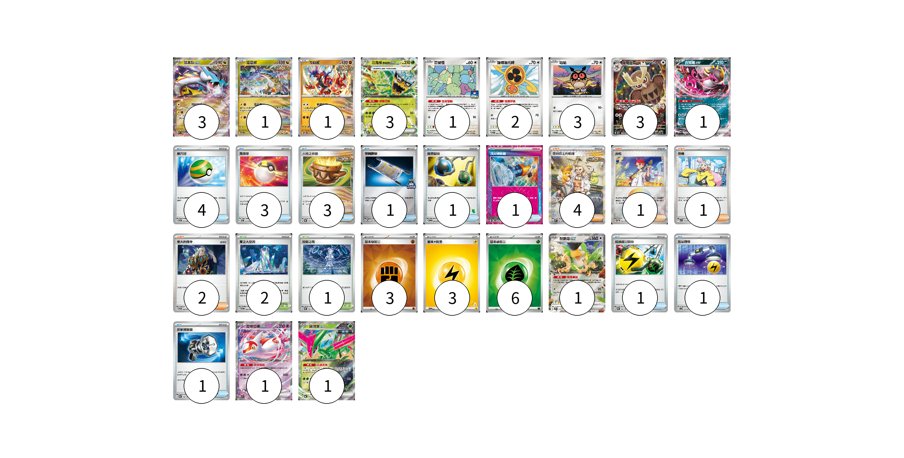 牌組構築方案 以此牌組為基礎新構築牌組 顯示卡面 顯示列表 寶可夢卡(21) 3 1 1 3 1 2 3 3 1 1 1 1 物品卡(16) 4 3 3 1 1 1 1 1 1 支援者卡(8) 4 1 1 2 競技場卡(3) 2 1 能量卡(12) 3 3 6 寶可夢卡(21) 卡牌名稱 張數 卡牌名稱 張數 猛雷鼓ex SV5K 053/071 03 猛雷鼓 SV7 075/102 01 故勒頓 SV8 069/106 01 厄鬼椪 碧草面具ex SV8a 020/187 03 百變怪 SV-P 111/SV-P 01 旋轉洛托姆 SV7 080/102 02 咕咕 SV7 076/102 03 貓頭夜鷹 SV7 114/102 03 吉雉雞ex SV6a 038/064 01 怒鸚哥ex SV2P 065/071 01 拉帝亞斯ex SV7a 019/064 01 鐵斑葉ex SV8a 016/187 01 物品卡(16) 卡牌名稱 張數 卡牌名稱 張數 巢穴球 SVTS 013/022 04 高級球 SVEL 012/020 03 大地之容器 SV8a 143/187 03 夜間擔架 SV-P 204/SV-P 01 能量回收 SVI 049/066 01 頂尖捕捉器 SV5M 062/071 01 超級能量回收 SV8a 141/187 01 能量轉移 SVC 011/021 01 反擊捕捉器 SV8a 139/187 01 支援者卡(8) 卡牌名稱 張數 卡牌名稱 張數 奧琳博士的氣魄 SV4K 091/066 04 赤松 SV8a 163/187 01 奇樹 SVHM 018/022 01 老大的指令 SVTS 020/022 02 競技場卡(3) 卡牌名稱 張數 卡牌名稱 張數 零之大空洞 SV7 102/102 02 阻礙之塔 SV8a 181/187 01 能量卡(12) 卡牌名稱 張數 卡牌名稱 張數 基本【鬥】能量 SVK FIG 03 基本【雷】能量 SVI LIG 03 基本【草】能量 SVK GRA 06 以此牌組為基礎新構築牌組 牌組編碼 hYpOov-UaKHMd-CssPjA copy 列印牌組單 牌組編碼已複製 分享至SNS