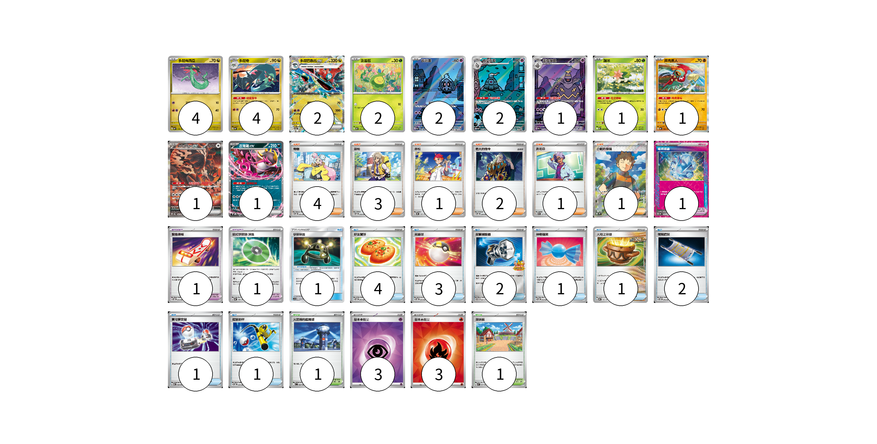 牌組構築方案 以此牌組為基礎新構築牌組 顯示卡面 顯示列表 寶可夢卡(21) 4 4 2 2 2 2 1 1 1 1 1 寶可夢道具(4) 1 1 1 1 物品卡(15) 4 3 2 1 1 2 1 1 支援者卡(12) 4 3 1 2 1 1 競技場卡(2) 1 1 能量卡(6) 3 3 寶可夢卡(21) 卡牌名稱 張數 卡牌名稱 張數 多龍梅西亞 SV8a 118/187 04 多龍奇 SV8a 119/187 04 多龍巴魯托ex SV6 081/101 02 含羞苞 SV8a 001/187 02 夜巡靈 SV6a 068/064 02 彷徨夜靈 SV6a 069/064 02 黑夜魔靈 SV6a 070/064 01 謝米 SV9a 006/063 01 摔角鷹人 SV8a 084/187 01 月月熊 赫月ex SV8a 225/187 01 吉雉雞ex SVOD 004/020 01 寶可夢道具(4) 卡牌名稱 張數 卡牌名稱 張數 璀璨結晶 SV8a 152/187 01 緊急滑板 SVOD 015/020 01 招式學習器 演進 SV8a 160/187 01 學習裝置 AC1b 140/158 01 物品卡(15) 卡牌名稱 張數 卡牌名稱 張數 好友寶芬 SVOD 011/020 04 高級球 SVOD 012/020 03 反擊捕捉器 SV-P 083/SV-P 02 神奇糖果 SVOD 013/020 01 大地之容器 SV8a 143/187 01 夜間擔架 SVOM 016/021 02 寶可夢交替 SV9a 058/063 01 厲害釣竿 SVOD 010/020 01 支援者卡(12) 卡牌名稱 張數 卡牌名稱 張數 奇樹 SVOD 016/020 04 派帕 SVOD 018/020 03 赤松 SV8a 163/187 01 老大的指令 SVOD 019/020 02 吉尼亞 SVAL 017/021 01 小剛的發掘 SV9 123/100 01 競技場卡(2) 卡牌名稱 張數 卡牌名稱 張數 火箭隊的監視塔 SV10 096/098 01 深缽鎮 SVK 039/042 01 能量卡(6) 卡牌名稱 張數 卡牌名稱 張數 基本【超】能量 SVOD PSY 03 基本【火】能量 SVM FIR 03 以此牌組為基礎新構築牌組 牌組編碼 haNvzF-gCNcyu-QhsvlH copy 列印牌組單 牌組編碼已複製 分享至SNS