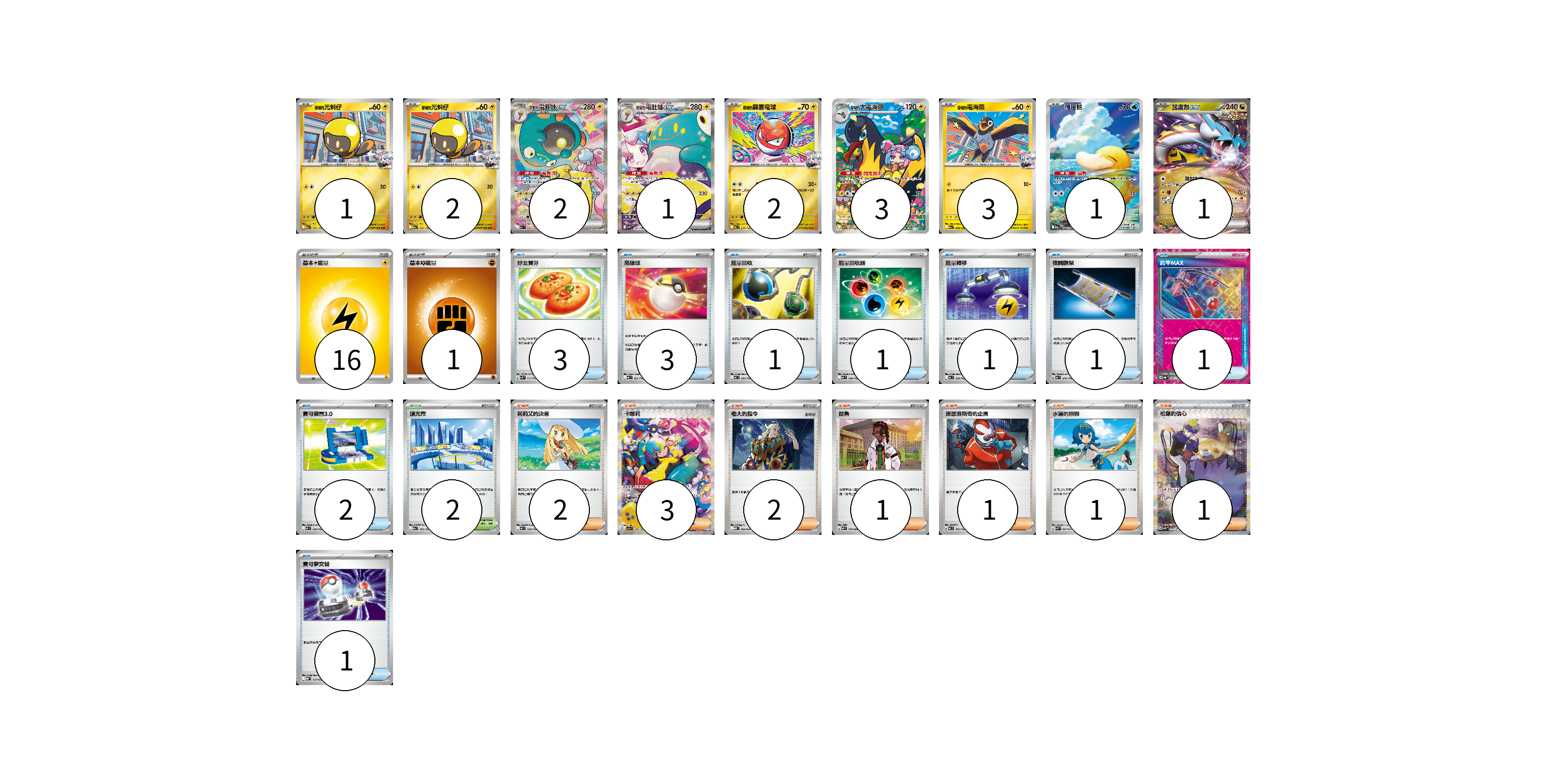 牌組構築方案 以此牌組為基礎新構築牌組 顯示卡面 顯示列表 寶可夢卡(16) 1 2 2 1 2 3 3 1 1 物品卡(14) 3 3 1 1 1 1 1 2 1 支援者卡(11) 2 3 2 1 1 1 1 競技場卡(2) 2 能量卡(17) 16 1 寶可夢卡(16) 卡牌名稱 張數 卡牌名稱 張數 奇樹的光蚪仔 M2a 056/193 01 奇樹的光蚪仔 M2a 056/193 02 奇樹的電肚蛙ex M2a 236/193 02 奇樹的電肚蛙ex SV9 125/100 01 <奇樹的>霹靂電球 MC 234/742 02 奇樹的大電海燕 SV9 104/100 03 奇樹的電海燕 M2a 058/193 03 可達鴨 M2a 199/193 01 猛雷鼓ex MC 554/742 01 物品卡(14) 卡牌名稱 張數 卡牌名稱 張數 好友寶芬 SVK 015/042 03 高級球 MC 651/742 03 能量回收 MC 636/742 01 能量回收器 MC 640/742 01 能量轉移 MC 638/742 01 夜間擔架 MC 670/742 01 釣竿MAX SV8a 142/187 01 寶可裝置3.0 MC 660/742 02 寶可夢交替 MBG 015/022 01 支援者卡(11) 卡牌名稱 張數 卡牌名稱 張數 莉莉艾的決意 MC 729/742 02 卡娜莉 M2a 248/193 03 老大的指令 MBD 020/022 02 琵魯 M3 074/080 01 庫瑟洛斯奇的企圖 MC 705/742 01 水蓮的照顧 SVK 028/042 01 松葉的信心 SV5K 097/071 01 競技場卡(2) 卡牌名稱 張數 卡牌名稱 張數 釀光市 M2a 185/193 02 能量卡(17) 卡牌名稱 張數 卡牌名稱 張數 基本【雷】能量 MJ LIG 16 基本【鬥】能量 MC FIG 01 以此牌組為基礎新構築牌組 牌組編碼 hcRlaR-WWURjv-QvspPf copy 列印牌組單 牌組編碼已複製 分享至SNS