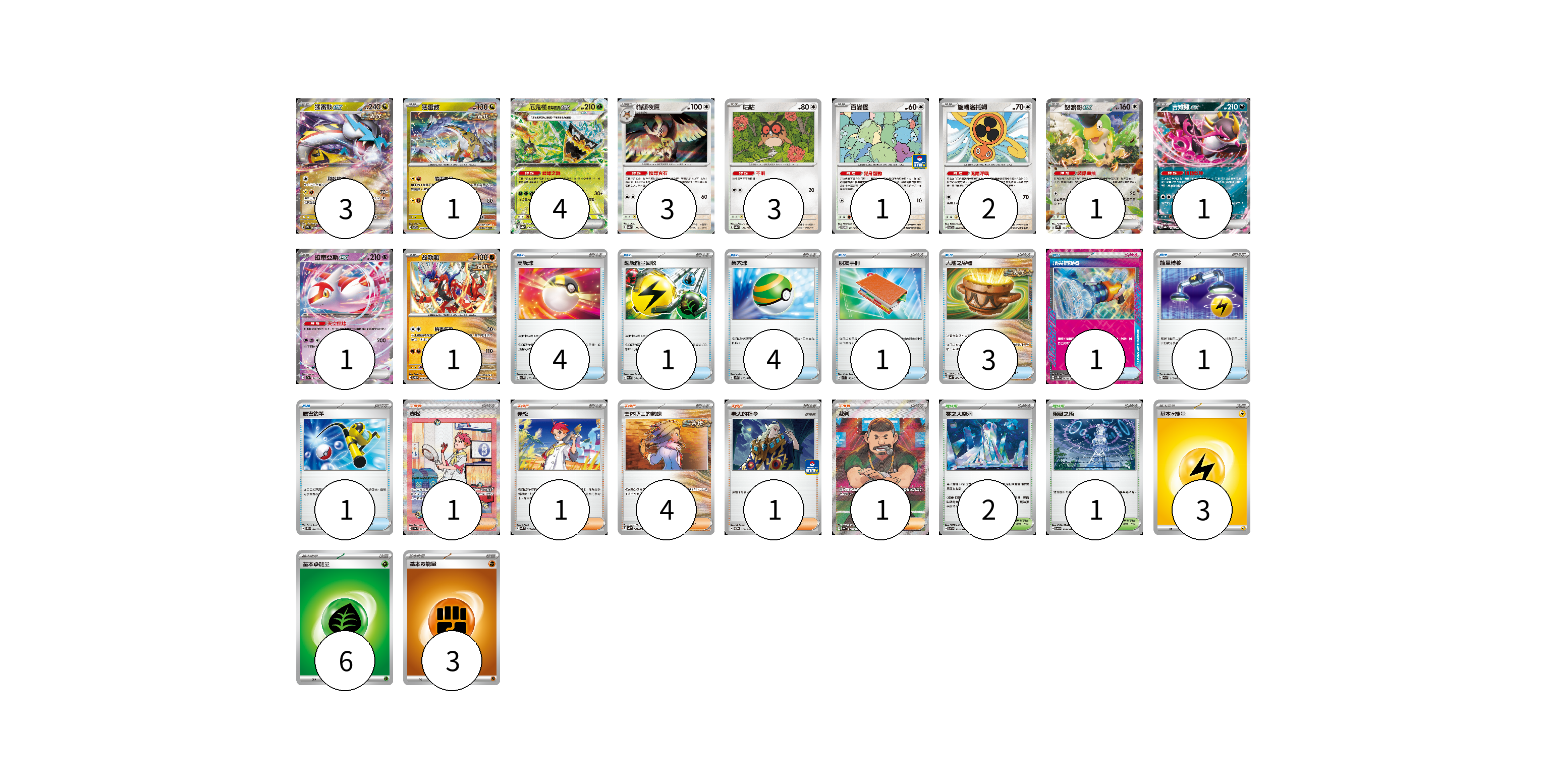 牌組構築方案 以此牌組為基礎新構築牌組 顯示卡面 顯示列表 寶可夢卡(22) 3 1 4 3 3 1 2 1 1 1 1 1 物品卡(15) 4 1 4 1 3 1 1 支援者卡(8) 1 1 4 1 1 競技場卡(3) 2 1 能量卡(12) 3 6 3 寶可夢卡(22) 卡牌名稱 張數 卡牌名稱 張數 猛雷鼓ex SV5K 053/071 03 猛雷鼓 SV7 075/102 01 厄鬼椪 碧草面具ex SV8a 020/187 04 貓頭夜鷹 SV8a 128/187 03 咕咕 SV8a 127/187 03 百變怪 SV-P 111/SV-P 01 旋轉洛托姆 SV7 080/102 02 怒鸚哥ex SV2P 065/071 01 吉雉雞ex SV8a 104/187 01 拉帝亞斯ex SV7a 019/064 01 故勒頓 SV8 069/106 01 厲害釣竿 SVEL 010/020 01 物品卡(15) 卡牌名稱 張數 卡牌名稱 張數 高級球 SV1V 070/078 04 超級能量回收 SV1a 064/073 01 巢穴球 SV1S 070/078 04 朋友手冊 SV1S 069/078 01 大地之容器 SV4K 060/066 03 頂尖捕捉器 SV5M 062/071 01 能量轉移 SVAM 012/023 01 支援者卡(8) 卡牌名稱 張數 卡牌名稱 張數 赤松 SV8a 227/187 01 赤松 SVK 027/042 01 奧琳博士的氣魄 SV4K 064/066 04 老大的指令 SV-P 178/SV-P 01 裁判 SV4a 342/190 01 競技場卡(3) 卡牌名稱 張數 卡牌名稱 張數 零之大空洞 SV7 102/102 02 阻礙之塔 SV6 100/101 01 能量卡(12) 卡牌名稱 張數 卡牌名稱 張數 基本雷能量 sv-p LIG 03 基本草能量 sv-p GRA 06 基本【鬥】能量 SVAM FIG 03 以此牌組為基礎新構築牌組 牌組編碼 hdBhMT-MJnYiZ-WixmfW copy 列印牌組單 牌組編碼已複製 分享至SNS