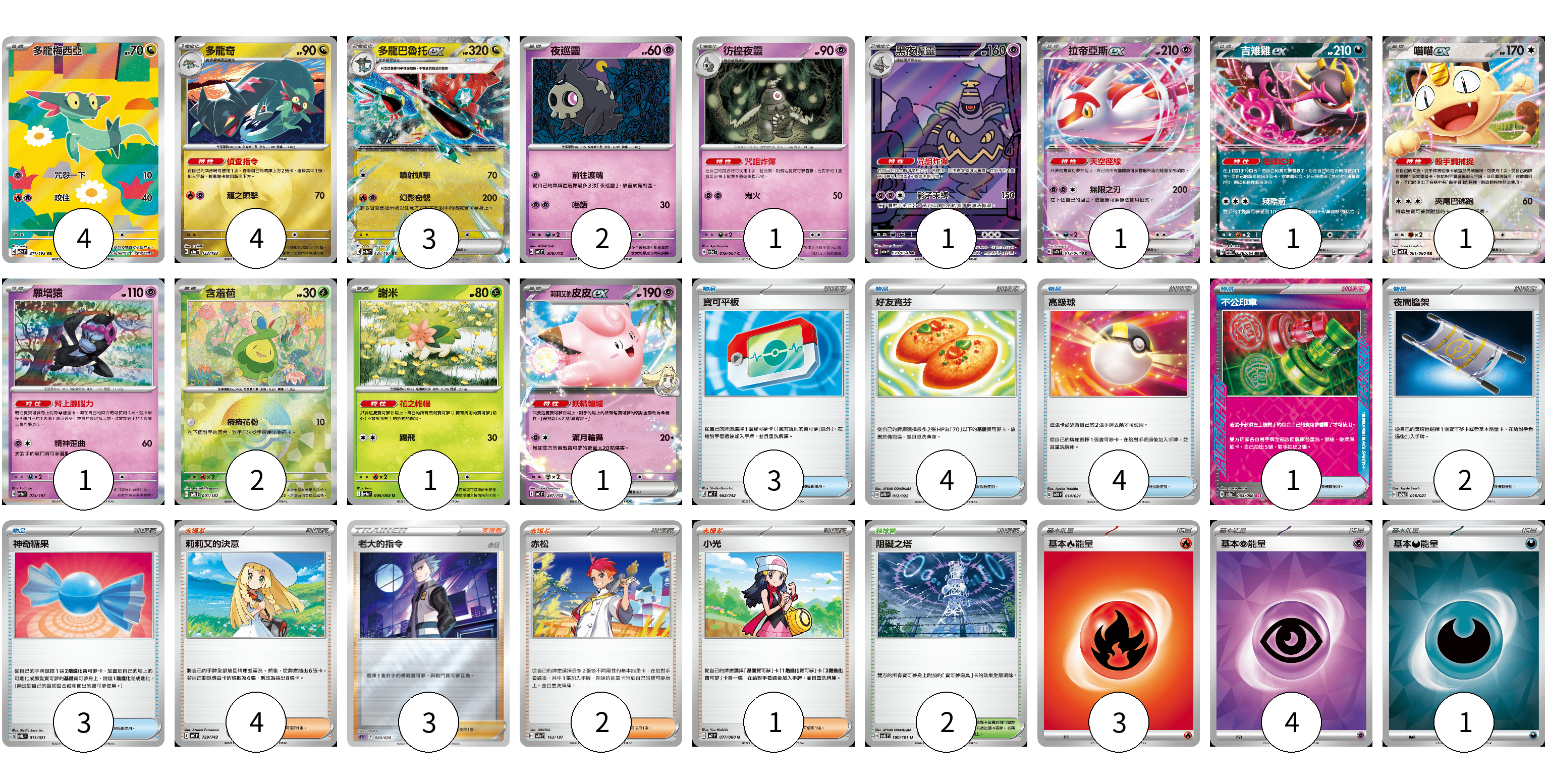 牌組構築方案 以此牌組為基礎新構築牌組 顯示卡面 顯示列表 寶可夢卡(23) 4 4 3 2 1 1 1 1 1 1 2 1 1 物品卡(17) 3 4 4 1 2 3 支援者卡(10) 4 3 2 1 競技場卡(2) 2 能量卡(8) 3 4 1 寶可夢卡(23) 卡牌名稱 張數 卡牌名稱 張數 多龍梅西亞 M2a 211/193 04 多龍奇 M2a 133/193 04 多龍巴魯托ex SV8a 120/187 03 夜巡靈 MC 308/742 02 彷徨夜靈 SV6a 019/064 01 黑夜魔靈 SV6a 070/064 01 拉帝亞斯ex SV7a 019/064 01 吉雉雞ex SV6a 038/064 01 喵喵ex M3 061/080 01 願增猿 SV8a 075/187 01 含羞苞 SV8a 001/187 02 謝米 SV9a 006/063 01 <莉莉艾的>皮皮ex MC 287/742 01 物品卡(17) 卡牌名稱 張數 卡牌名稱 張數 寶可平板 MC 662/742 03 好友寶芬 SVTS 012/022 04 高級球 SVTR 014/021 04 不公印章 SV5a 053/066 01 夜間擔架 SVOM 016/021 02 神奇糖果 SVTL 013/021 03 支援者卡(10) 卡牌名稱 張數 卡牌名稱 張數 莉莉艾的決意 MC 729/742 04 老大的指令(赤日) SPD 020/020 03 赤松 SV8a 163/187 02 小光 M2 077/080 01 競技場卡(2) 卡牌名稱 張數 卡牌名稱 張數 阻礙之塔 SV6 100/101 02 能量卡(8) 卡牌名稱 張數 卡牌名稱 張數 基本【火】能量 SVTL FIR 03 基本【超】能量 SVM PSY 04 基本【惡】能量 SVM DAR 01 以此牌組為基礎新構築牌組 牌組編碼 heSjiM-hOjbsF-DVzkaC copy 列印牌組單 牌組編碼已複製 分享至SNS