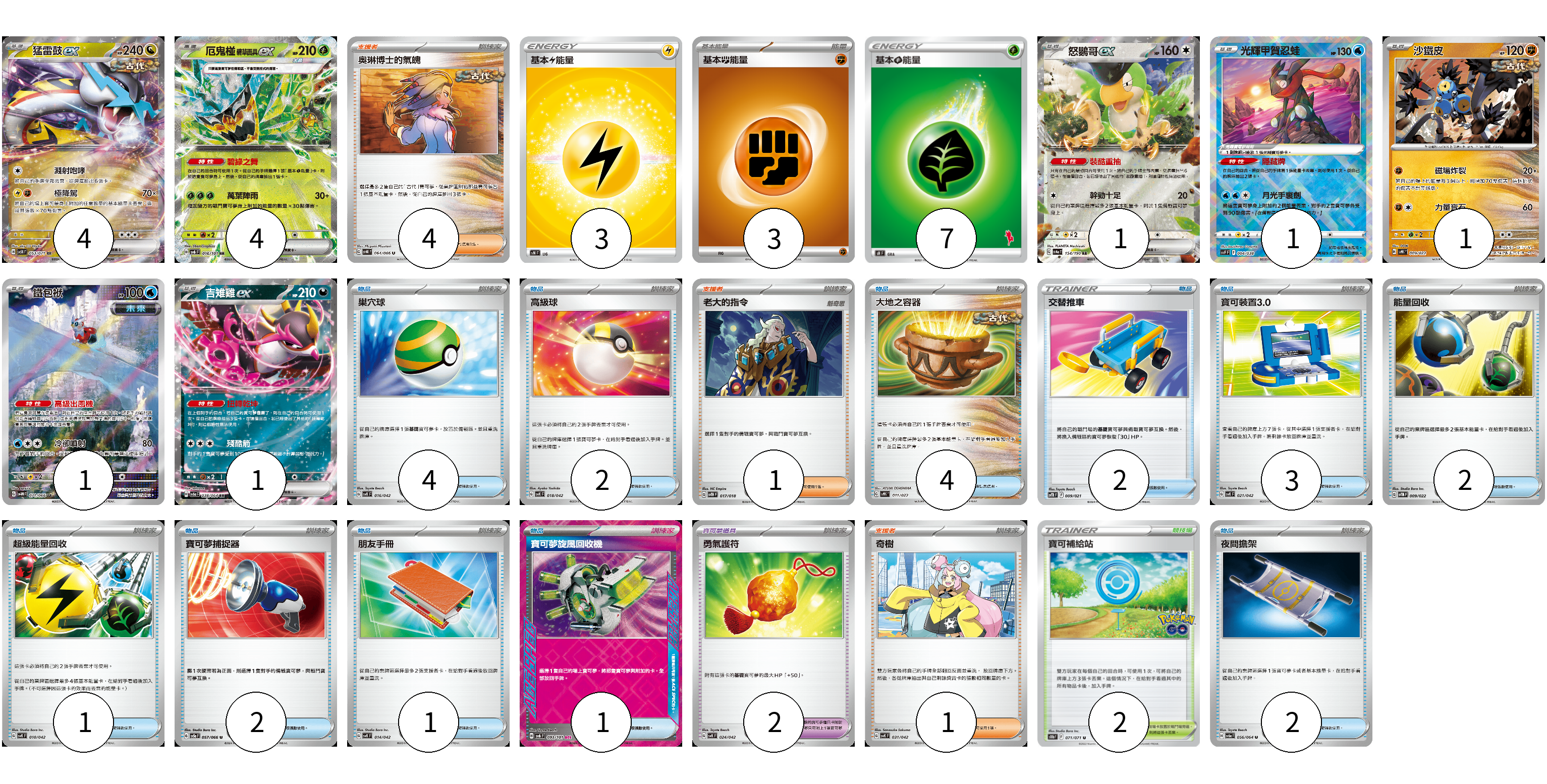 牌組構築方案 以此牌組為基礎新構築牌組 顯示卡面 顯示列表 寶可夢卡(13) 4 4 1 1 1 1 1 寶可夢道具(2) 2 物品卡(24) 4 2 4 2 3 2 1 2 1 1 2 支援者卡(6) 4 1 1 競技場卡(2) 2 能量卡(13) 3 3 7 寶可夢卡(13) 卡牌名稱 張數 卡牌名稱 張數 猛雷鼓ex SV5K 053/071 04 厄鬼椪 碧草面具ex SV6 016/101 04 怒鸚哥ex SV4a 154/190 01 光輝甲賀忍蛙 SVF 004/038 01 沙鐵皮 SVHK 009/022 01 鐵包袱 SV4M 071/066 01 吉雉雞ex SV6a 038/064 01 寶可夢道具(2) 卡牌名稱 張數 卡牌名稱 張數 勇氣護符 SVK 024/042 02 物品卡(24) 卡牌名稱 張數 卡牌名稱 張數 巢穴球 SVK 016/042 04 高級球 SVK 018/042 02 大地之容器 SVHK 011/022 04 交替推車 SVTR 009/021 02 寶可裝置3.0 SVK 021/042 03 能量回收 SVTM 009/022 02 超級能量回收 SVK 010/042 01 寶可夢捕捉器 SV5a 057/066 02 朋友手冊 SVK 014/042 01 寶可夢旋風回收機 SV6 093/101 01 夜間擔架 SV6a 056/064 02 支援者卡(6) 卡牌名稱 張數 卡牌名稱 張數 奧琳博士的氣魄 SV4K 064/066 04 老大的指令 SVTH 017/018 01 奇樹 SVK 031/042 01 競技場卡(2) 卡牌名稱 張數 卡牌名稱 張數 寶可補給站 S10b 071/071 02 能量卡(13) 卡牌名稱 張數 卡牌名稱 張數 基本雷能量 SN LIG 03 基本【鬥】能量 SVAM FIG 03 基本草能量 SH GRA 07 以此牌組為基礎新構築牌組 牌組編碼 hgKMZT-htalUc-dFlsXg copy 列印牌組單 牌組編碼已複製 分享至SNS