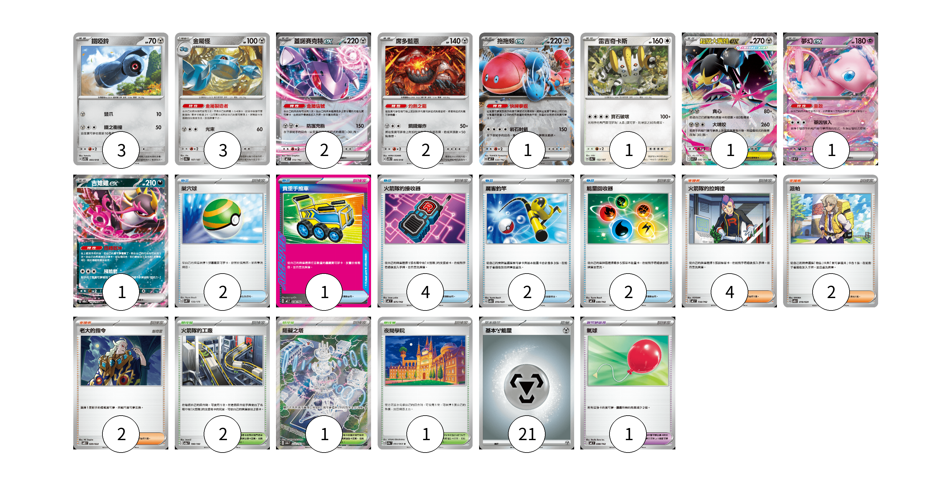 牌組構築方案 以此牌組為基礎新構築牌組 顯示卡面 顯示列表 寶可夢卡(15) 3 3 2 2 1 1 1 1 1 寶可夢道具(1) 1 物品卡(11) 2 1 4 2 2 支援者卡(8) 4 2 2 競技場卡(4) 2 1 1 能量卡(21) 21 寶可夢卡(15) 卡牌名稱 張數 卡牌名稱 張數 鐵啞鈴 SVTH 003/018 03 金屬怪 SV8a 107/187 03 蓋諾賽克特ex MC 512/742 02 席多藍恩 SVTH 005/018 02 拖拖蚓ex MC 533/742 01 雷吉奇卡斯 SV8a 132/187 01 超級大嘴娃ex M1L 046/063 01 夢幻ex SVK 001/042 01 吉雉雞ex M2a 114/193 01 寶可夢道具(1) 卡牌名稱 張數 卡牌名稱 張數 氣球 MC 688/742 01 物品卡(11) 卡牌名稱 張數 卡牌名稱 張數 巢穴球 SVM 133/175 02 貴重手推車 MC 658/742 01 火箭隊的接收器 MC 675/742 04 厲害釣竿 SVOD 010/020 02 能量回收器 MC 640/742 02 支援者卡(8) 卡牌名稱 張數 卡牌名稱 張數 火箭隊的拉姆達 MC 734/742 04 派帕 SVOD 018/020 02 老大的指令 MBD 020/022 02 競技場卡(4) 卡牌名稱 張數 卡牌名稱 張數 火箭隊的工廠 M2a 190/193 02 阻礙之塔 M2a 222/193 01 夜間學院 SV6a 064/064 01 能量卡(21) 卡牌名稱 張數 卡牌名稱 張數 基本【鋼】能量 MC MET 21 以此牌組為基礎新構築牌組 牌組編碼 hgXmvI-DAeVwk-hdvtXq copy 列印牌組單 牌組編碼已複製 分享至SNS