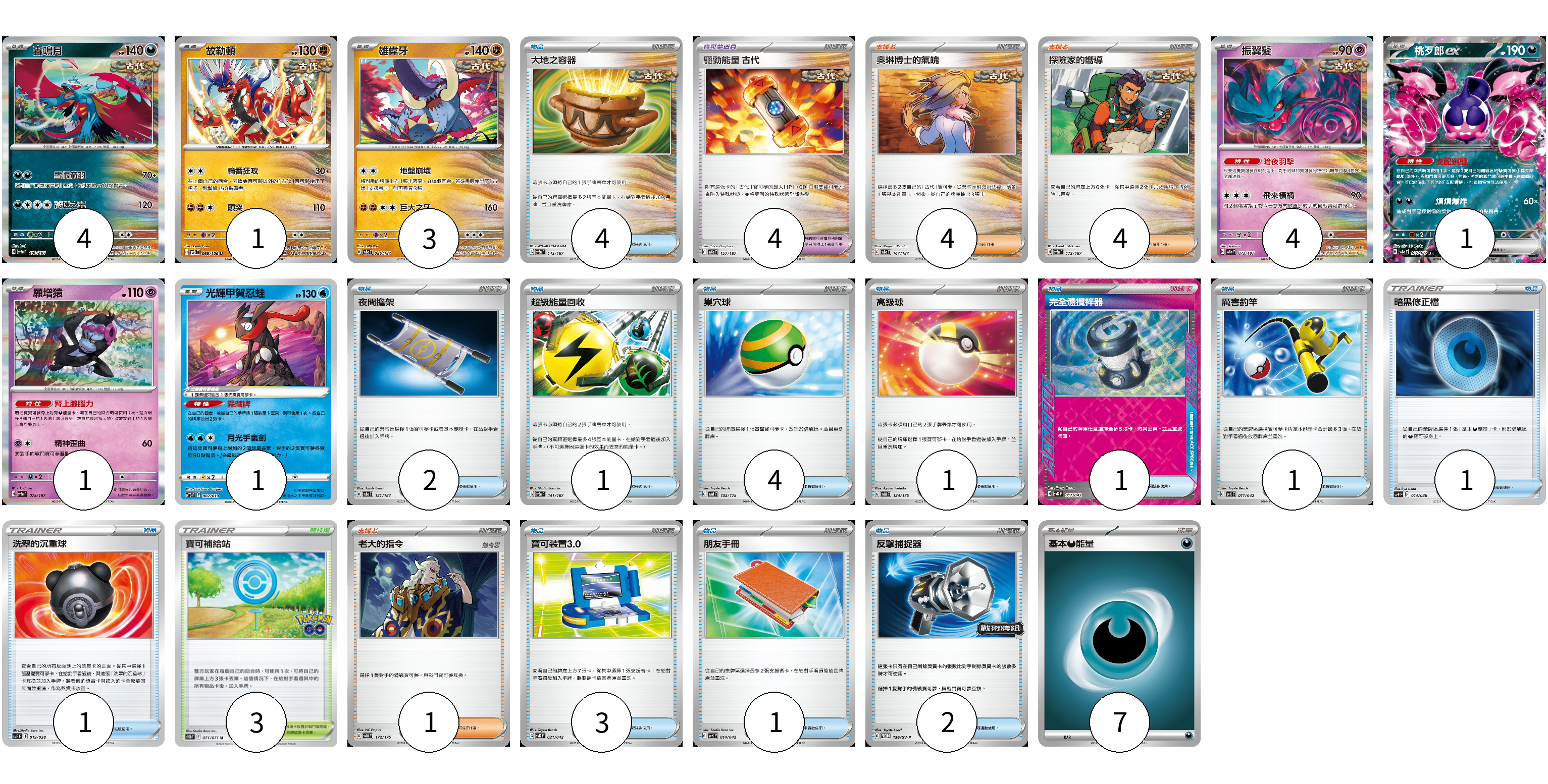 牌組構築方案 以此牌組為基礎新構築牌組 顯示卡面 顯示列表 寶可夢卡(15) 4 1 3 4 1 1 1 寶可夢道具(4) 4 物品卡(22) 4 2 1 4 1 1 1 1 1 3 1 2 支援者卡(9) 4 4 1 競技場卡(3) 3 能量卡(7) 7 寶可夢卡(15) 卡牌名稱 張數 卡牌名稱 張數 轟鳴月 SV8a 100/187 04 故勒頓 SV8 069/106 01 雄偉牙 SV8a 086/187 03 振翼髮 SV8a 072/187 04 桃歹郎ex SV8a 105/187 01 願增猿 SV8a 075/187 01 光輝甲賀忍蛙 SVTG 002/019 01 寶可夢道具(4) 卡牌名稱 張數 卡牌名稱 張數 驅勁能量 古代 SV8a 157/187 04 物品卡(22) 卡牌名稱 張數 卡牌名稱 張數 大地之容器 SV8a 143/187 04 夜間擔架 SV8a 151/187 02 超級能量回收 SV8a 141/187 01 巢穴球 SVM 133/175 04 高級球 SVM 134/175 01 完全體攪拌器 SVK 017/042 01 厲害釣竿 SVK 011/042 01 暗黑修正檔 SVF 014/038 01 洗翠的沉重球 SVF 019/038 01 寶可裝置3.0 SVK 021/042 03 朋友手冊 SVK 014/042 01 反擊捕捉器 SV-P 136/SV-P 02 支援者卡(9) 卡牌名稱 張數 卡牌名稱 張數 奧琳博士的氣魄 SV8a 167/187 04 探險家的嚮導 SV8a 172/187 04 老大的指令 SVM 172/175 01 競技場卡(3) 卡牌名稱 張數 卡牌名稱 張數 寶可補給站 S10b 071/071 03 能量卡(7) 卡牌名稱 張數 卡牌名稱 張數 基本【惡】能量 SVD DAR 07 以此牌組為基礎新構築牌組 牌組編碼 hhbGUA-AHIGdm-yJYLtD copy 列印牌組單 牌組編碼已複製 分享至SNS