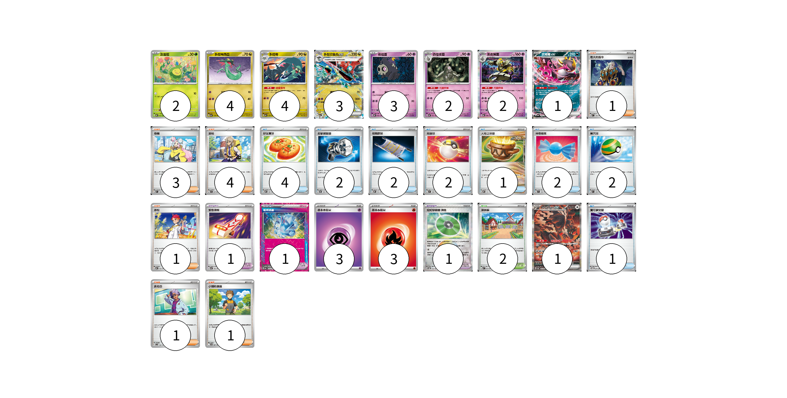 牌組構築方案 以此牌組為基礎新構築牌組 顯示卡面 顯示列表 寶可夢卡(22) 2 4 4 3 3 2 2 1 1 寶可夢道具(3) 1 1 1 物品卡(16) 4 2 2 2 1 2 2 1 支援者卡(11) 1 3 4 1 1 1 競技場卡(2) 2 能量卡(6) 3 3 寶可夢卡(22) 卡牌名稱 張數 卡牌名稱 張數 含羞苞 SV8a 001/187 02 多龍梅西亞 SV8a 118/187 04 多龍奇 SV8a 119/187 04 多龍巴魯托ex SV8a 120/187 03 夜巡靈 SV8a 064/187 03 彷徨夜靈 SV8a 065/187 02 黑夜魔靈 SV8a 066/187 02 吉雉雞ex SV8a 104/187 01 月月熊 赫月ex SV8a 225/187 01 寶可夢道具(3) 卡牌名稱 張數 卡牌名稱 張數 緊急滑板 SV8a 153/187 01 璀璨結晶 SV8a 152/187 01 招式學習器 演進 SV8a 160/187 01 物品卡(16) 卡牌名稱 張數 卡牌名稱 張數 好友寶芬 SV8a 147/187 04 反擊捕捉器 SV8a 139/187 02 夜間擔架 SV8a 151/187 02 高級球 SVM 134/175 02 大地之容器 SV8a 143/187 01 神奇糖果 SVM 135/175 02 巢穴球 SVM 133/175 02 寶可夢交替 SVOD 014/020 01 支援者卡(11) 卡牌名稱 張數 卡牌名稱 張數 老大的指令 SVM 172/175 01 奇樹 SVM 160/175 03 派帕 SVK 035/042 04 赤松 SV8a 163/187 01 吉尼亞 SVD 129/139 01 小剛的發掘 SV9 096/100 01 競技場卡(2) 卡牌名稱 張數 卡牌名稱 張數 深缽鎮 SVK 039/042 02 能量卡(6) 卡牌名稱 張數 卡牌名稱 張數 基本【超】能量 SVF PSY 03 基本【火】能量 SVF FIR 03 以此牌組為基礎新構築牌組 牌組編碼 hitQDO-kNPUMv-NSAruH copy 列印牌組單 牌組編碼已複製 分享至SNS