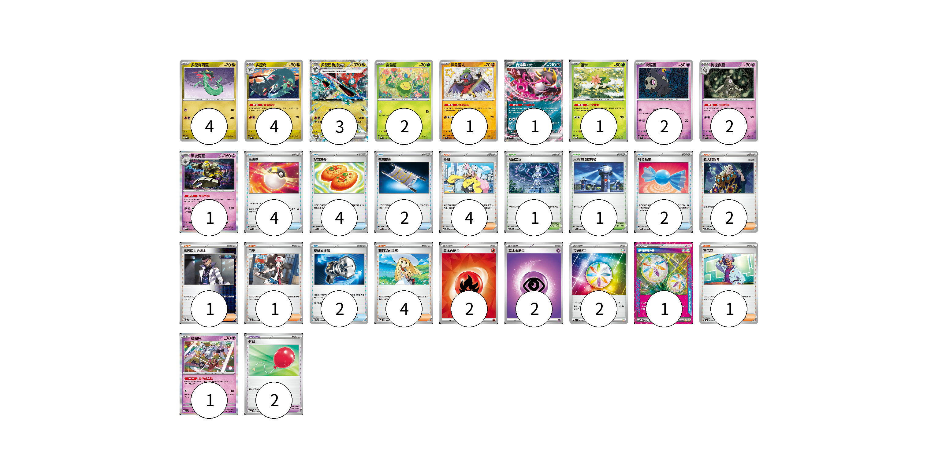 牌組構築方案 以此牌組為基礎新構築牌組 顯示卡面 顯示列表 寶可夢卡(22) 4 4 3 2 1 1 1 2 2 1 1 寶可夢道具(2) 2 物品卡(14) 4 4 2 2 2 支援者卡(13) 4 2 1 1 4 1 競技場卡(2) 1 1 能量卡(7) 2 2 2 1 寶可夢卡(22) 卡牌名稱 張數 卡牌名稱 張數 多龍梅西亞 SV8a 118/187 04 多龍奇 SV8a 119/187 04 多龍巴魯托ex SV8a 120/187 03 含羞苞 SV8a 001/187 02 摔角鷹人 SV4a 282/190 01 吉雉雞ex SV6a 038/064 01 謝米 SV9a 006/063 01 夜巡靈 SV6a 018/064 02 彷徨夜靈 SV6a 019/064 02 黑夜魔靈 SV6a 020/064 01 鑰圈兒 SV4a 087/190 01 寶可夢道具(2) 卡牌名稱 張數 卡牌名稱 張數 氣球 MBG 019/022 02 物品卡(14) 卡牌名稱 張數 卡牌名稱 張數 高級球 SVM 134/175 04 好友寶芬 MBD 013/022 04 夜間擔架 MBD 016/022 02 神奇糖果 MBG 013/022 02 反擊捕捉器 SVTS 009/022 02 支援者卡(13) 卡牌名稱 張數 卡牌名稱 張數 奇樹 SVOD 016/020 04 老大的指令 SVOD 019/020 02 弗圖博士的劇本 SV8a 175/187 01 鬥子 SV11W 085/086 01 莉莉艾的決意 MBD 021/022 04 吉尼亞 SVAL 017/021 01 競技場卡(2) 卡牌名稱 張數 卡牌名稱 張數 阻礙之塔 SV6 100/101 01 火箭隊的監視塔 SV10 096/098 01 能量卡(7) 卡牌名稱 張數 卡牌名稱 張數 基本【火】能量 SVQL FIR 02 基本【超】能量 MBD PSY 02 夜光能量 SV1a 073/073 02 新衝天能量 SV5K 071/071 01 以此牌組為基礎新構築牌組 牌組編碼 hmrssb-hBuypd-gXyBFq copy 列印牌組單 牌組編碼已複製 分享至SNS