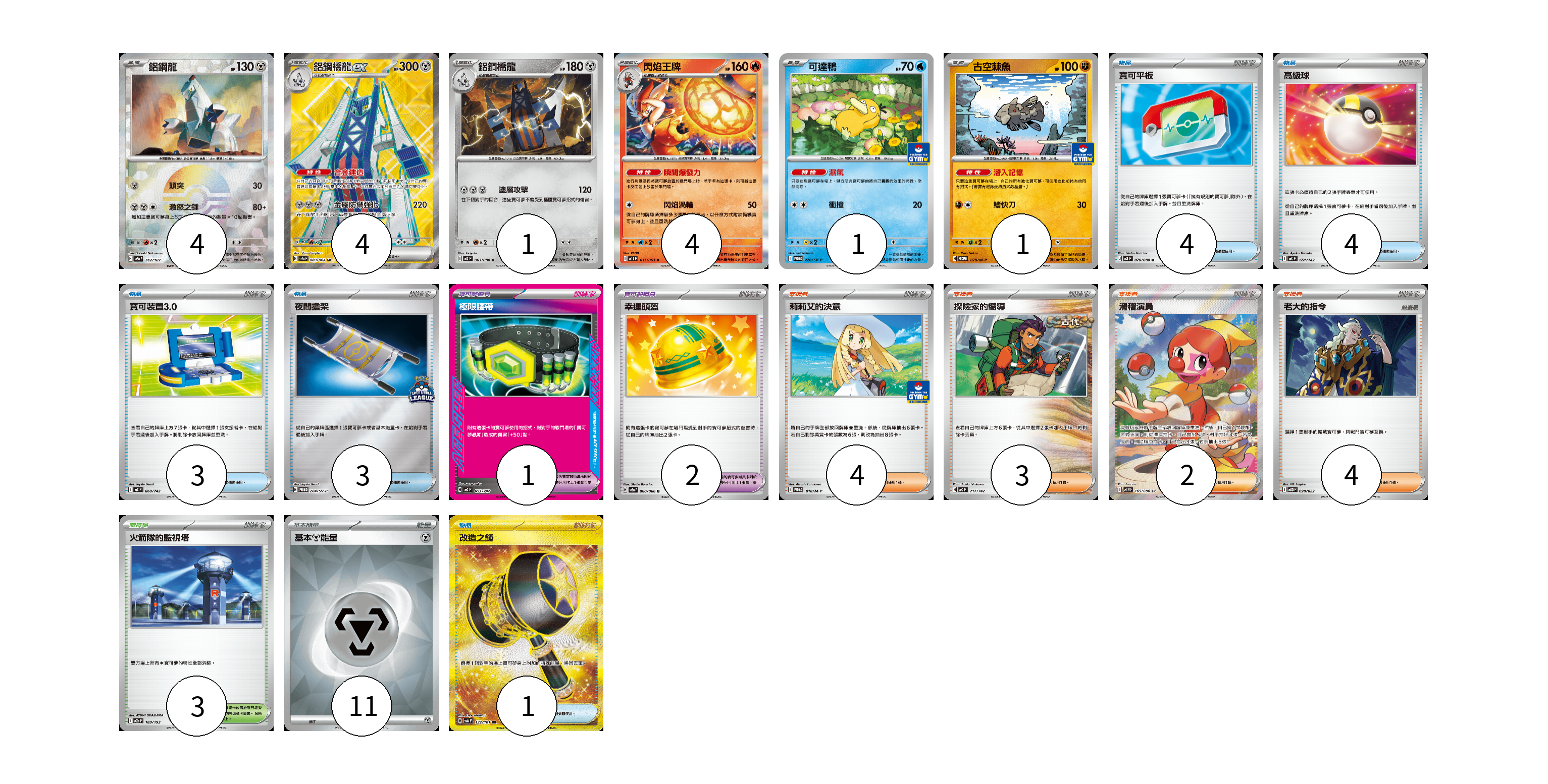 牌組構築方案 以此牌組為基礎新構築牌組 顯示卡面 顯示列表 寶可夢卡(15) 4 4 1 4 1 1 寶可夢道具(3) 1 2 物品卡(15) 4 4 3 3 1 支援者卡(13) 4 3 2 4 競技場卡(3) 3 能量卡(11) 11 寶可夢卡(15) 卡牌名稱 張數 卡牌名稱 張數 鋁鋼龍 SV8a 112/187 04 鋁鋼橋龍ex SV7a 080/064 04 鋁鋼橋龍 M2 063/080 01 閃焰王牌 M1L 017/063 04 可達鴨 SV-P 220/SV-P 01 古空棘魚 M-P 078/M-P 01 寶可夢道具(3) 卡牌名稱 張數 卡牌名稱 張數 極限腰帶 MC 691/742 01 幸運頭盔 SV5a 060/066 02 物品卡(15) 卡牌名稱 張數 卡牌名稱 張數 寶可平板 M3 070/080 04 高級球 MC 651/742 04 寶可裝置3.0 MC 660/742 03 夜間擔架 SV-P 204/SV-P 03 改造之錘 SV6 132/101 01 支援者卡(13) 卡牌名稱 張數 卡牌名稱 張數 莉莉艾的決意 M-P 018/M-P 04 探險家的嚮導 MC 717/742 03 滑稽演員 SV11W 165/086 02 老大的指令 MBD 020/022 04 競技場卡(3) 卡牌名稱 張數 卡牌名稱 張數 火箭隊的監視塔 M2a 189/193 03 能量卡(11) 卡牌名稱 張數 卡牌名稱 張數 基本【鋼】能量 SVM MET 11 以此牌組為基礎新構築牌組 牌組編碼 hnDGaT-FkqAmE-VBliJp copy 列印牌組單 牌組編碼已複製 分享至SNS