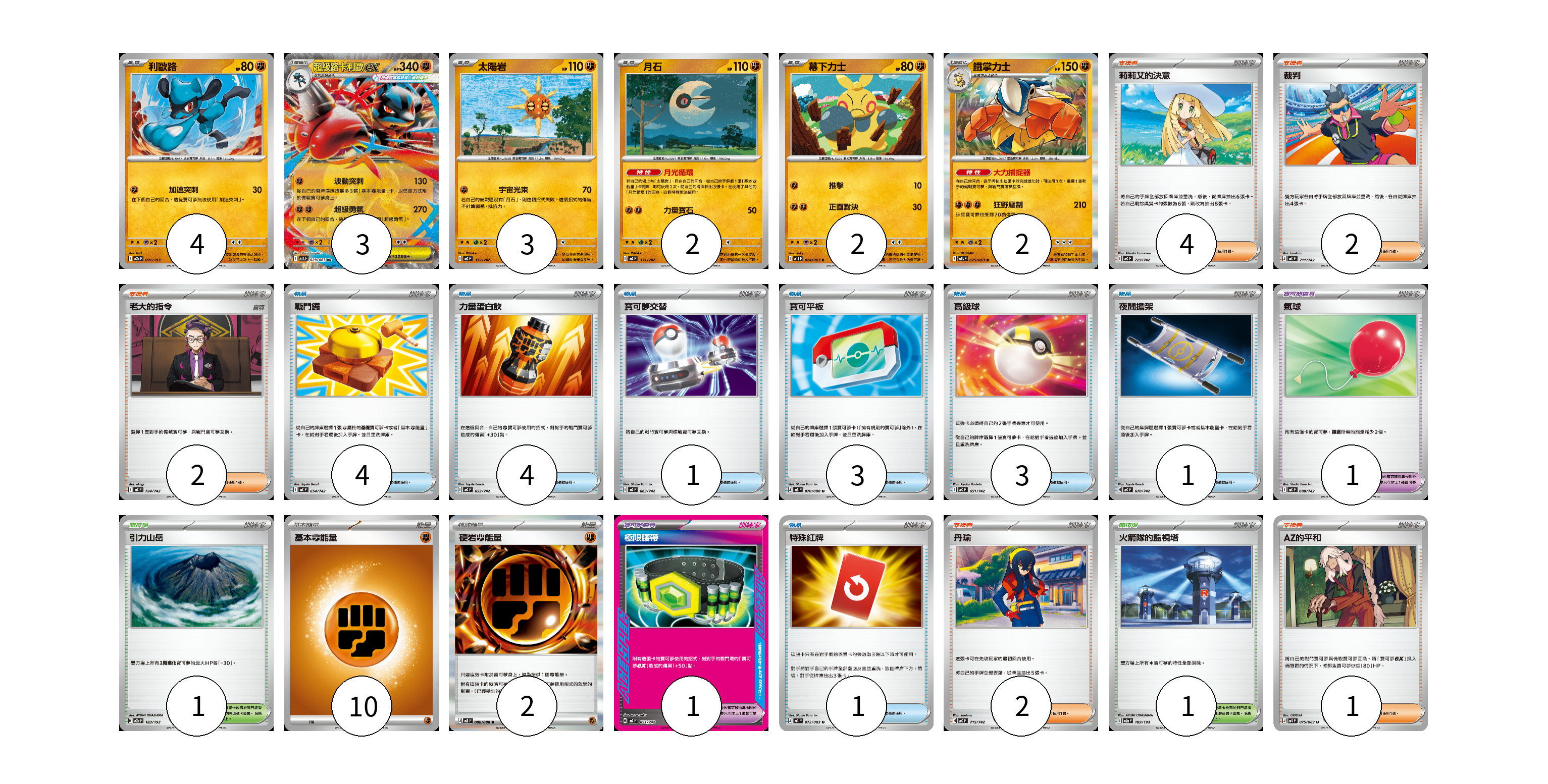牌組構築方案 以此牌組為基礎新構築牌組 顯示卡面 顯示列表 寶可夢卡(16) 4 3 3 2 2 2 寶可夢道具(2) 1 1 物品卡(17) 4 4 1 3 3 1 1 支援者卡(11) 4 2 2 2 1 競技場卡(2) 1 1 能量卡(12) 10 2 寶可夢卡(16) 卡牌名稱 張數 卡牌名稱 張數 利歐路 M2a 091/193 04 超級路卡利歐ex M1L 029/063 03 太陽岩 MC 372/742 03 月石 MC 371/742 02 幕下力士 M1L 024/063 02 鐵掌力士 M1L 025/063 02 寶可夢道具(2) 卡牌名稱 張數 卡牌名稱 張數 氣球 MC 688/742 01 極限腰帶 MC 691/742 01 物品卡(17) 卡牌名稱 張數 卡牌名稱 張數 戰鬥鑼 MC 654/742 04 力量蛋白飲 MC 652/742 04 寶可夢交替 MC 663/742 01 寶可平板 M3 070/080 03 高級球 MC 651/742 03 夜間擔架 MC 670/742 01 特殊紅牌 M4 072/083 01 支援者卡(11) 卡牌名稱 張數 卡牌名稱 張數 莉莉艾的決意 MC 729/742 04 裁判 MC 711/742 02 老大的指令 MC 724/742 02 丹瑜 MC 715/742 02 AZ的平和 M4 075/083 01 競技場卡(2) 卡牌名稱 張數 卡牌名稱 張數 引力山岳 M2a 183/193 01 火箭隊的監視塔 M2a 189/193 01 能量卡(12) 卡牌名稱 張數 卡牌名稱 張數 基本【鬥】能量 MC FIG 10 硬岩【鬥】能量 M3 080/080 02 以此牌組為基礎新構築牌組 牌組編碼 hoYrgh-XLerPN-ykwdDV copy 列印牌組單 牌組編碼已複製 分享至SNS
