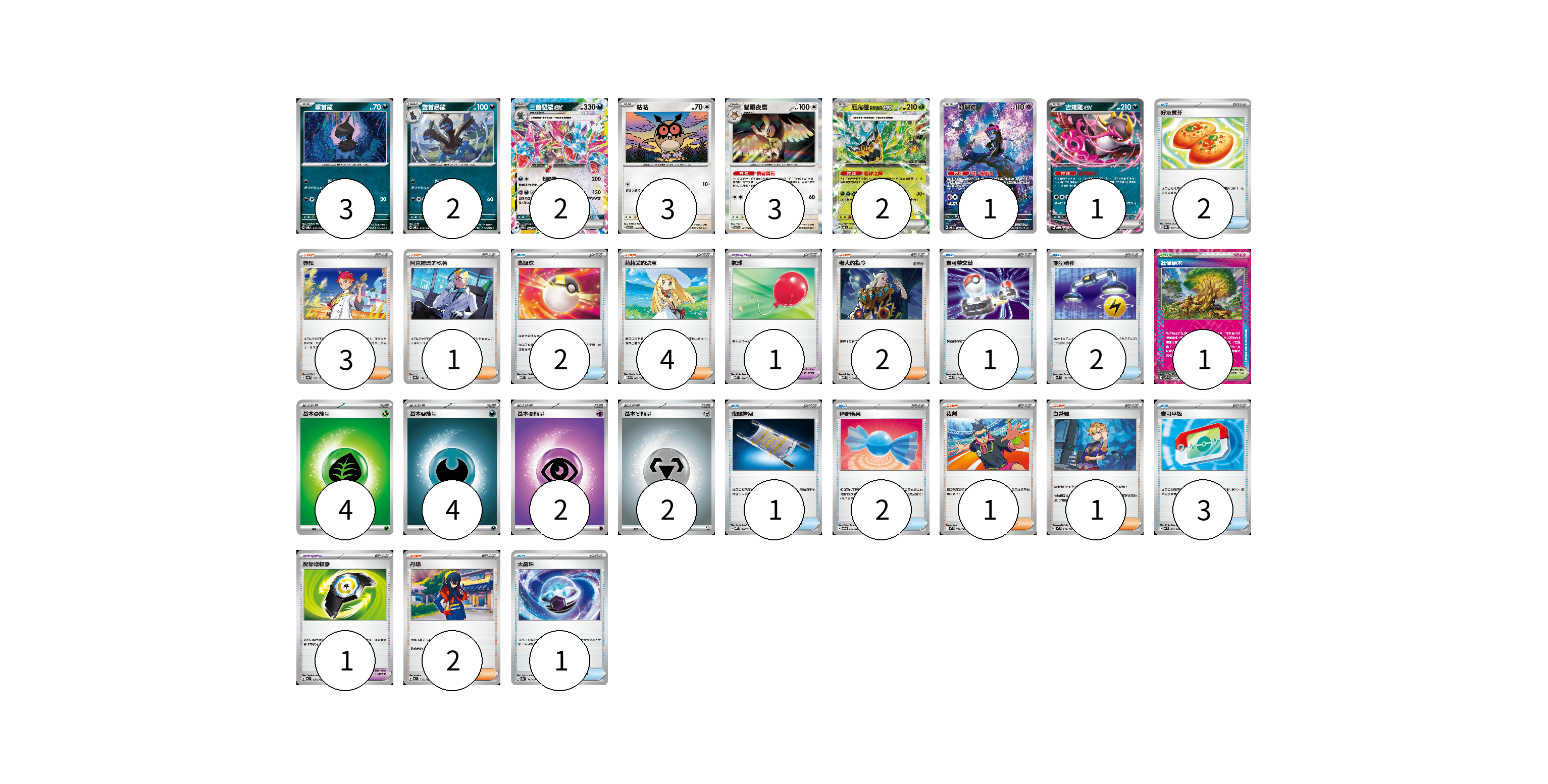 牌組構築方案 以此牌組為基礎新構築牌組 顯示卡面 顯示列表 寶可夢卡(17) 3 2 2 3 3 2 1 1 寶可夢道具(2) 1 1 物品卡(14) 2 2 1 2 1 2 3 1 支援者卡(14) 3 1 4 2 1 1 2 競技場卡(1) 1 能量卡(12) 4 4 2 2 寶可夢卡(17) 卡牌名稱 張數 卡牌名稱 張數 單首龍 SV8 070/106 03 雙首暴龍 SV8 071/106 02 三首惡龍ex SV8 072/106 02 咕咕 SV7 076/102 03 貓頭夜鷹 SV7 077/102 03 厄鬼椪 碧草面具ex SV6 016/101 02 願增猿 SV6 107/101 01 吉雉雞ex SVOD 004/020 01 寶可夢道具(2) 卡牌名稱 張數 卡牌名稱 張數 氣球 MBD 018/022 01 反擊增幅器 MC 679/742 01 物品卡(14) 卡牌名稱 張數 卡牌名稱 張數 好友寶芬 SV8a 147/187 02 高級球 MBD 014/022 02 寶可夢交替 SVQL 016/022 01 能量轉移 SVM 127/175 02 夜間擔架 MBD 016/022 01 神奇糖果 SVOD 013/020 02 寶可平板 MC 662/742 03 太晶珠 SV8a 145/187 01 支援者卡(14) 卡牌名稱 張數 卡牌名稱 張數 赤松 SV8a 163/187 03 阿克羅瑪的執著 SV8a 164/187 01 莉莉艾的決意 M1L 062/063 04 老大的指令 MBD 020/022 02 裁判 MC 711/742 01 白蕾雅 MC 722/742 01 丹瑜 MC 715/742 02 競技場卡(1) 卡牌名稱 張數 卡牌名稱 張數 壯偉碩木 SV7 101/102 01 能量卡(12) 卡牌名稱 張數 卡牌名稱 張數 基本【草】能量 M-P GRA 04 基本【惡】能量 MBG DAR 04 基本【超】能量 MBD PSY 02 基本【鋼】能量 M-P MET 02 以此牌組為基礎新構築牌組 牌組編碼 hpDlsP-TJTdhG-lHfPDI copy 列印牌組單 牌組編碼已複製 分享至SNS
