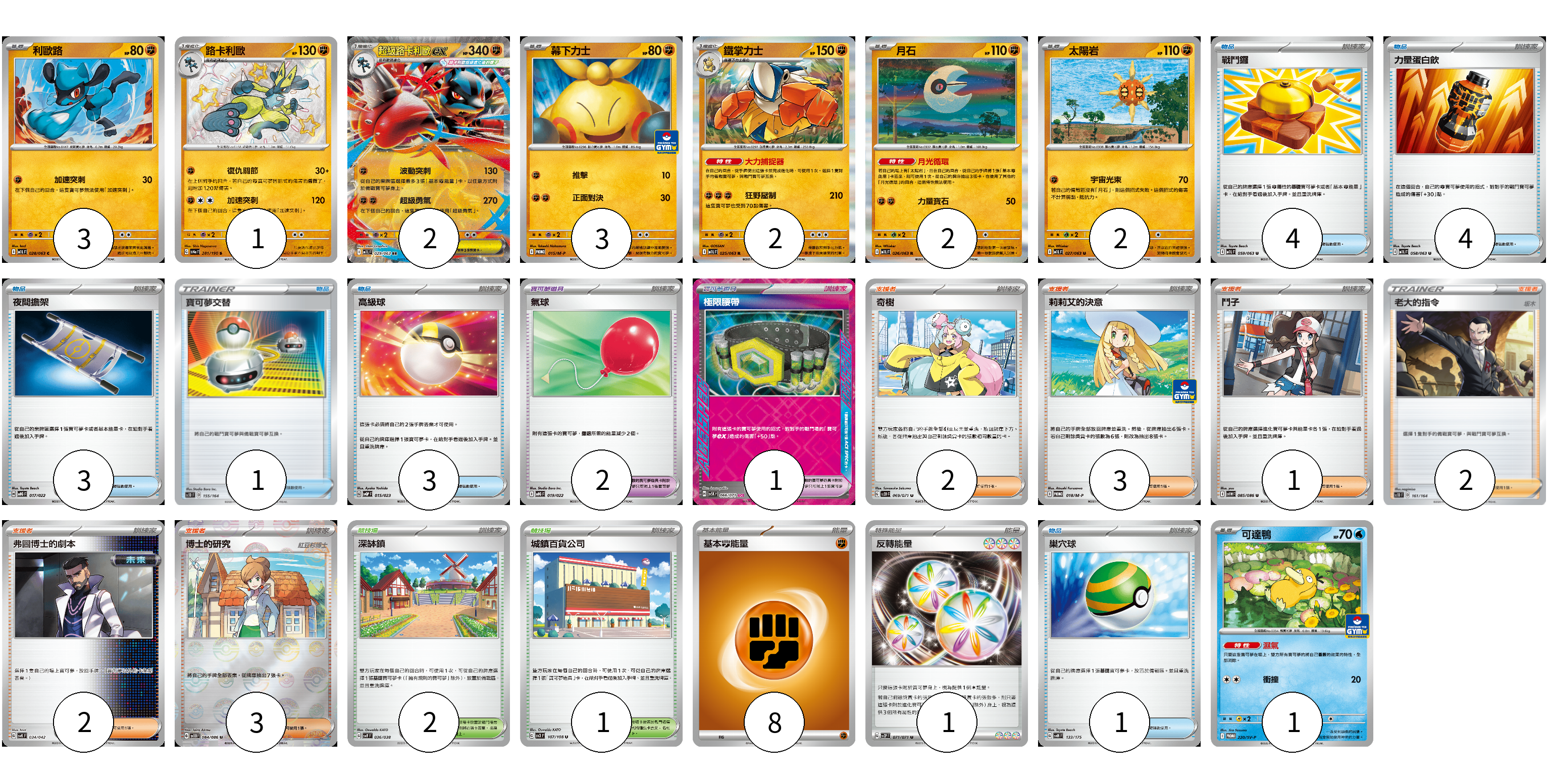牌組構築方案 以此牌組為基礎新構築牌組 顯示卡面 顯示列表 寶可夢卡(16) 3 1 2 3 2 2 2 1 寶可夢道具(3) 2 1 物品卡(16) 4 4 3 1 3 1 支援者卡(13) 2 3 1 2 2 3 競技場卡(3) 2 1 能量卡(9) 8 1 寶可夢卡(16) 卡牌名稱 張數 卡牌名稱 張數 利歐路 M1L 028/063 03 路卡利歐 SV4a 281/190 01 超級路卡利歐ex M1L 029/063 02 幕下力士 M-P 015/M-P 03 鐵掌力士 M1L 025/063 02 月石 M1L 026/063 02 太陽岩 M1L 027/063 02 可達鴨 SV-P 220/SV-P 01 寶可夢道具(3) 卡牌名稱 張數 卡牌名稱 張數 氣球 MBG 019/022 02 極限腰帶 SV5K 066/071 01 物品卡(16) 卡牌名稱 張數 卡牌名稱 張數 戰鬥鑼 M1L 059/063 04 力量蛋白飲 M1L 058/063 04 夜間擔架 MBG 017/022 03 寶可夢交替 SC1D 155/164 01 高級球 SVQP 015/023 03 巢穴球 SVM 133/175 01 支援者卡(13) 卡牌名稱 張數 卡牌名稱 張數 奇樹 SV2D 069/071 02 莉莉艾的決意 M-P 018/M-P 03 鬥子 SV11W 085/086 01 老大的指令(坂木) SC1D 161/164 02 弗圖博士的劇本 SVK 034/042 02 博士的研究 SV11B 084/086 03 競技場卡(3) 卡牌名稱 張數 卡牌名稱 張數 深缽鎮 SVF 036/038 02 城鎮百貨公司 SV3 107/108 01 能量卡(9) 卡牌名稱 張數 卡牌名稱 張數 基本【鬥】能量 SVAM FIG 08 反轉能量 SV2P 071/071 01 以此牌組為基礎新構築牌組 牌組編碼 hpXYhA-wNPlQV-OJvKGO copy 列印牌組單 牌組編碼已複製 分享至SNS