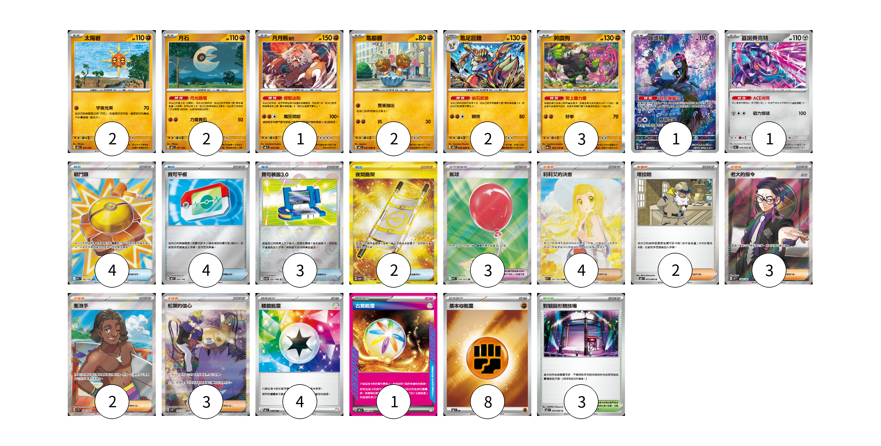 牌組構築方案 以此牌組為基礎新構築牌組 顯示卡面 顯示列表 寶可夢卡(14) 2 2 1 2 2 3 1 1 寶可夢道具(3) 3 物品卡(13) 4 4 3 2 支援者卡(14) 4 2 3 2 3 競技場卡(3) 3 能量卡(13) 4 1 8 寶可夢卡(14) 卡牌名稱 張數 卡牌名稱 張數 太陽岩 MC 372/742 02 月石 MC 371/742 02 月月熊 赫月 MC 415/742 01 龜腳腳 M3 041/080 02 龜足巨鎧 M3 042/080 02 夠讚狗 SV6 064/101 03 願增猿 SV6 107/101 01 蓋諾賽克特 SV6a 040/064 01 寶可夢道具(3) 卡牌名稱 張數 卡牌名稱 張數 氣球 M1L 084/063 03 物品卡(13) 卡牌名稱 張數 卡牌名稱 張數 戰鬥鑼 M1L 082/063 04 寶可平板 MC 662/742 04 寶可裝置3.0 SV11B 081/086 03 夜間擔架 SV8 137/106 02 支援者卡(14) 卡牌名稱 張數 卡牌名稱 張數 莉莉艾的決意 M1L 091/063 04 塔拉剛 M3 073/080 02 老大的指令(烏羽) MC 760/742 03 衝浪手 SV7a 084/064 02 松葉的信心 SV5K 097/071 03 競技場卡(3) 卡牌名稱 張數 卡牌名稱 張數 對戰圓形競技場 M2 079/080 03 能量卡(13) 卡牌名稱 張數 卡牌名稱 張數 稜鏡能量 MC 739/742 04 古舊能量 MC 741/742 01 基本【鬥】能量 MC FIG 08 以此牌組為基礎新構築牌組 牌組編碼 hpsfPL-Ibzwxb-neRkHS copy 列印牌組單 牌組編碼已複製 分享至SNS