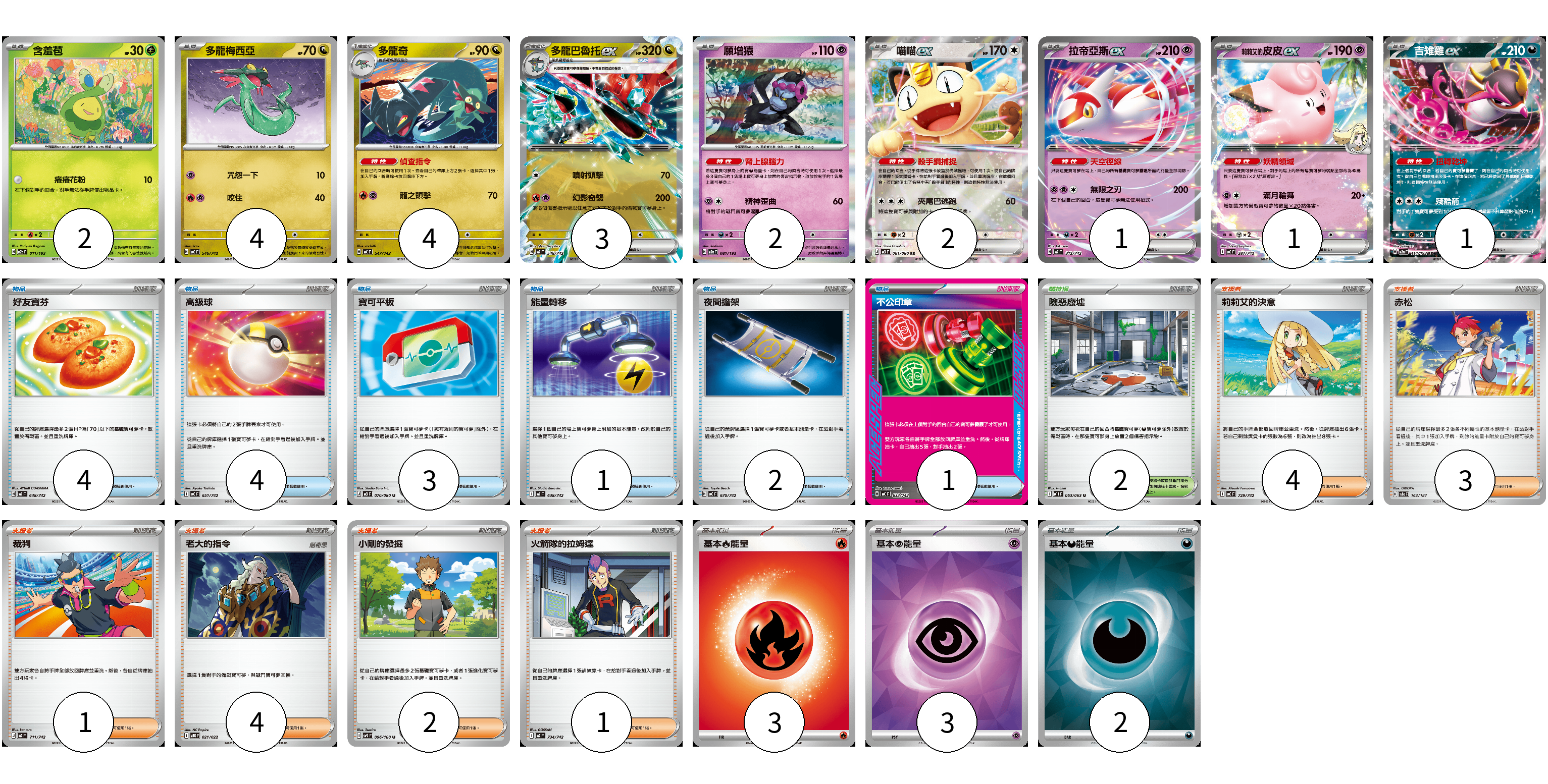 牌組構築方案 以此牌組為基礎新構築牌組 顯示卡面 顯示列表 寶可夢卡(20) 2 4 4 3 2 2 1 1 1 物品卡(15) 4 4 3 1 2 1 支援者卡(15) 4 3 1 4 2 1 競技場卡(2) 2 能量卡(8) 3 3 2 寶可夢卡(20) 卡牌名稱 張數 卡牌名稱 張數 含羞苞 M2a 011/193 02 多龍梅西亞 MC 546/742 04 多龍奇 MC 547/742 04 多龍巴魯托ex MC 548/742 03 願增猿 M2a 081/193 02 喵喵ex M3 061/080 02 拉帝亞斯ex MC 312/742 01 <莉莉艾的>皮皮ex MC 287/742 01 吉雉雞ex M2a 114/193 01 物品卡(15) 卡牌名稱 張數 卡牌名稱 張數 好友寶芬 MC 648/742 04 高級球 MC 651/742 04 寶可平板 M3 070/080 03 能量轉移 MC 638/742 01 夜間擔架 MC 670/742 02 不公印章 MC 633/742 01 支援者卡(15) 卡牌名稱 張數 卡牌名稱 張數 莉莉艾的決意 MC 729/742 04 赤松 SV8a 163/187 03 裁判 MC 711/742 01 老大的指令 MBG 021/022 04 小剛的發掘 SV9 096/100 02 火箭隊的拉姆達 MC 734/742 01 競技場卡(2) 卡牌名稱 張數 卡牌名稱 張數 險惡廢墟 M1L 063/063 02 能量卡(8) 卡牌名稱 張數 卡牌名稱 張數 基本【火】能量 MC FIR 03 基本【超】能量 SVOD PSY 03 基本【惡】能量 SVM DAR 02 以此牌組為基礎新構築牌組 牌組編碼 hqxKFZ-gnBDzx-IvtdDB copy 列印牌組單 牌組編碼已複製 分享至SNS
