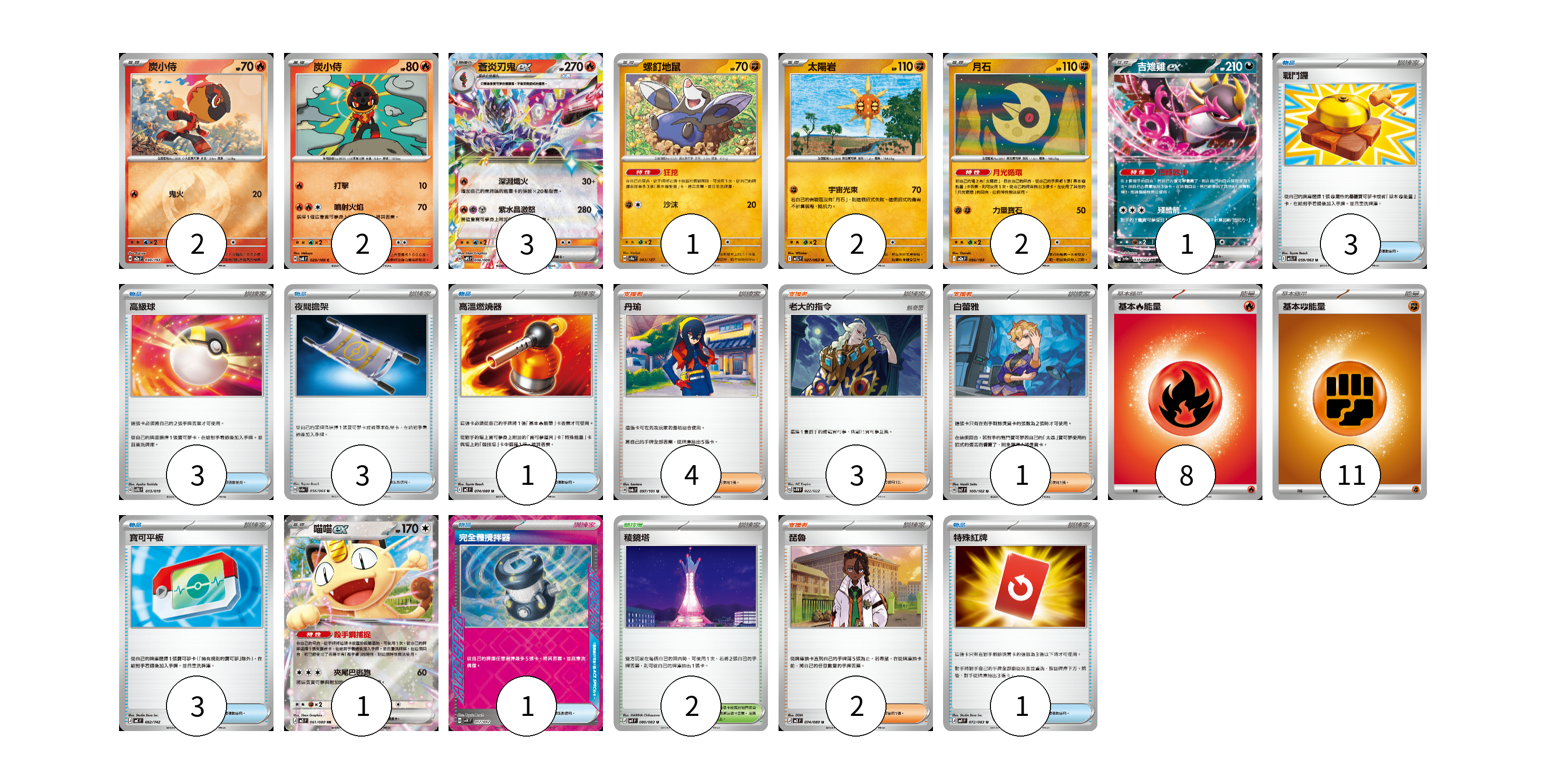 牌組構築方案 以此牌組為基礎新構築牌組 顯示卡面 顯示列表 寶可夢卡(14) 2 2 3 1 2 2 1 1 物品卡(15) 3 3 3 1 3 1 1 支援者卡(10) 4 3 1 2 競技場卡(2) 2 能量卡(19) 8 11 寶可夢卡(14) 卡牌名稱 張數 卡牌名稱 張數 炭小侍 M2a 030/193 02 炭小侍 SV8 020/106 02 蒼炎刃鬼ex SVPS 006/008 03 螺釘地鼠 SV8a 083/187 01 太陽岩 M1L 027/063 02 月石 M2a 086/193 02 吉雉雞ex SV6a 038/064 01 喵喵ex M3 061/080 01 物品卡(15) 卡牌名稱 張數 卡牌名稱 張數 戰鬥鑼 M1L 059/063 03 高級球 SVTG 013/019 03 夜間擔架 SV6a 056/064 03 高溫燃燒器 M2 074/080 01 寶可平板 MC 662/742 03 完全體攪拌器 SVK 017/042 01 特殊紅牌 M4 072/083 01 支援者卡(10) 卡牌名稱 張數 卡牌名稱 張數 丹瑜 SV6 097/101 04 老大的指令 SVHM 022/022 03 白蕾雅 SV7 100/102 01 琵魯 M3 074/080 02 競技場卡(2) 卡牌名稱 張數 卡牌名稱 張數 稜鏡塔 M4 080/083 02 能量卡(19) 卡牌名稱 張數 卡牌名稱 張數 基本【火】能量 M-P FIR 08 基本【鬥】能量 M-P FIG 11 以此牌組為基礎新構築牌組 牌組編碼 hsEmrG-XyoHXq-TdGlFr copy 列印牌組單 牌組編碼已複製 分享至SNS