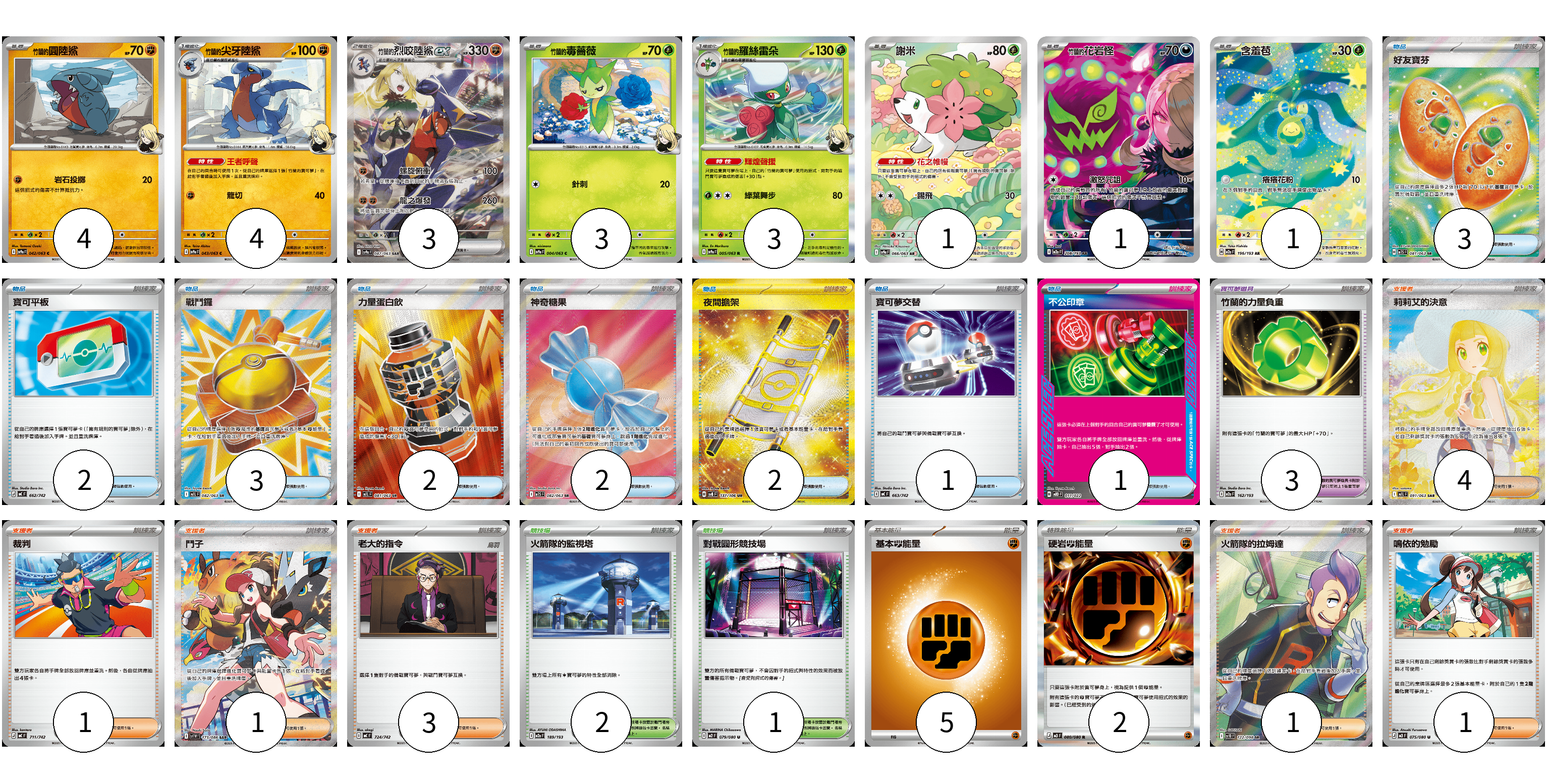 牌組構築方案 以此牌組為基礎新構築牌組 顯示卡面 顯示列表 寶可夢卡(20) 4 4 3 3 3 1 1 1 寶可夢道具(3) 3 物品卡(16) 3 2 3 2 2 2 1 1 支援者卡(11) 4 1 1 3 1 1 競技場卡(3) 2 1 能量卡(7) 5 2 寶可夢卡(20) 卡牌名稱 張數 卡牌名稱 張數 <竹蘭的>圓陸鯊 SV9a 042/063 04 <竹蘭的>尖牙陸鯊 SV9a 043/063 04 <竹蘭的>烈咬陸鯊ex SV9a 087/063 03 <竹蘭的>毒薔薇 SV9a 004/063 03 <竹蘭的>羅絲雷朵 SV9a 005/063 03 謝米 SV9a 066/063 01 <竹蘭的>花岩怪 M2a 208/193 01 含羞苞 M2a 196/193 01 寶可夢道具(3) 卡牌名稱 張數 卡牌名稱 張數 竹蘭的力量負重 M2a 162/193 03 物品卡(16) 卡牌名稱 張數 卡牌名稱 張數 好友寶芬 M1S 081/063 03 寶可平板 MC 662/742 02 戰鬥鑼 M1L 082/063 03 力量蛋白飲 M1L 081/063 02 神奇糖果 M1S 082/063 02 夜間擔架 SV8 137/106 02 寶可夢交替 MC 663/742 01 不公印章 MBD 011/022 01 支援者卡(11) 卡牌名稱 張數 卡牌名稱 張數 莉莉艾的決意 M1L 091/063 04 裁判 MC 711/742 01 鬥子 SV11W 173/086 01 老大的指令 MC 724/742 03 火箭隊的拉姆達 SV10 122/098 01 鳴依的勉勵 M3 075/080 01 競技場卡(3) 卡牌名稱 張數 卡牌名稱 張數 火箭隊的監視塔 M2a 189/193 02 對戰圓形競技場 M2 079/080 01 能量卡(7) 卡牌名稱 張數 卡牌名稱 張數 基本【鬥】能量 MC FIG 05 硬岩【鬥】能量 M3 080/080 02 以此牌組為基礎新構築牌組 牌組編碼 hsYHRG-yKvgOV-jWbpDP copy 列印牌組單 牌組編碼已複製 分享至SNS