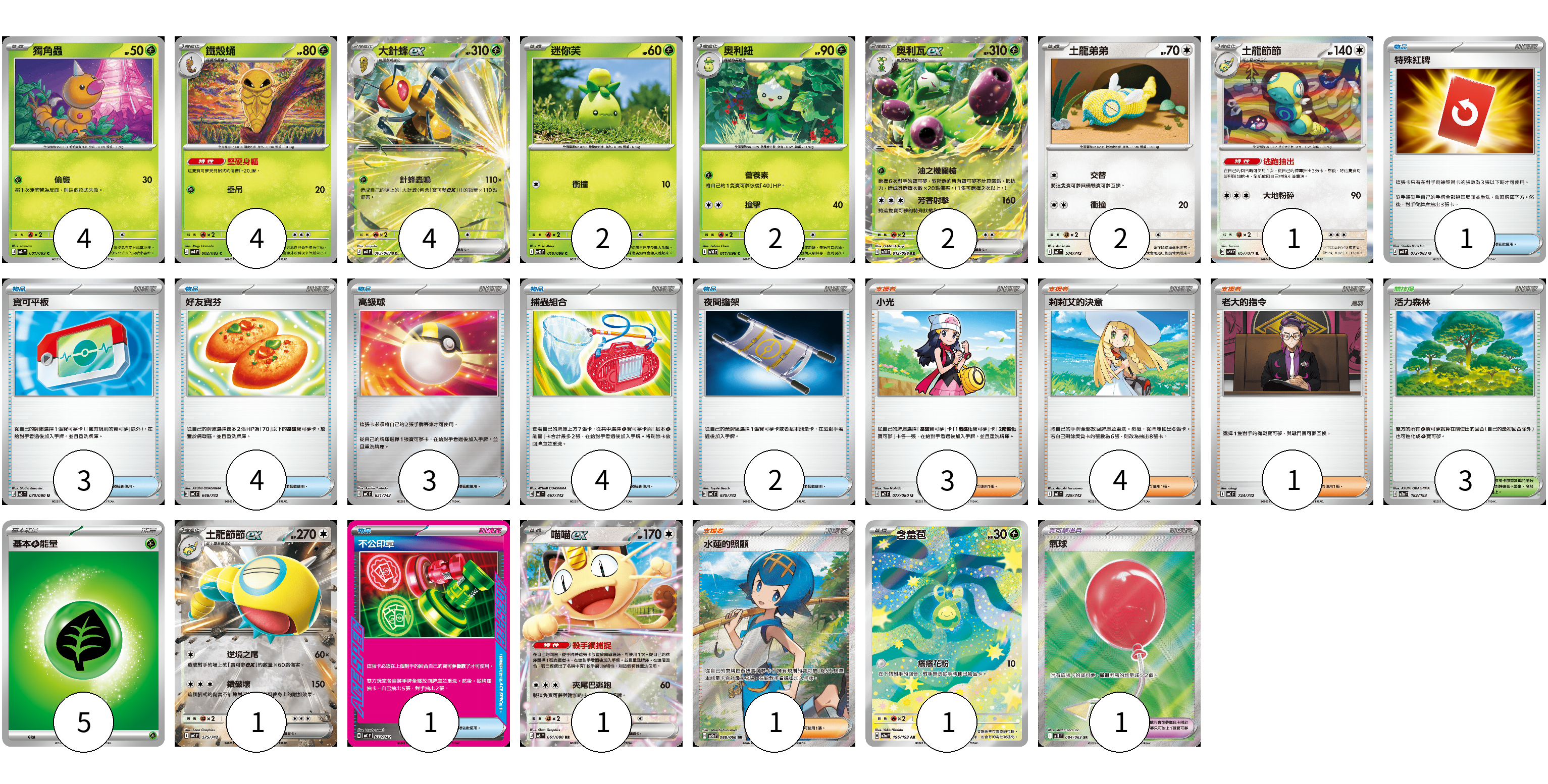 牌組構築方案 以此牌組為基礎新構築牌組 顯示卡面 顯示列表 寶可夢卡(24) 4 4 4 2 2 2 2 1 1 1 1 寶可夢道具(1) 1 物品卡(18) 1 3 4 3 4 2 1 支援者卡(9) 3 4 1 1 競技場卡(3) 3 能量卡(5) 5 寶可夢卡(24) 卡牌名稱 張數 卡牌名稱 張數 獨角蟲 M4 001/083 04 鐵殼蛹 M4 002/083 04 大針蜂ex M4 003/083 04 迷你芙 SV10 010/098 02 奧利紐 SV10 011/098 02 奧利瓦ex SV10 012/098 02 土龍弟弟 MC 574/742 02 土龍節節 SV5K 057/071 01 土龍節節ex MC 575/742 01 喵喵ex M3 061/080 01 含羞苞 M2a 196/193 01 寶可夢道具(1) 卡牌名稱 張數 卡牌名稱 張數 氣球 M1L 084/063 01 物品卡(18) 卡牌名稱 張數 卡牌名稱 張數 特殊紅牌 M4 072/083 01 寶可平板 M3 070/080 03 好友寶芬 MC 648/742 04 高級球 MC 651/742 03 捕蟲組合 MC 667/742 04 夜間擔架 MC 670/742 02 不公印章 MC 633/742 01 支援者卡(9) 卡牌名稱 張數 卡牌名稱 張數 小光 M2 077/080 03 莉莉艾的決意 MC 729/742 04 老大的指令 MC 724/742 01 水蓮的照顧 SV5a 088/066 01 競技場卡(3) 卡牌名稱 張數 卡牌名稱 張數 活力森林 M2a 182/193 03 能量卡(5) 卡牌名稱 張數 卡牌名稱 張數 基本【草】能量 MJ GRA 05 以此牌組為基礎新構築牌組 牌組編碼 hsfjhN-tsERvM-oJWLtt copy 列印牌組單 牌組編碼已複製 分享至SNS